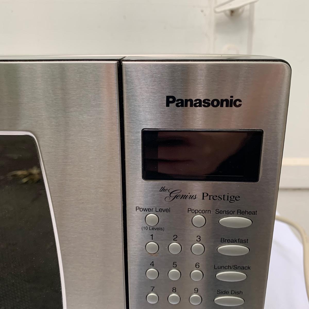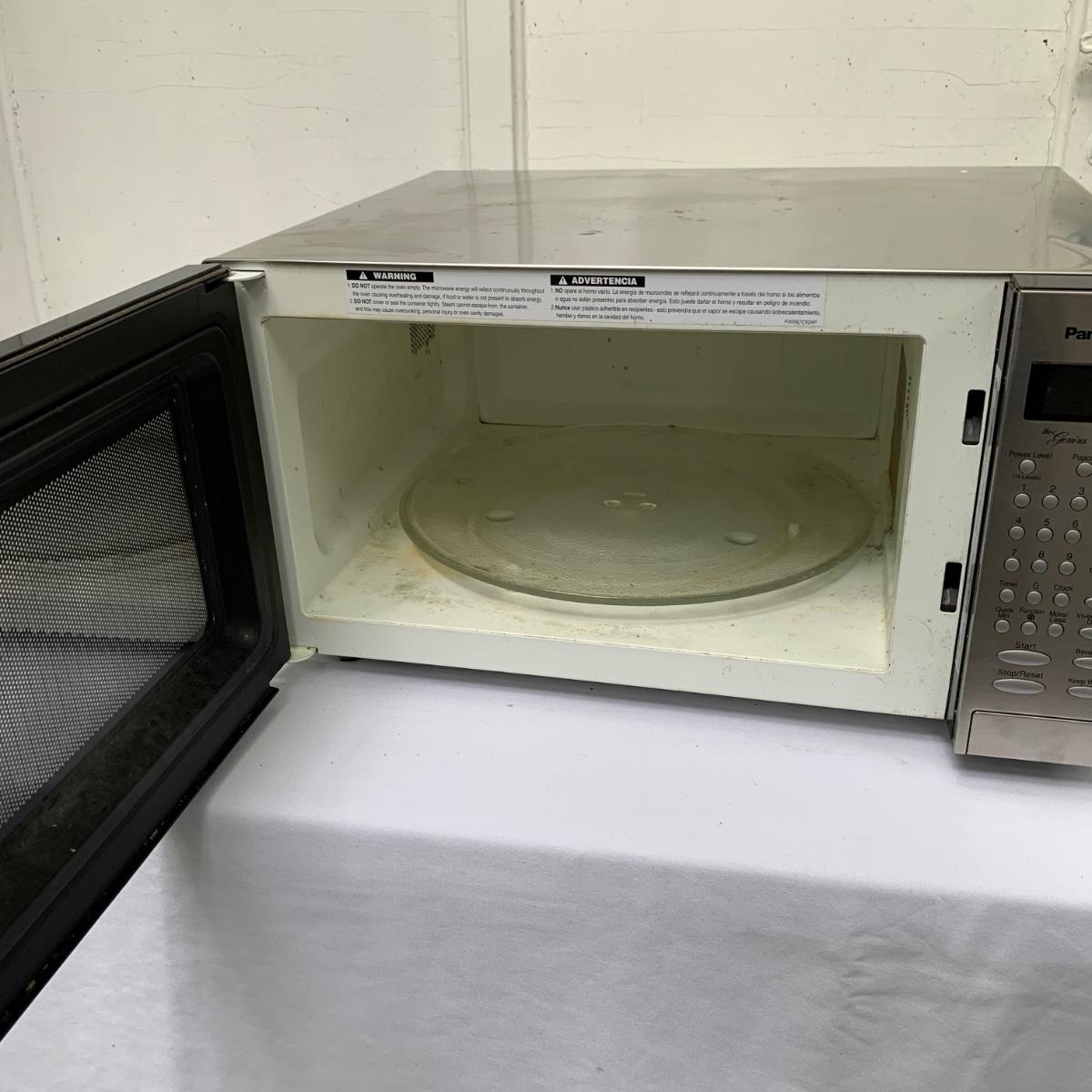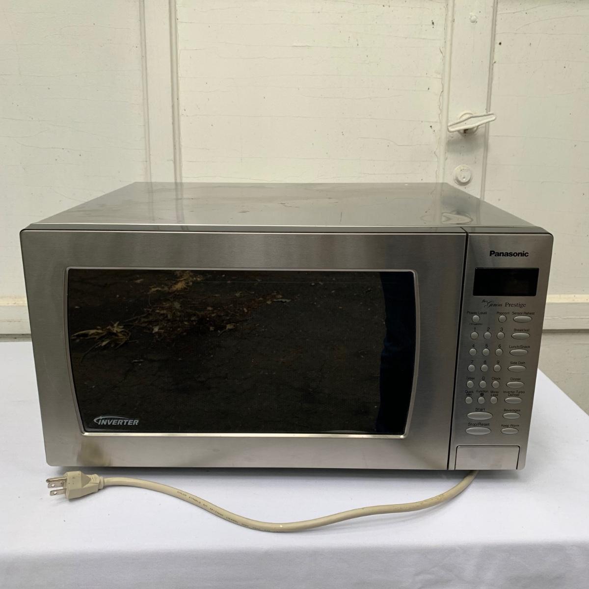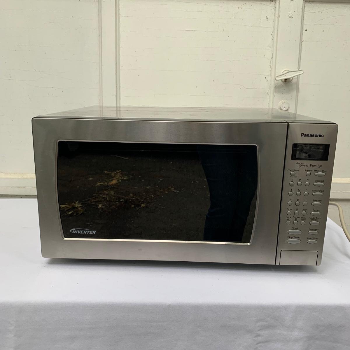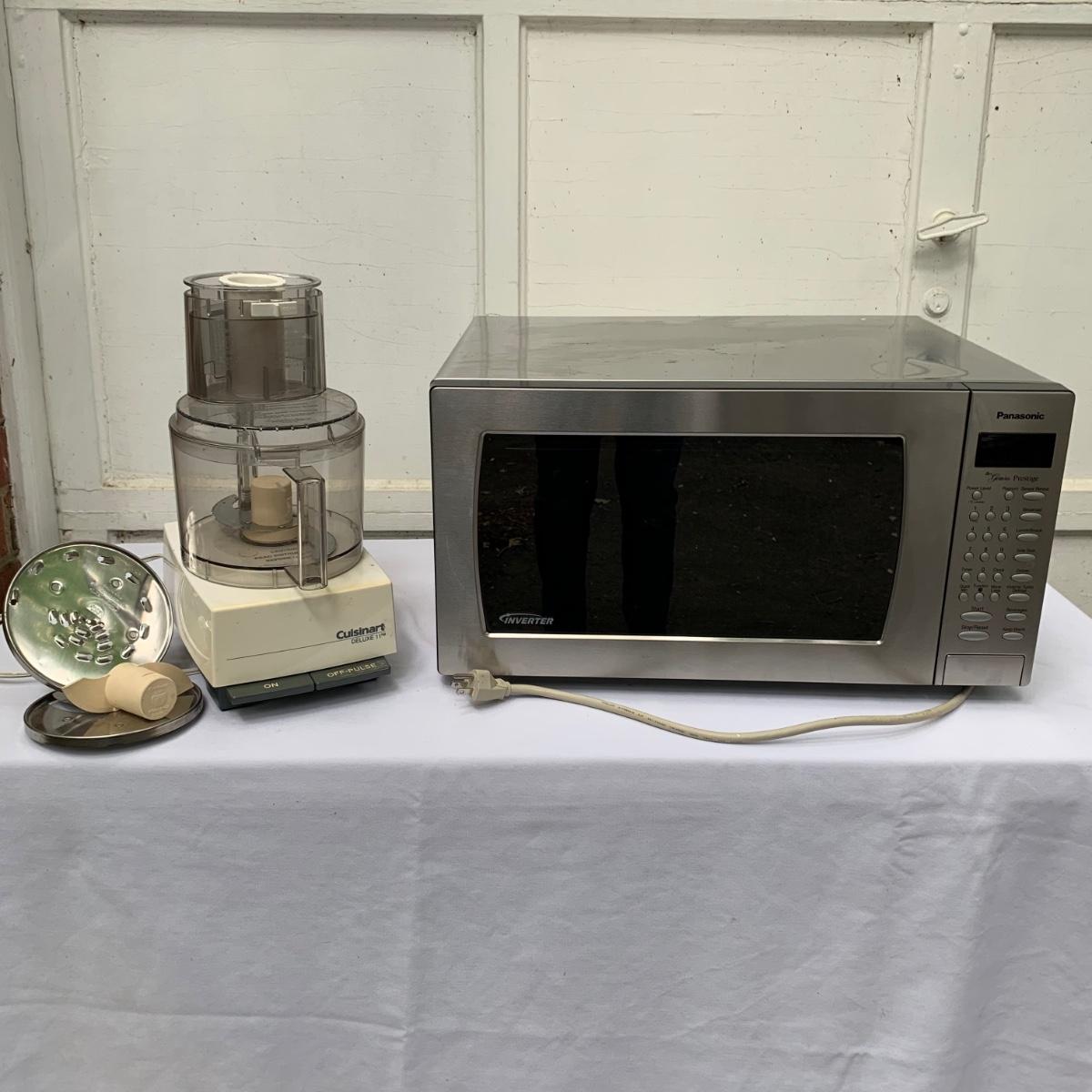 Panasonic Genius Prestige Household Microwave Oven, Model No. NN-SN789S. Functioned when tested. The outer shell is a silver colored metal. It measures 22” x 18” x 11”. The inside needs a deep cleaning. The outside is in good condition structurally, with some small scratches on the surface. It has a three-pronged electric plug. The food processor is a Cuisinart Deluxe 11, Model DFP-11 TX (Type 28). It comes with four different blades. The food processor functioned when tested. It has a two-prong electric plug. Local pickup only.