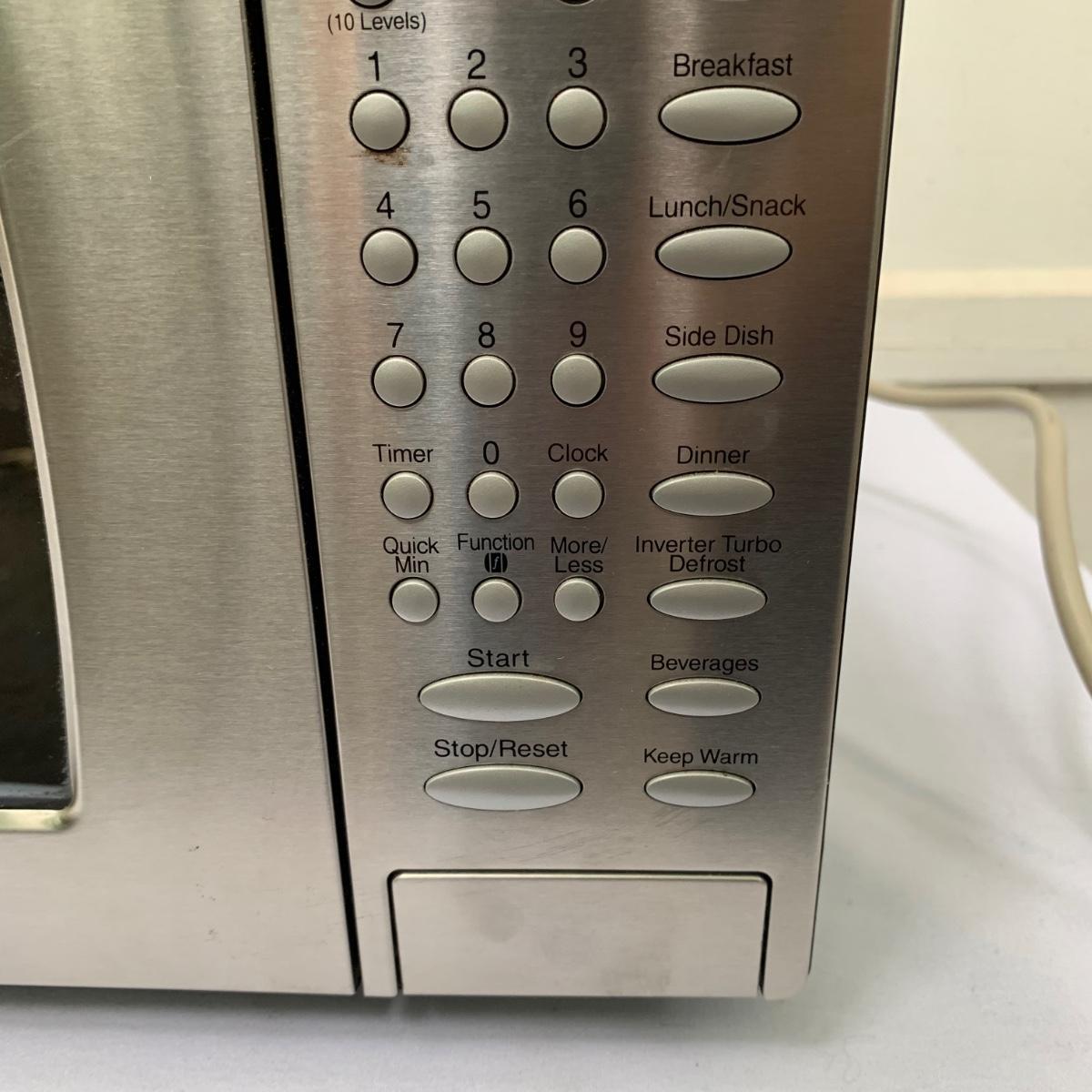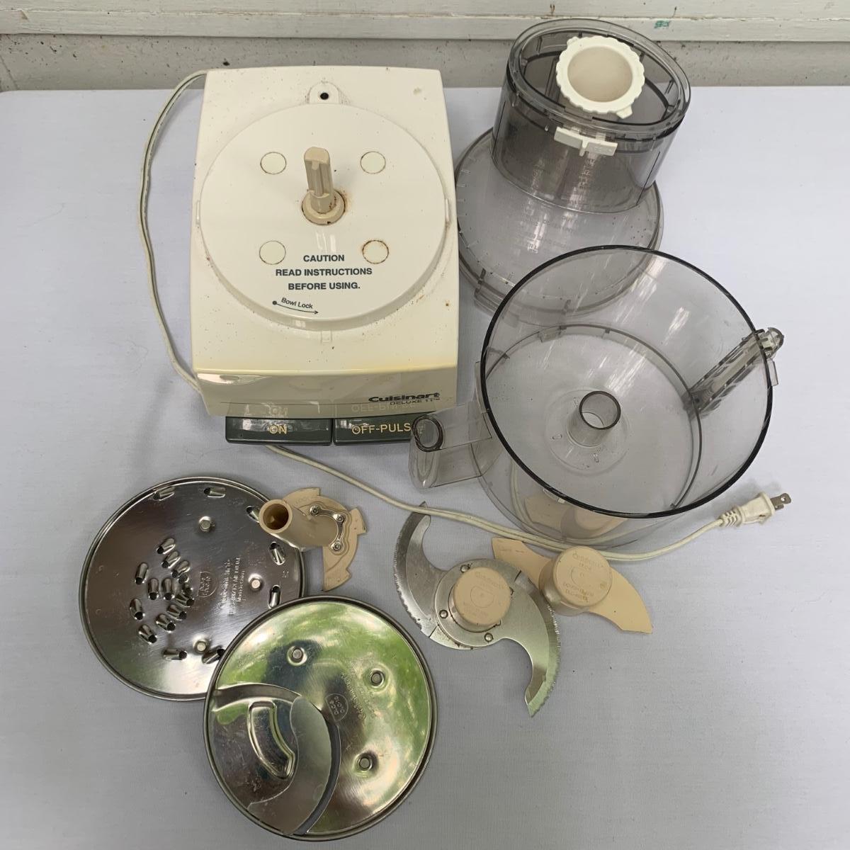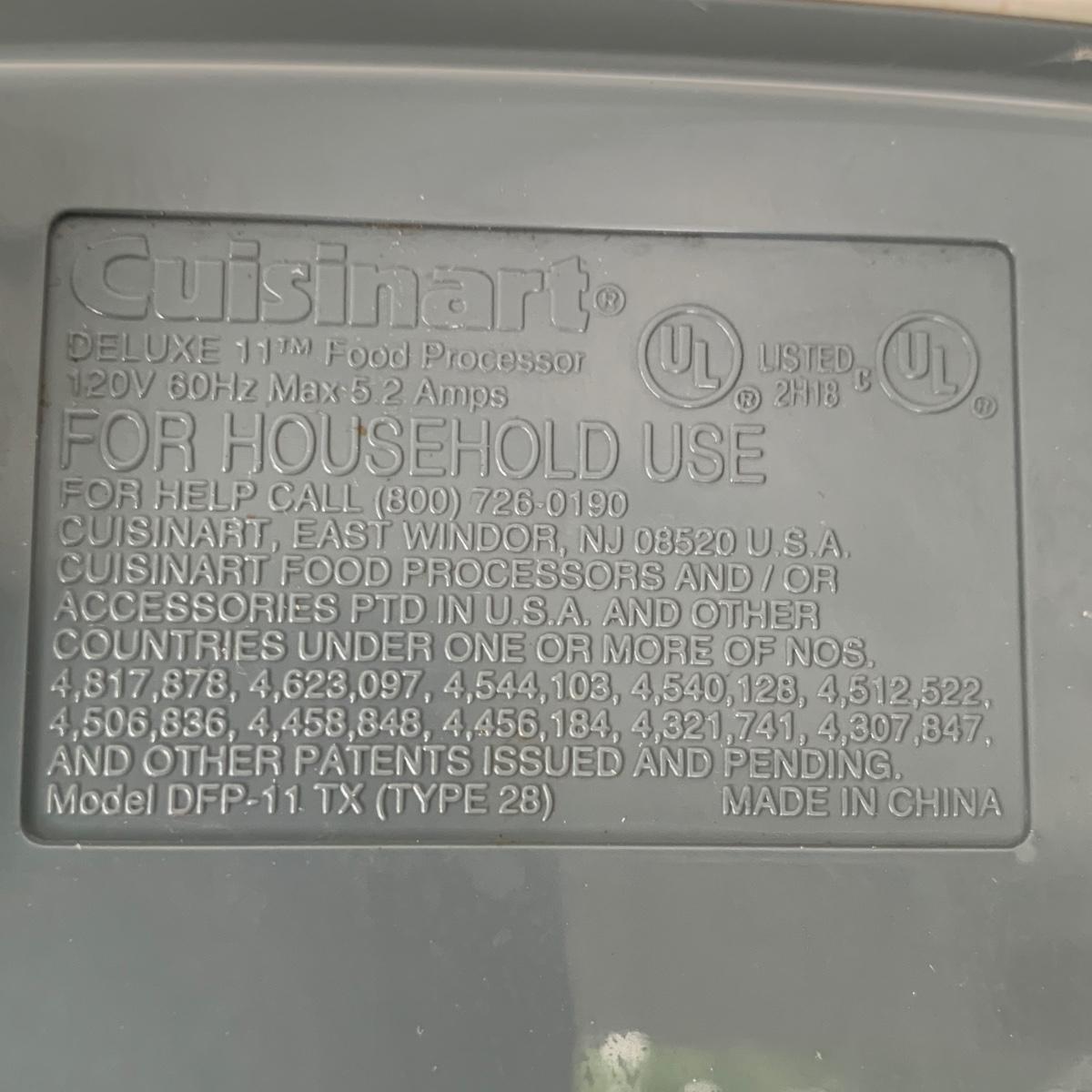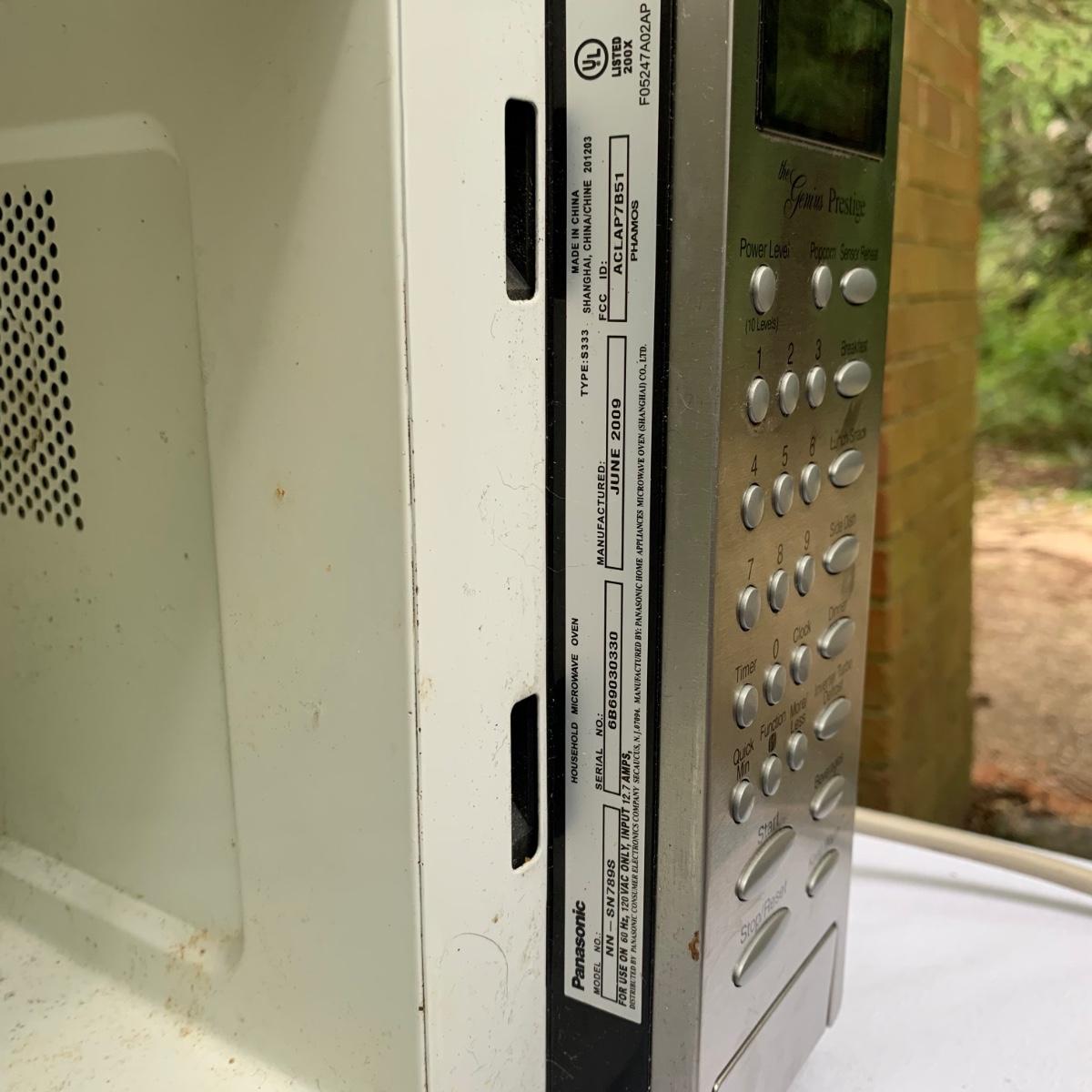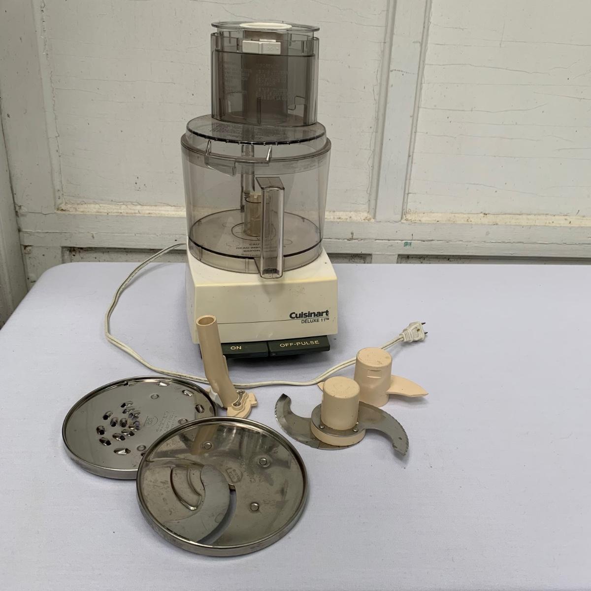 Panasonic Genius Prestige Household Microwave Oven, Model No. NN-SN789S. Functioned when tested. The outer shell is a silver colored metal. It measures 22” x 18” x 11”. The inside needs a deep cleaning. The outside is in good condition structurally, with some small scratches on the surface. It has a three-pronged electric plug. The food processor is a Cuisinart Deluxe 11, Model DFP-11 TX (Type 28). It comes with four different blades. The food processor functioned when tested. It has a two-prong electric plug. Local pickup only.
