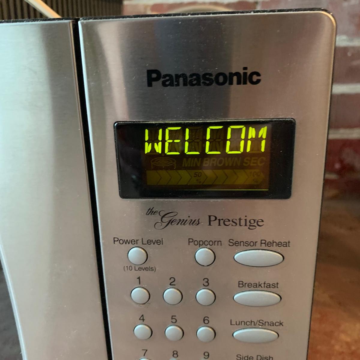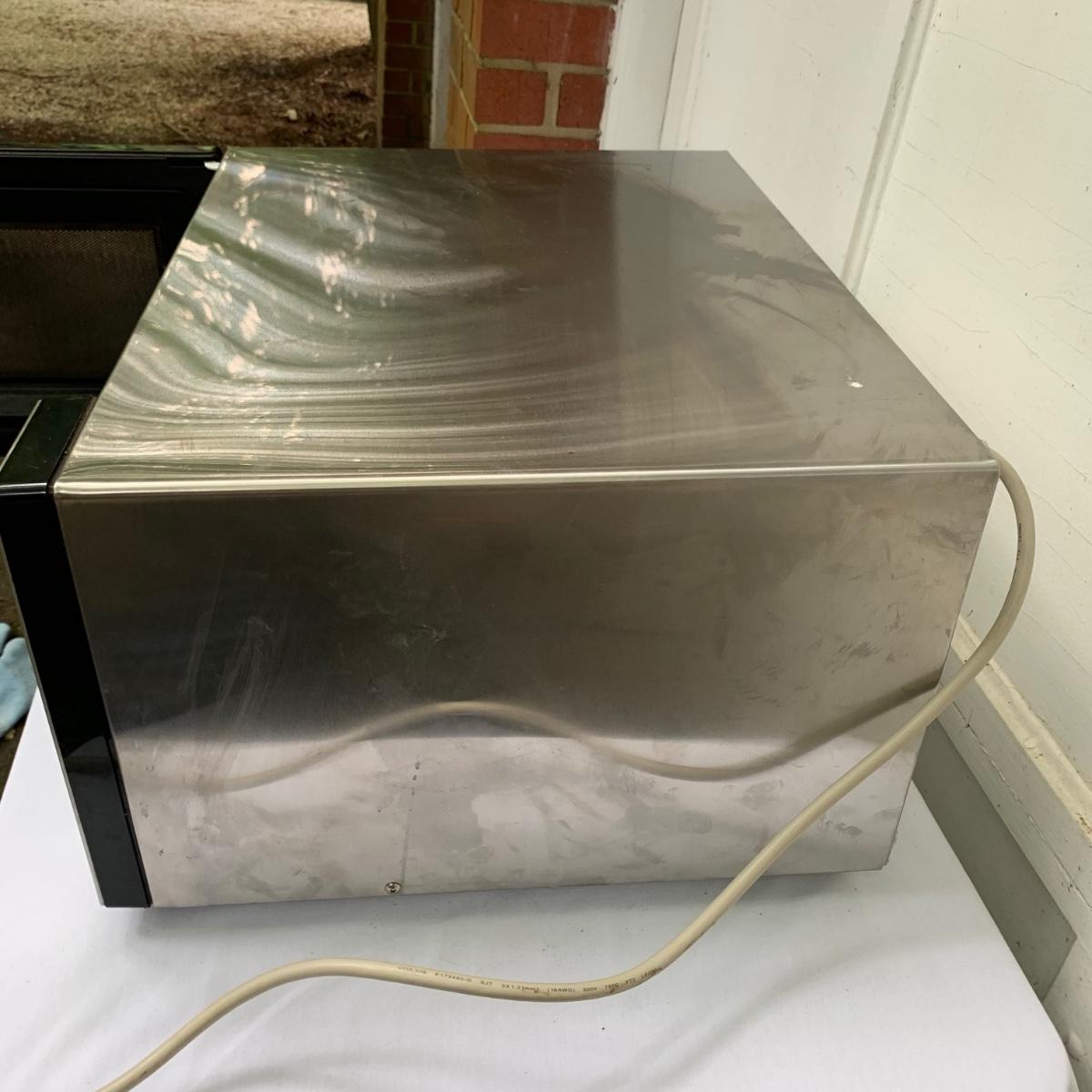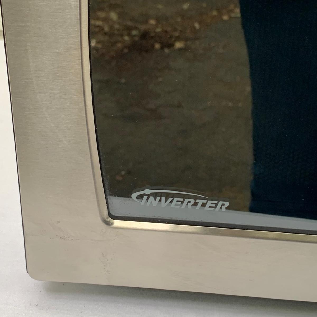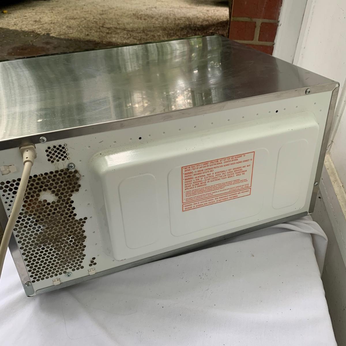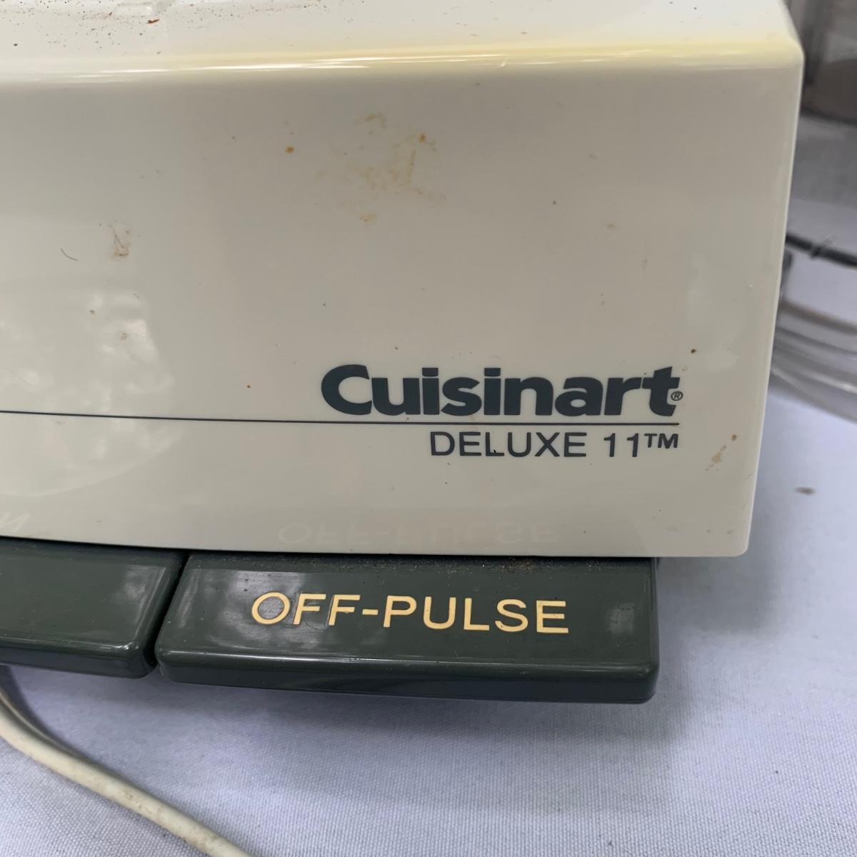 Panasonic Genius Prestige Household Microwave Oven, Model No. NN-SN789S. Functioned when tested. The outer shell is a silver colored metal. It measures 22” x 18” x 11”. The inside needs a deep cleaning. The outside is in good condition structurally, with some small scratches on the surface. It has a three-pronged electric plug. The food processor is a Cuisinart Deluxe 11, Model DFP-11 TX (Type 28). It comes with four different blades. The food processor functioned when tested. It has a two-prong electric plug. Local pickup only.