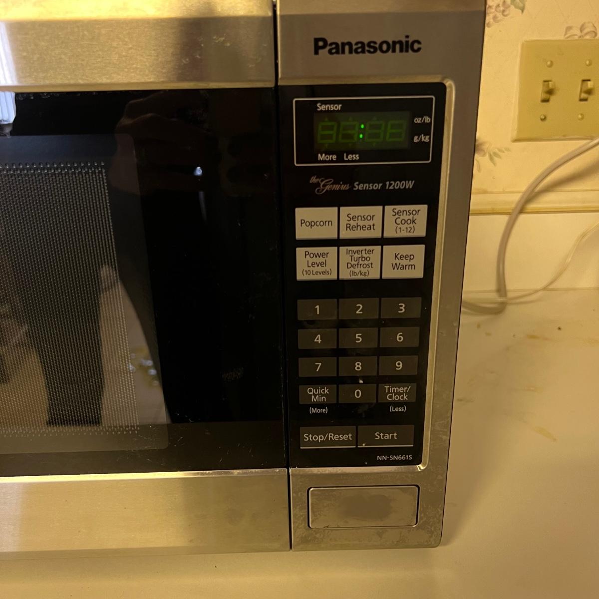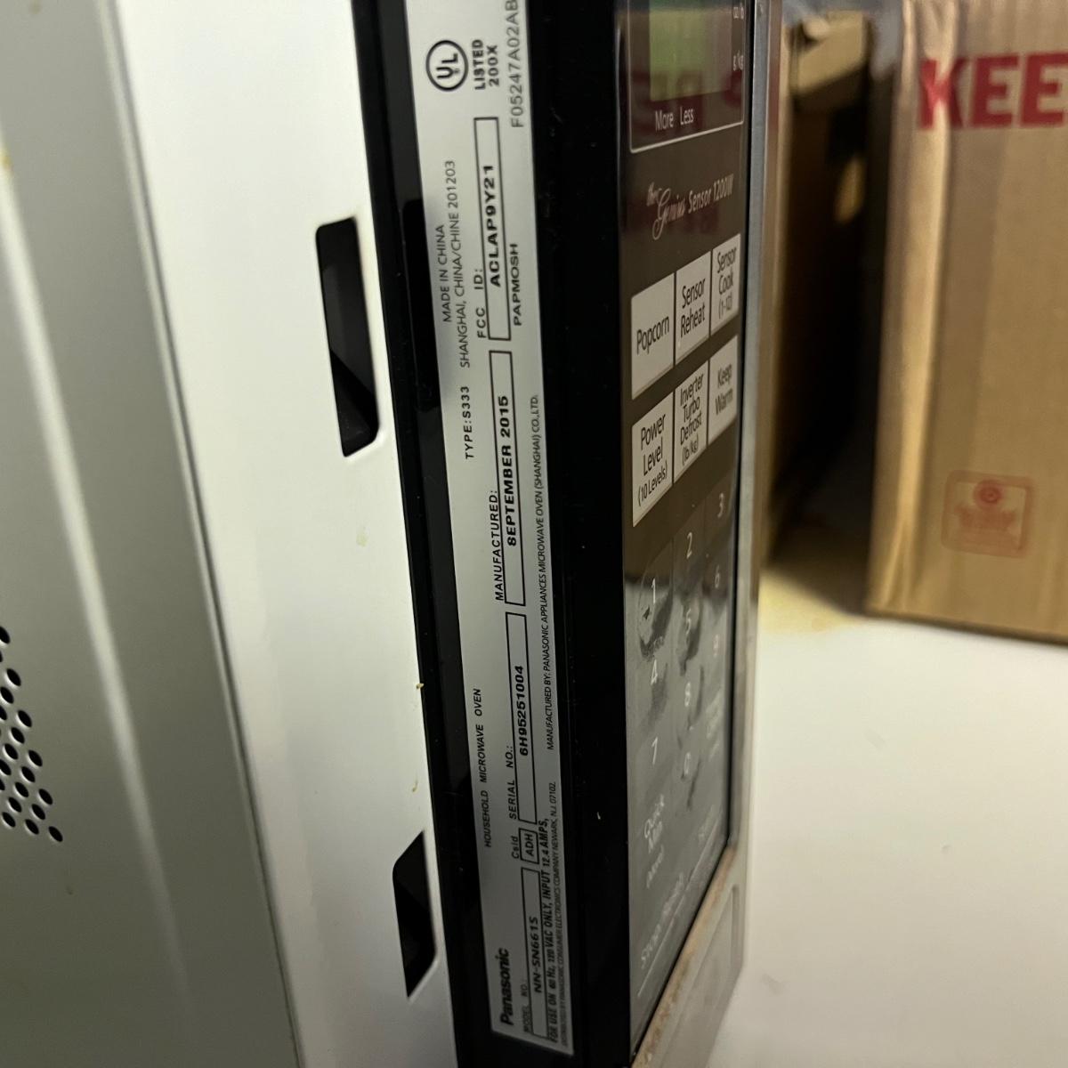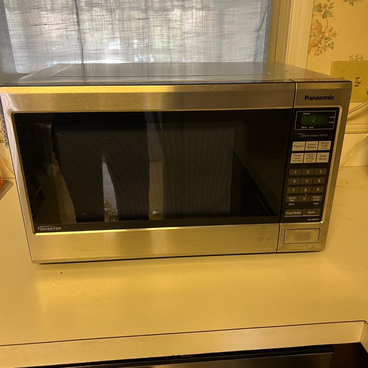 Panasonic inverter microwave oven. Measures 20” x 10” x 12”H. Powered on when plugged in.
