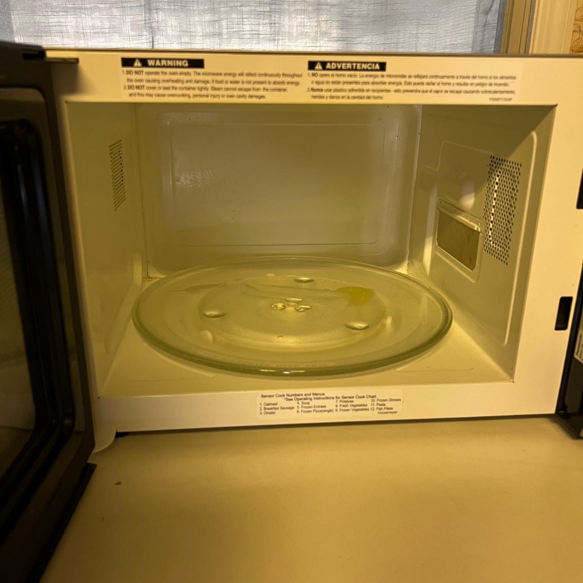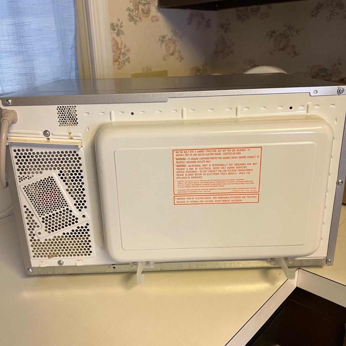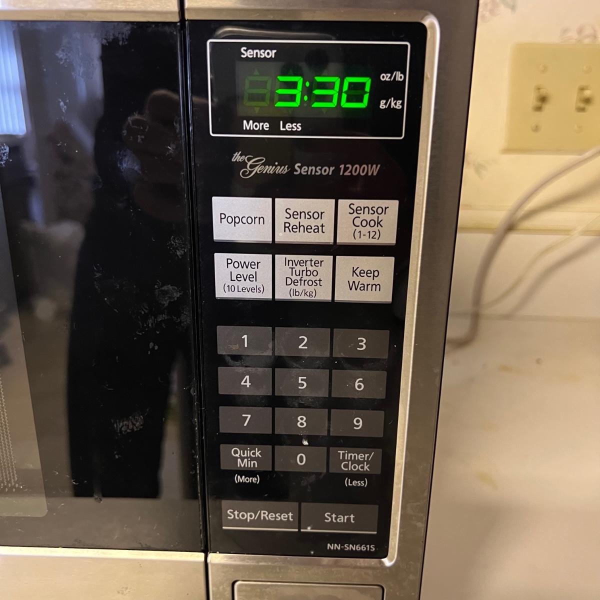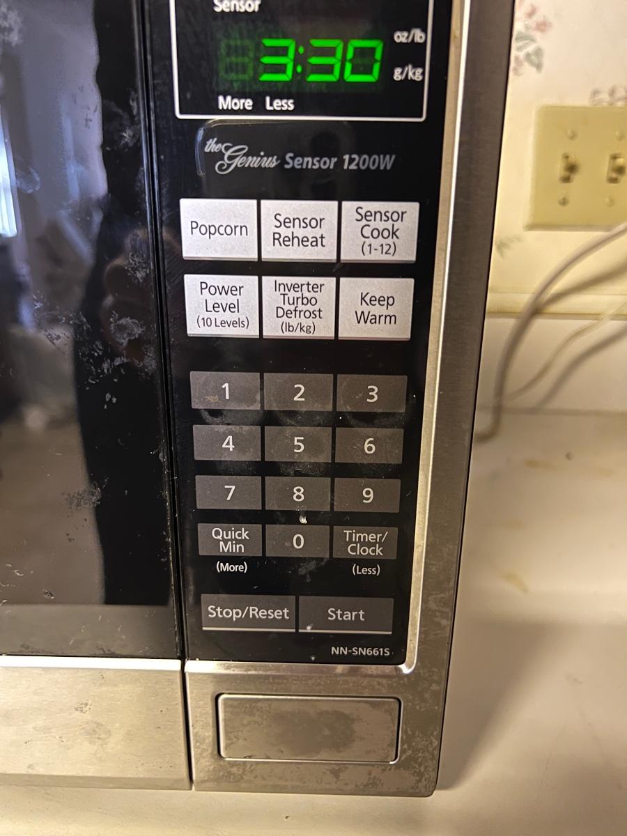 Panasonic inverter microwave oven. Measures 20” x 10” x 12”H. Powered on when plugged in.