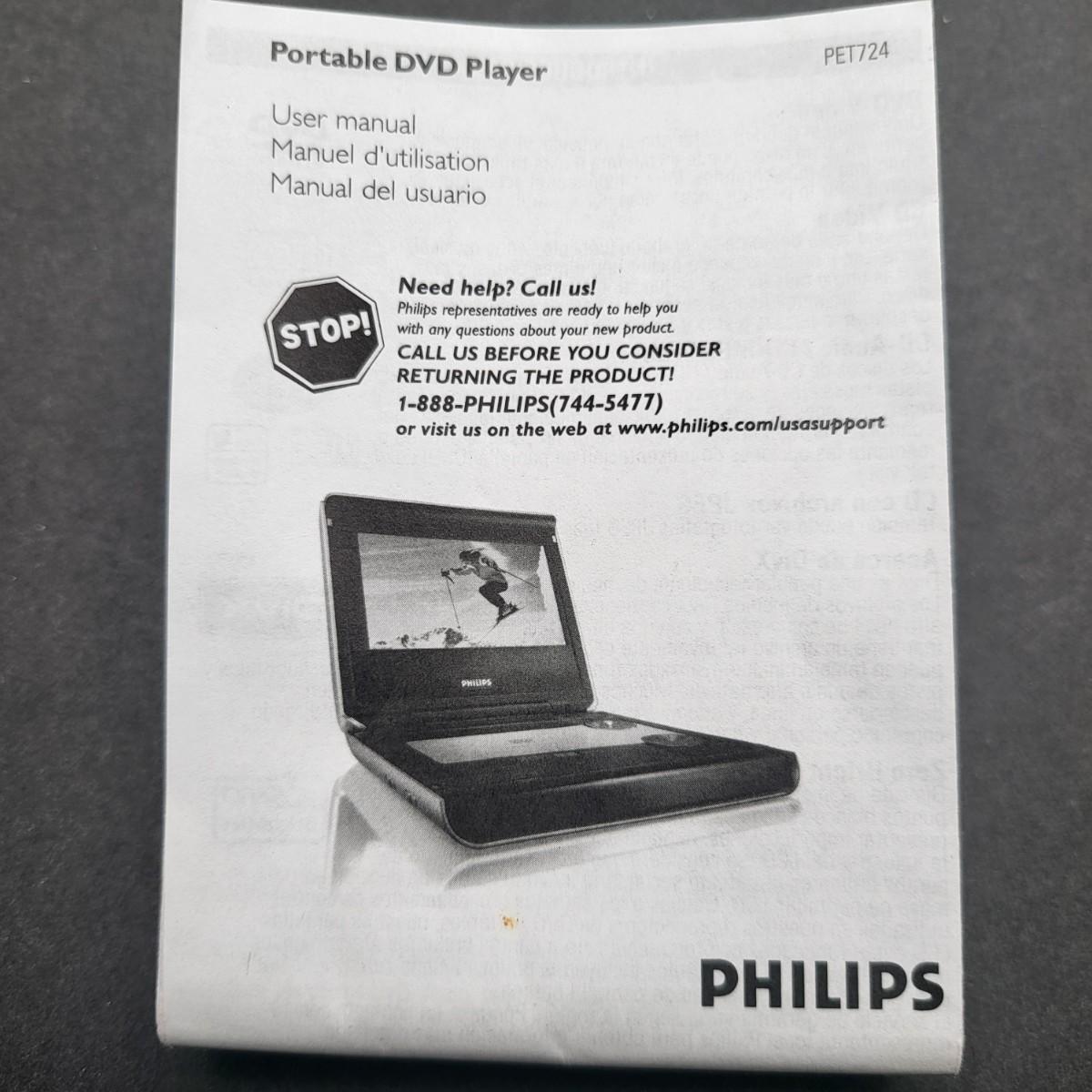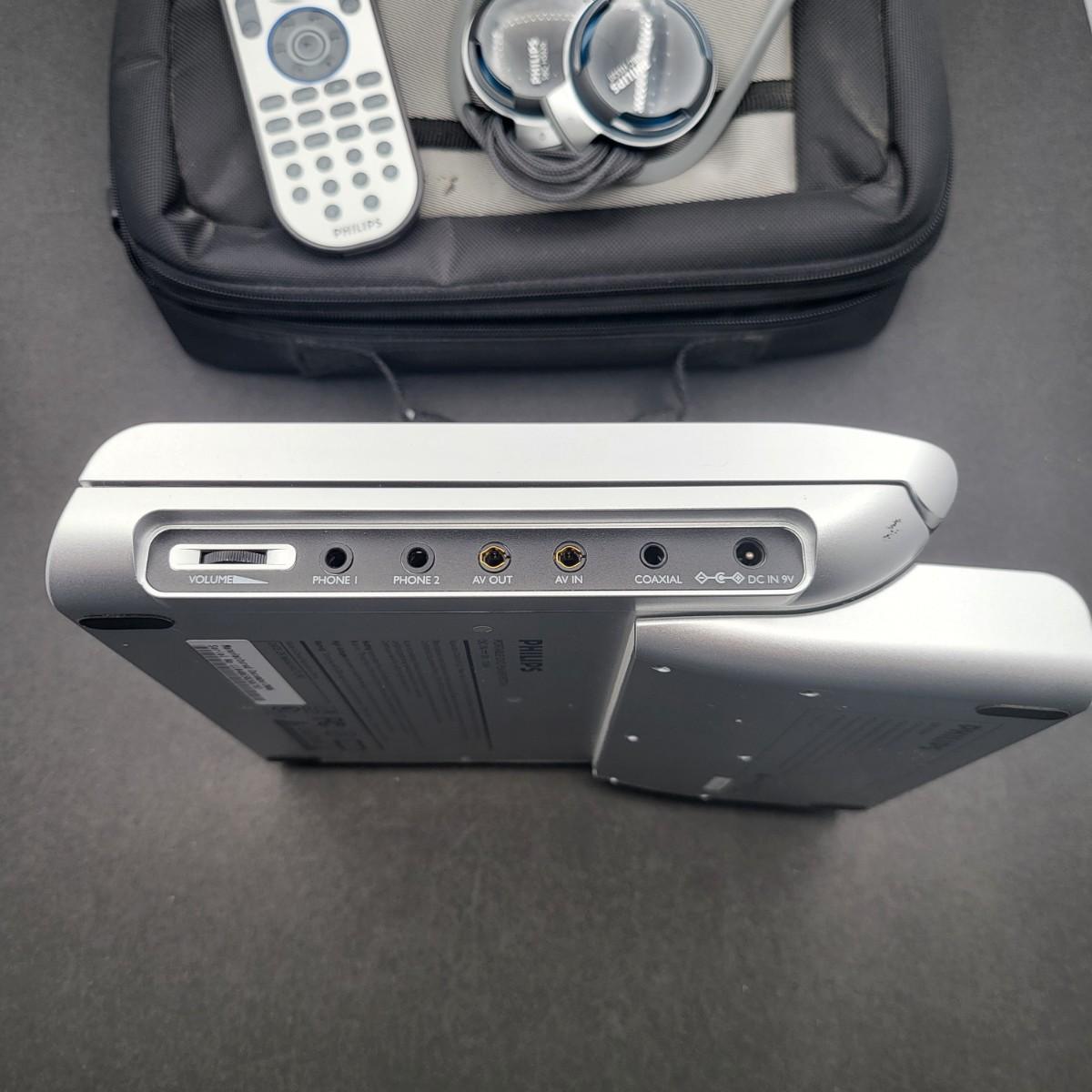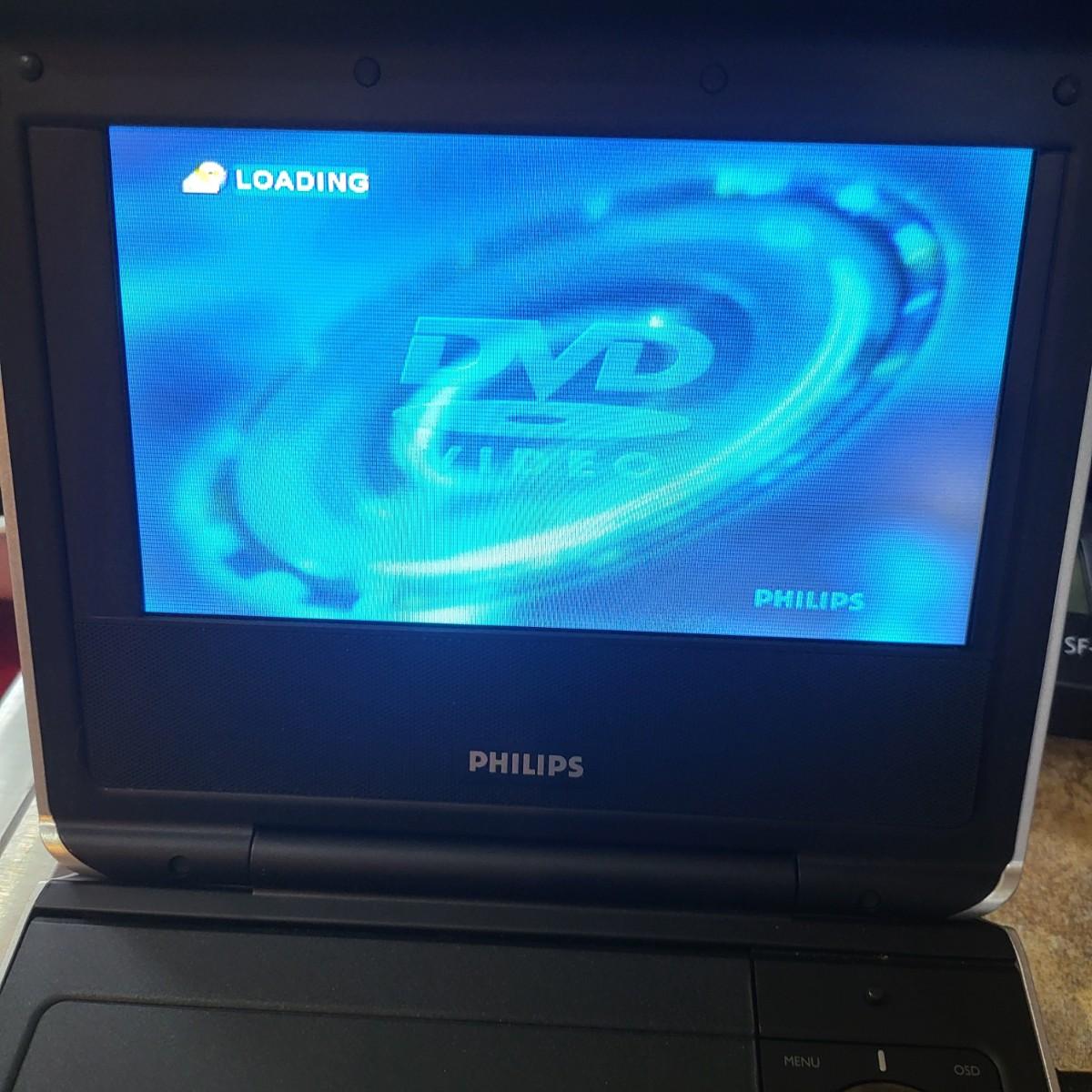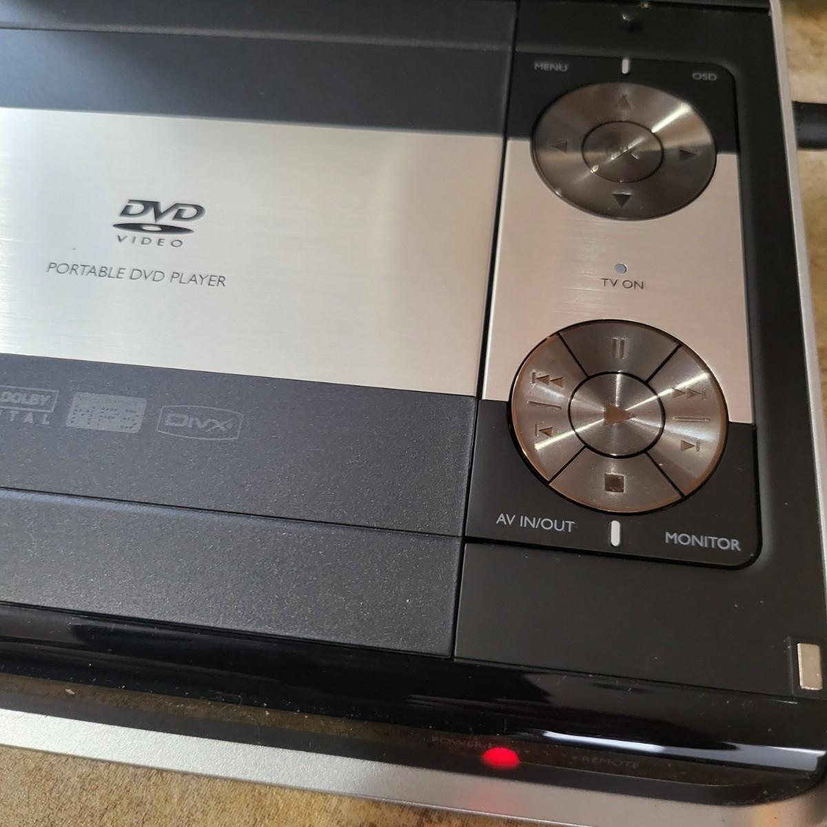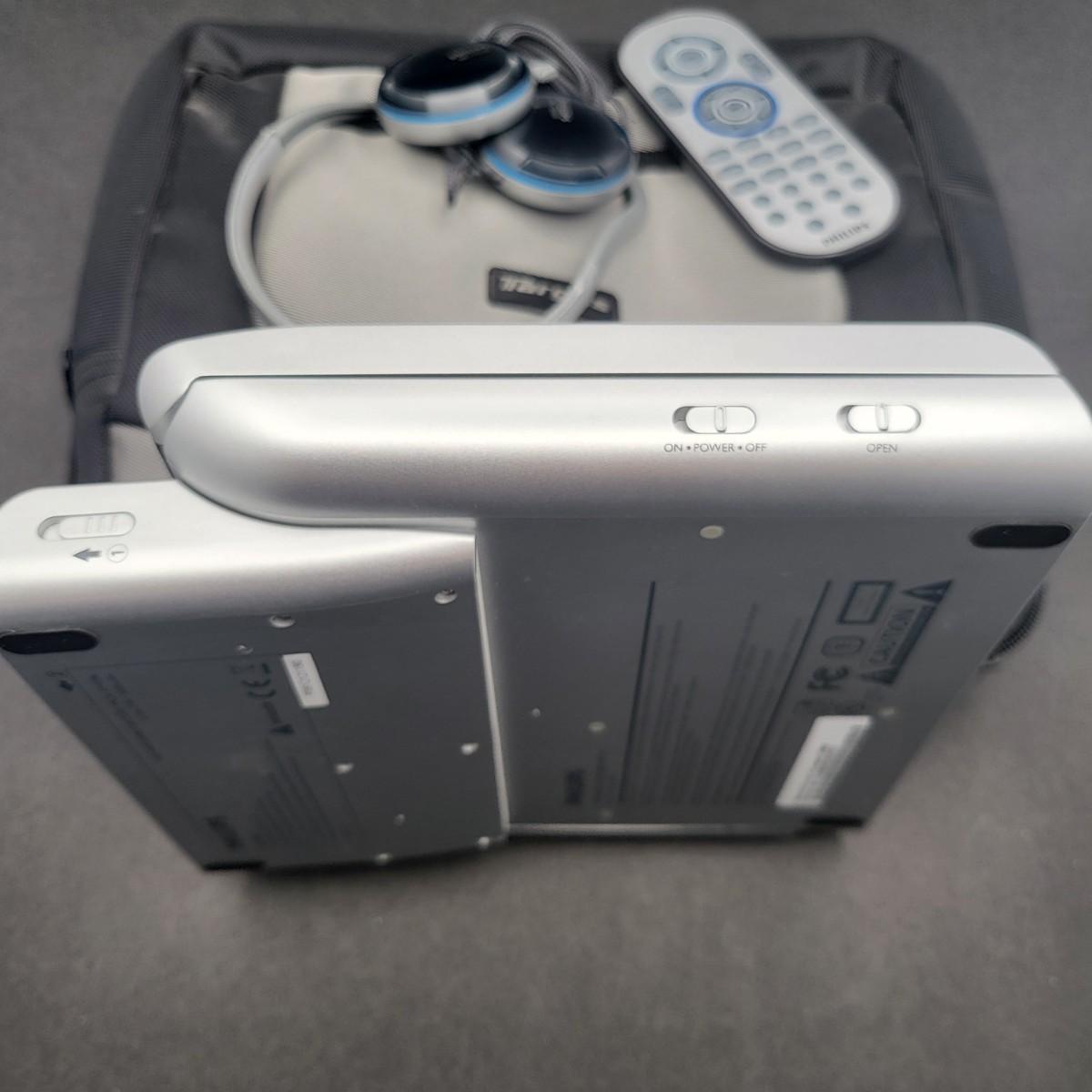 Powers on. DVD Player also comes with owners manual, headphones, electrical plug in, rechargeable battery pack , remote and Targus nylon storage bag.