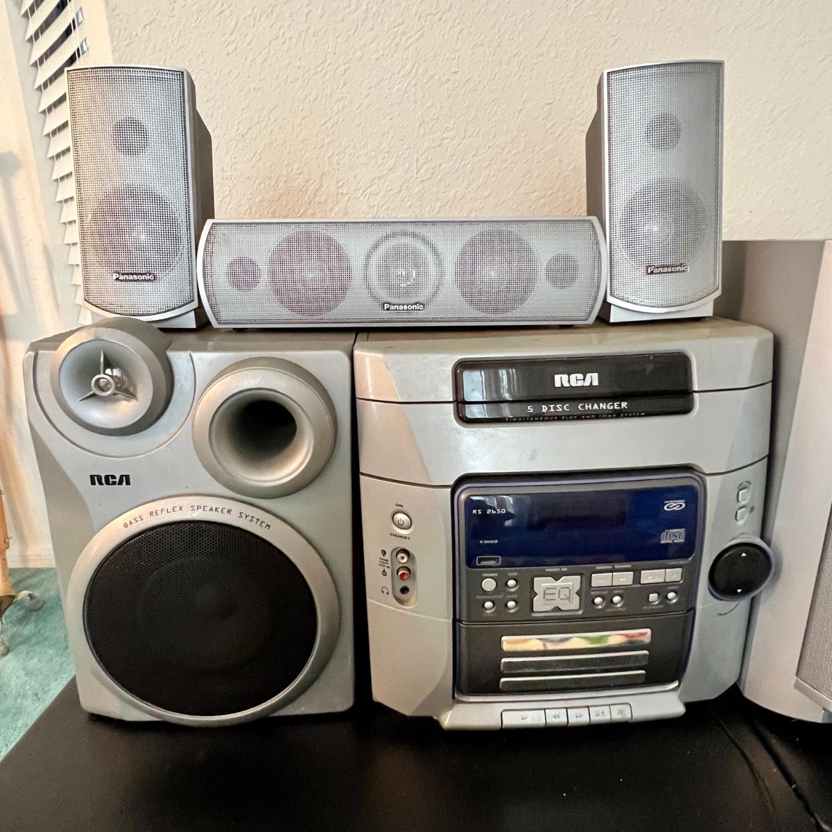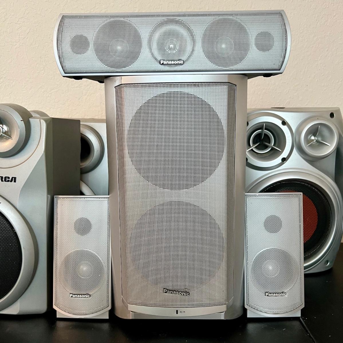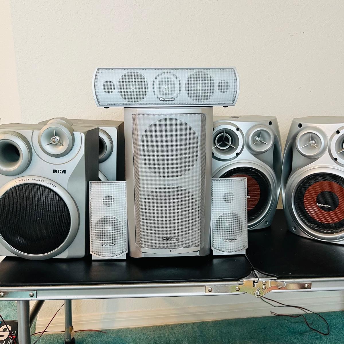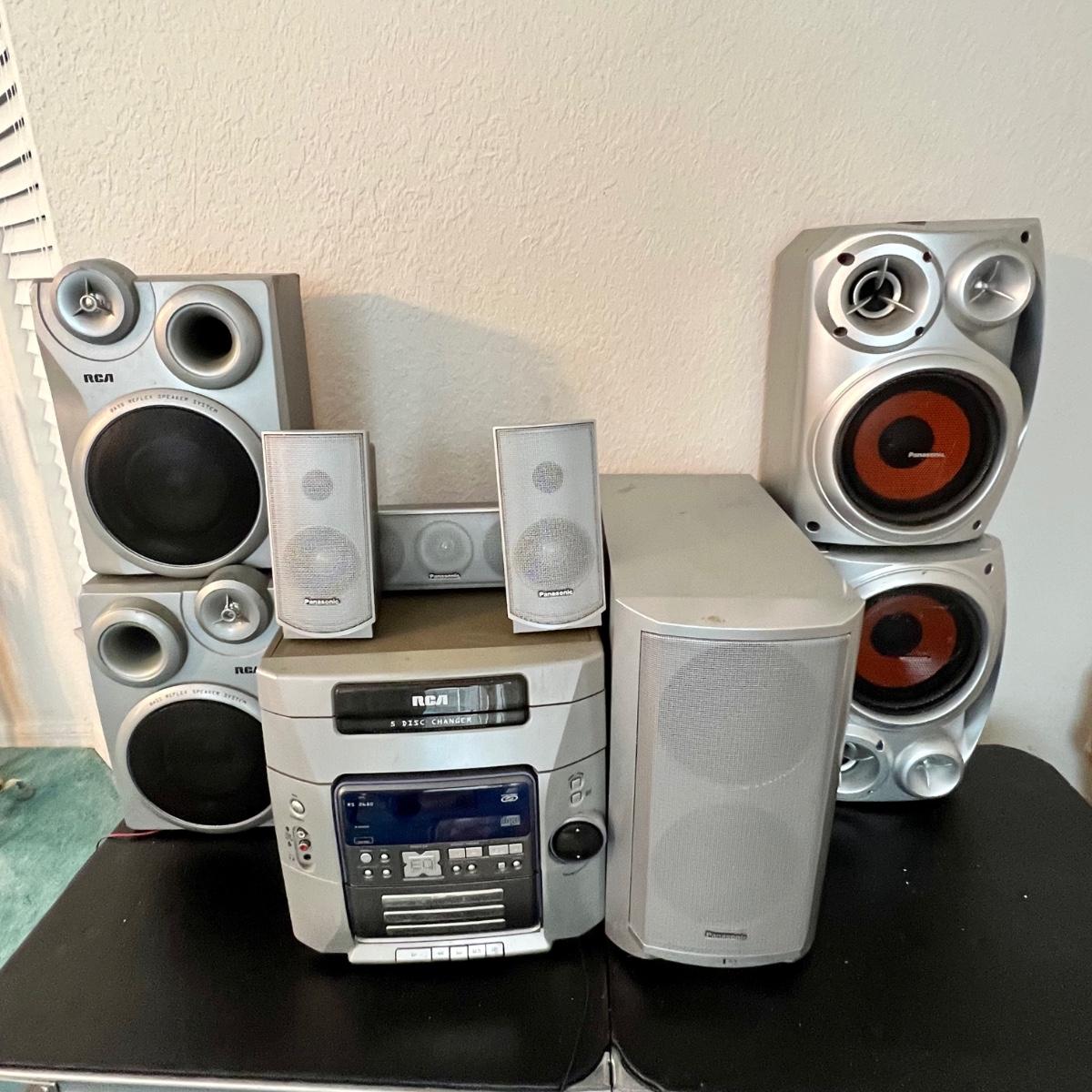 Lot includes Set of three Panasonic Speakers (SB-FS731), and one Subwoofer (SB-WA730). One pair of Panasonic and one pair of RCA Speakers. RCA 5Disc CD Changer powers on but sticks when opening.