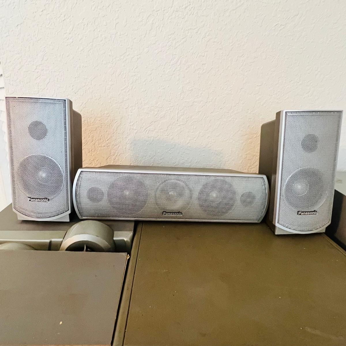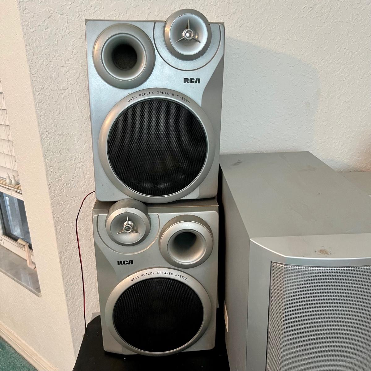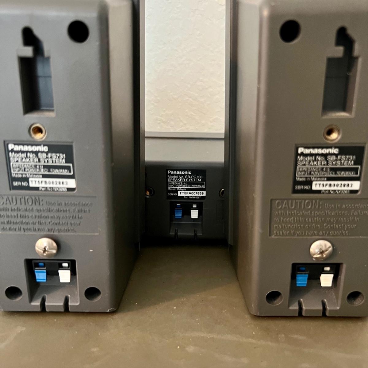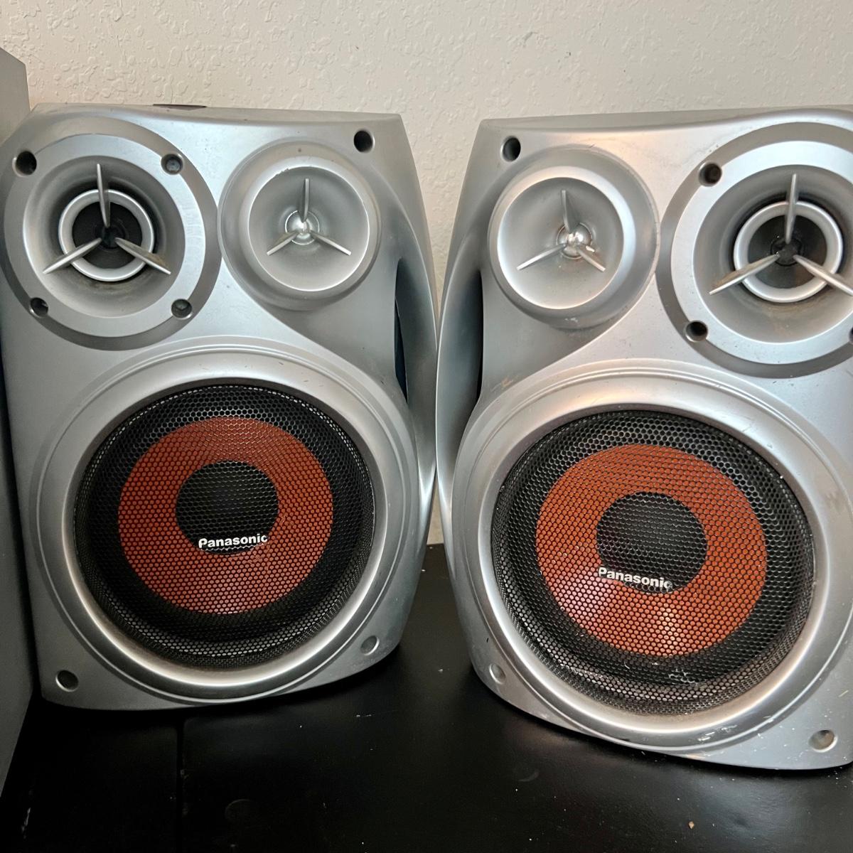 Lot includes Set of three Panasonic Speakers (SB-FS731), and one Subwoofer (SB-WA730). One pair of Panasonic and one pair of RCA Speakers. RCA 5Disc CD Changer powers on but sticks when opening.
