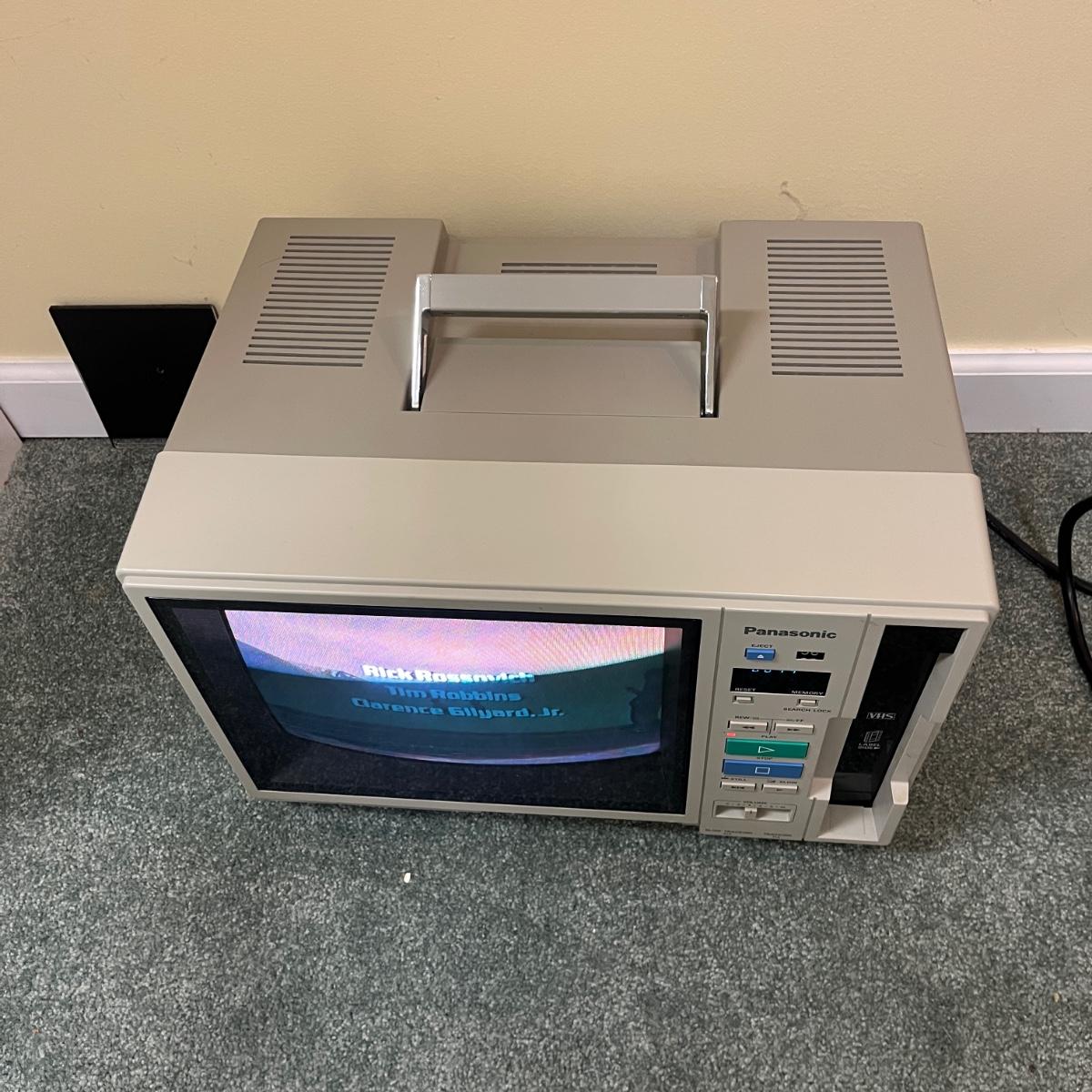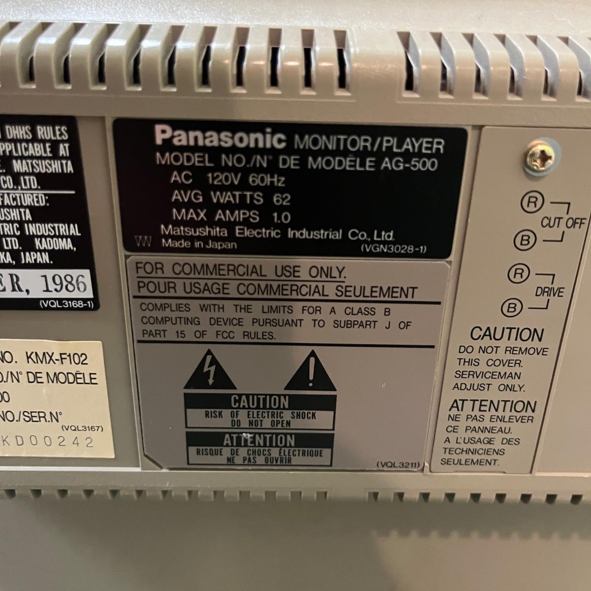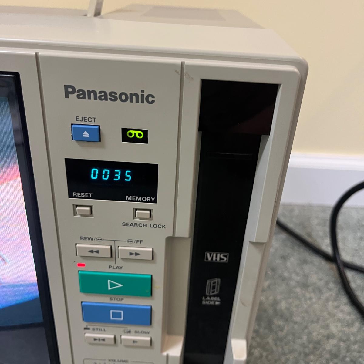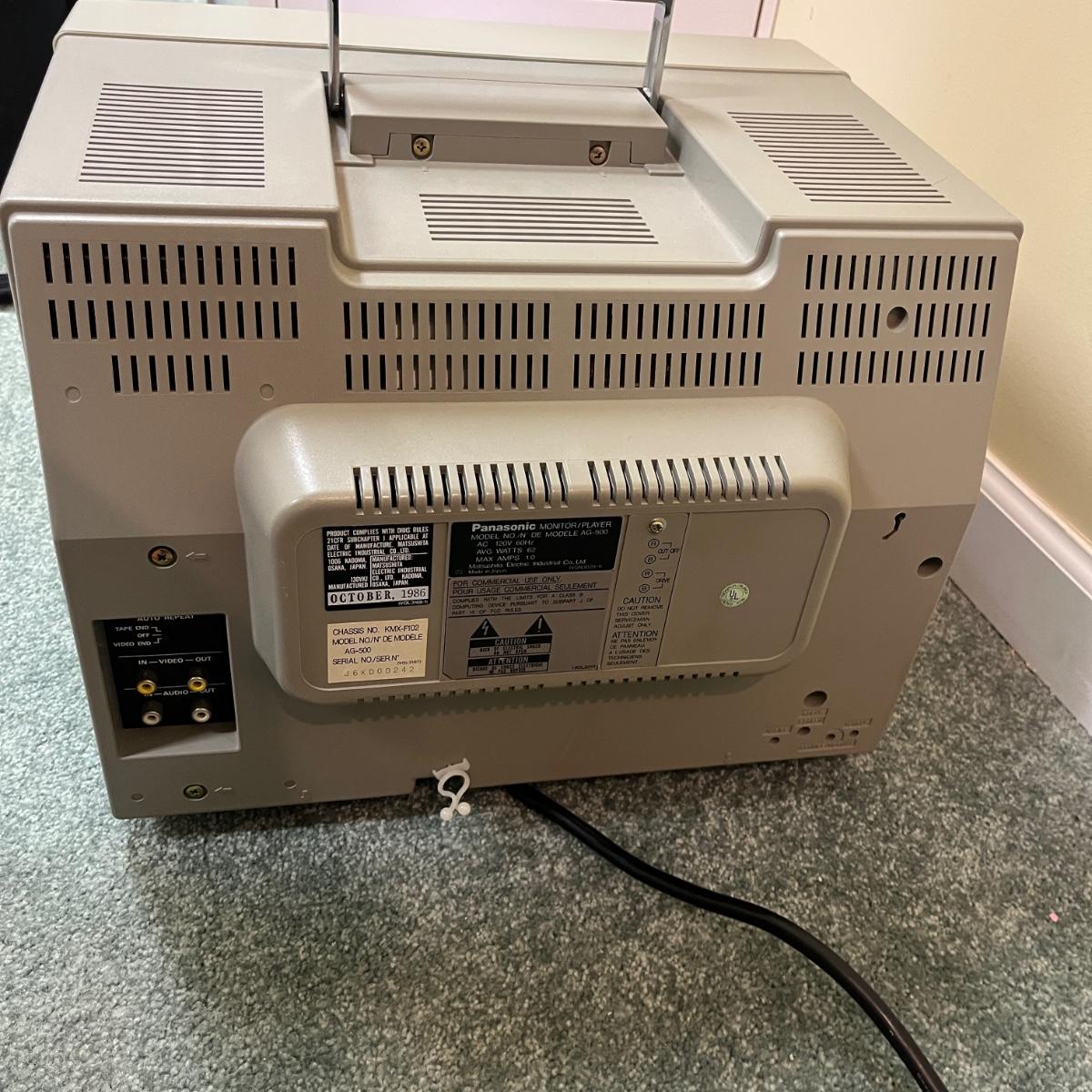 Lot includes a vintage Panasonic VHS color monitor and player with padded carrying case. Model AG-500. Turns on when plugged in. Machine measures 15” x 13” x 12”H.