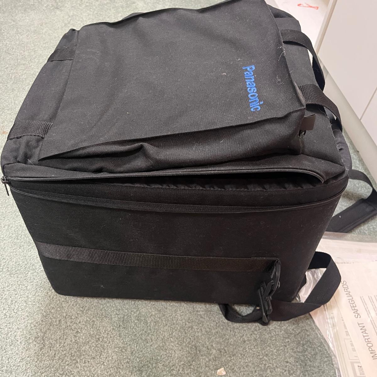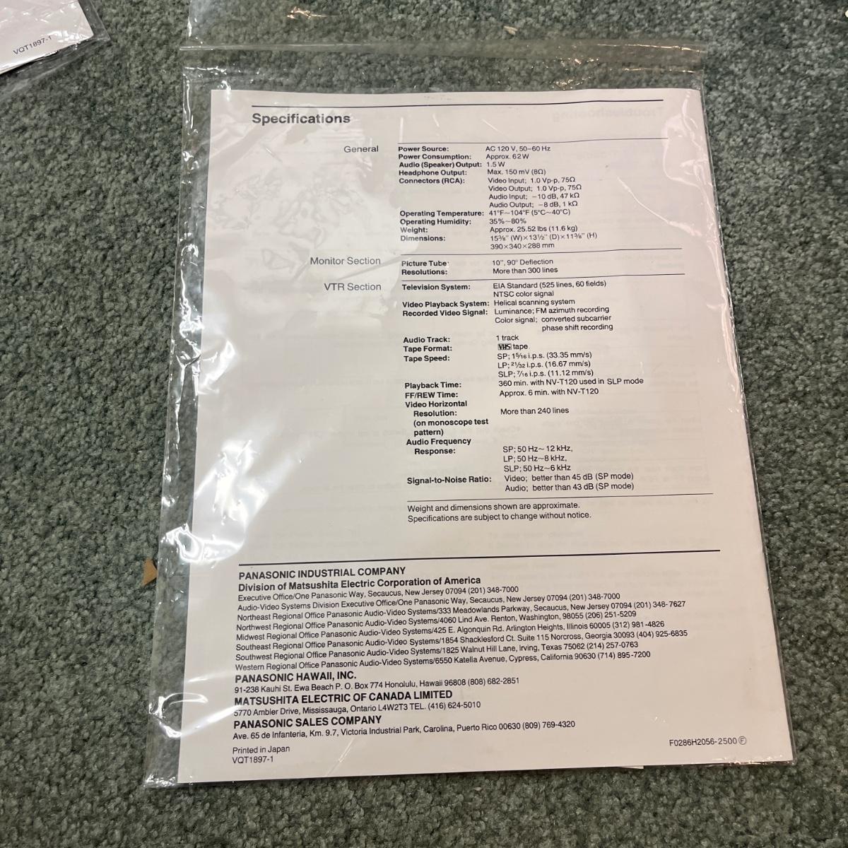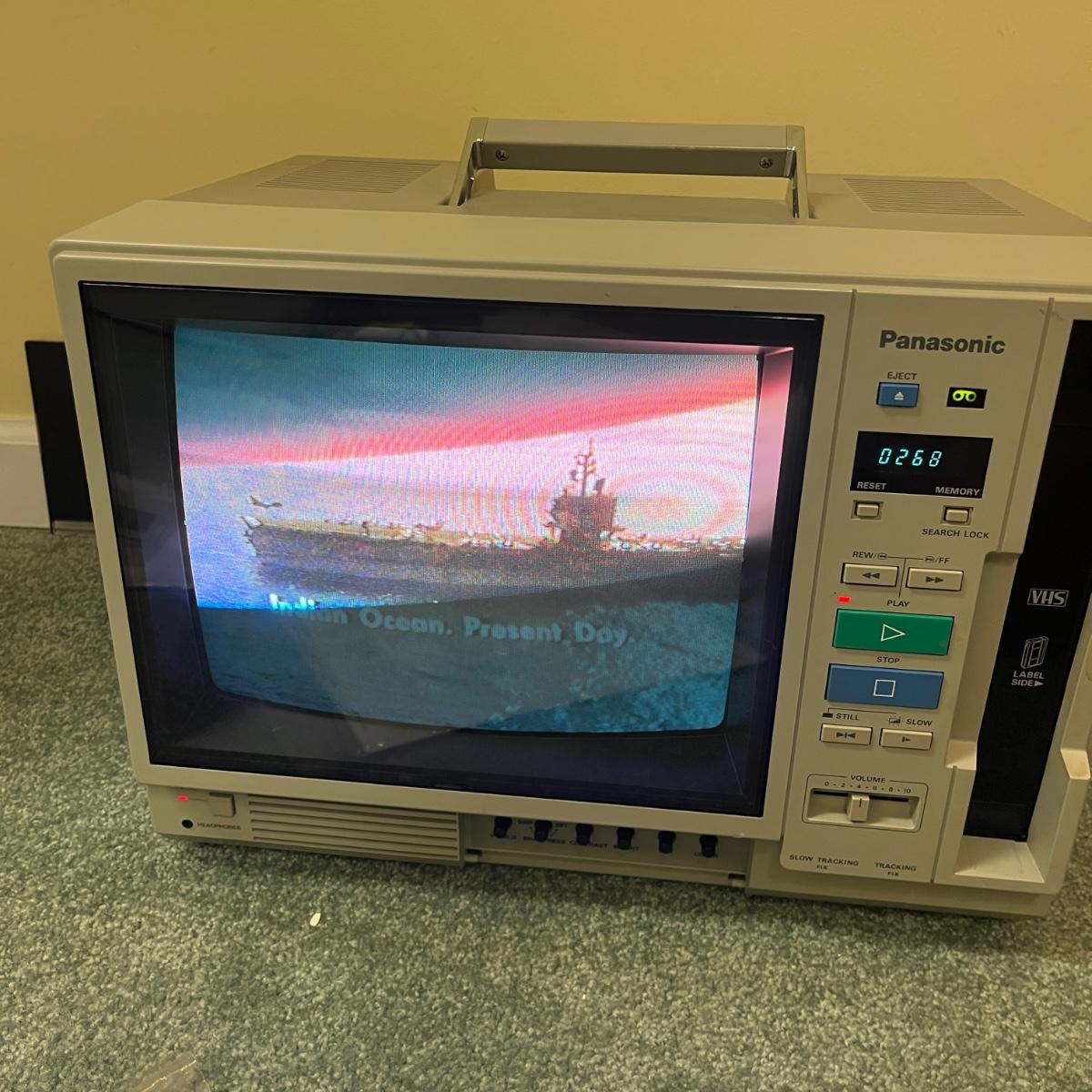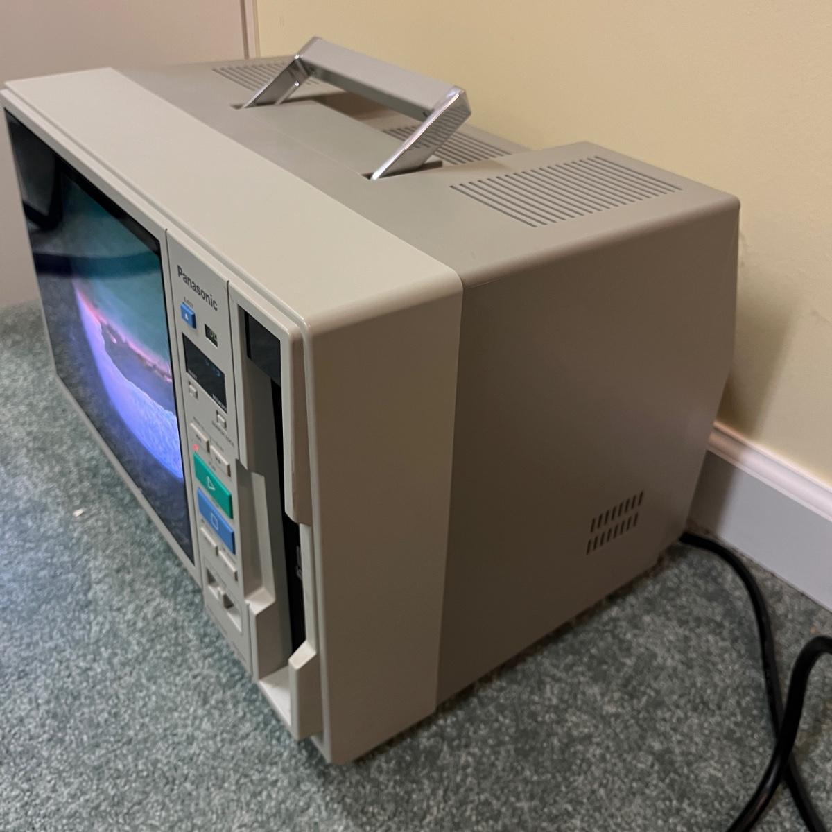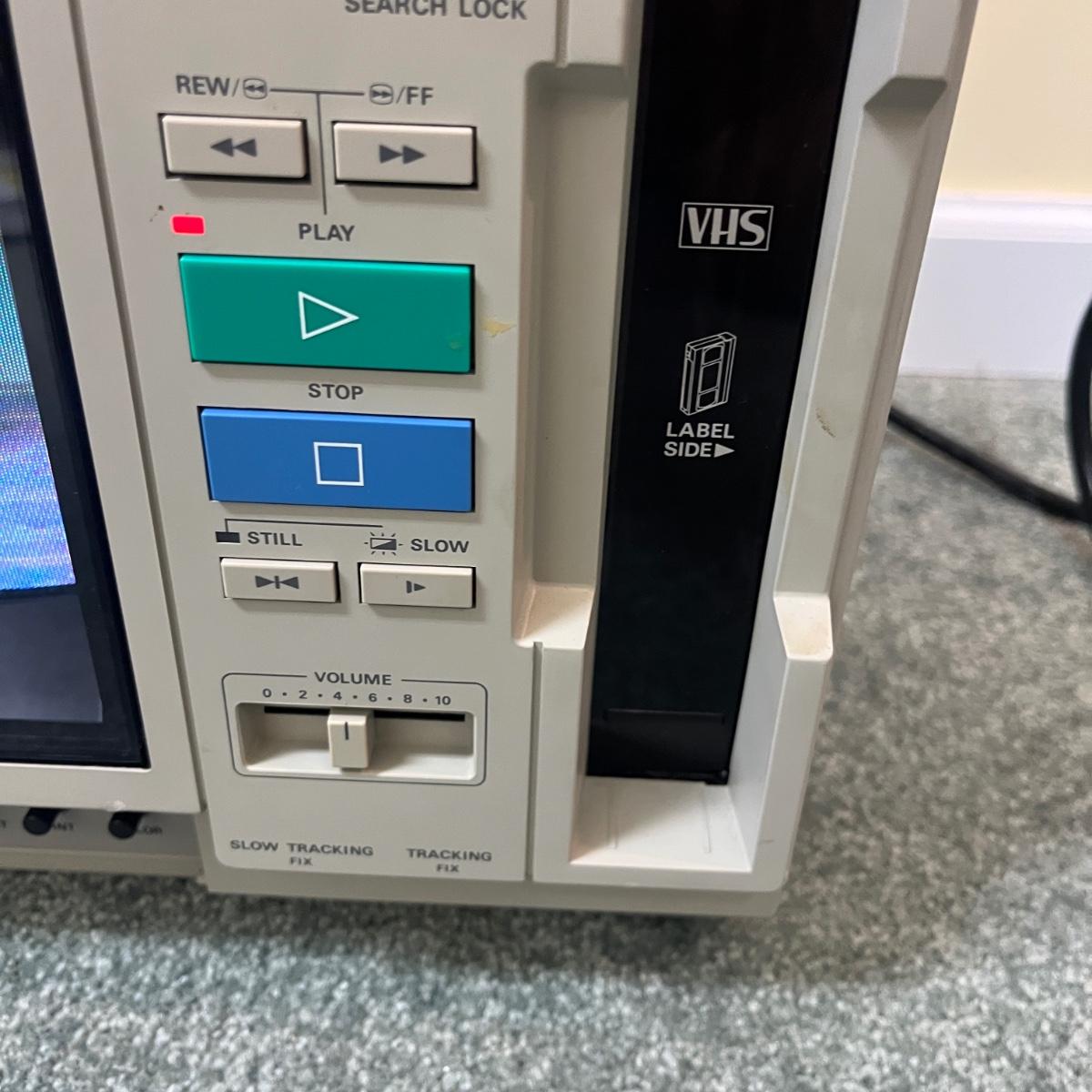 Lot includes a vintage Panasonic VHS color monitor and player with padded carrying case. Model AG-500. Turns on when plugged in. Machine measures 15” x 13” x 12”H.