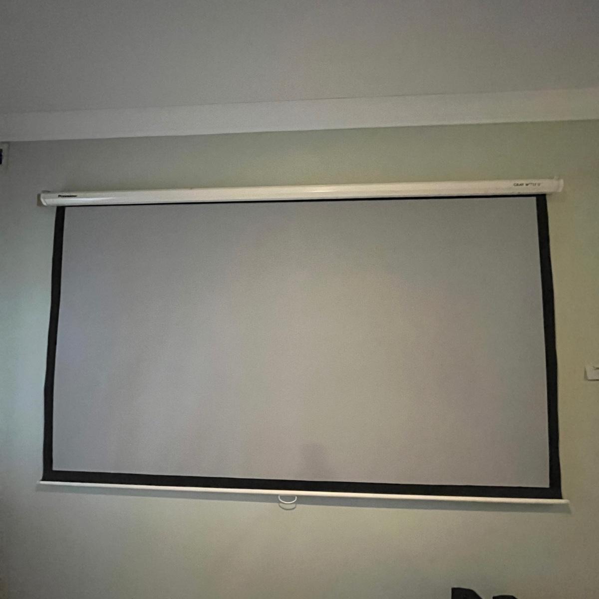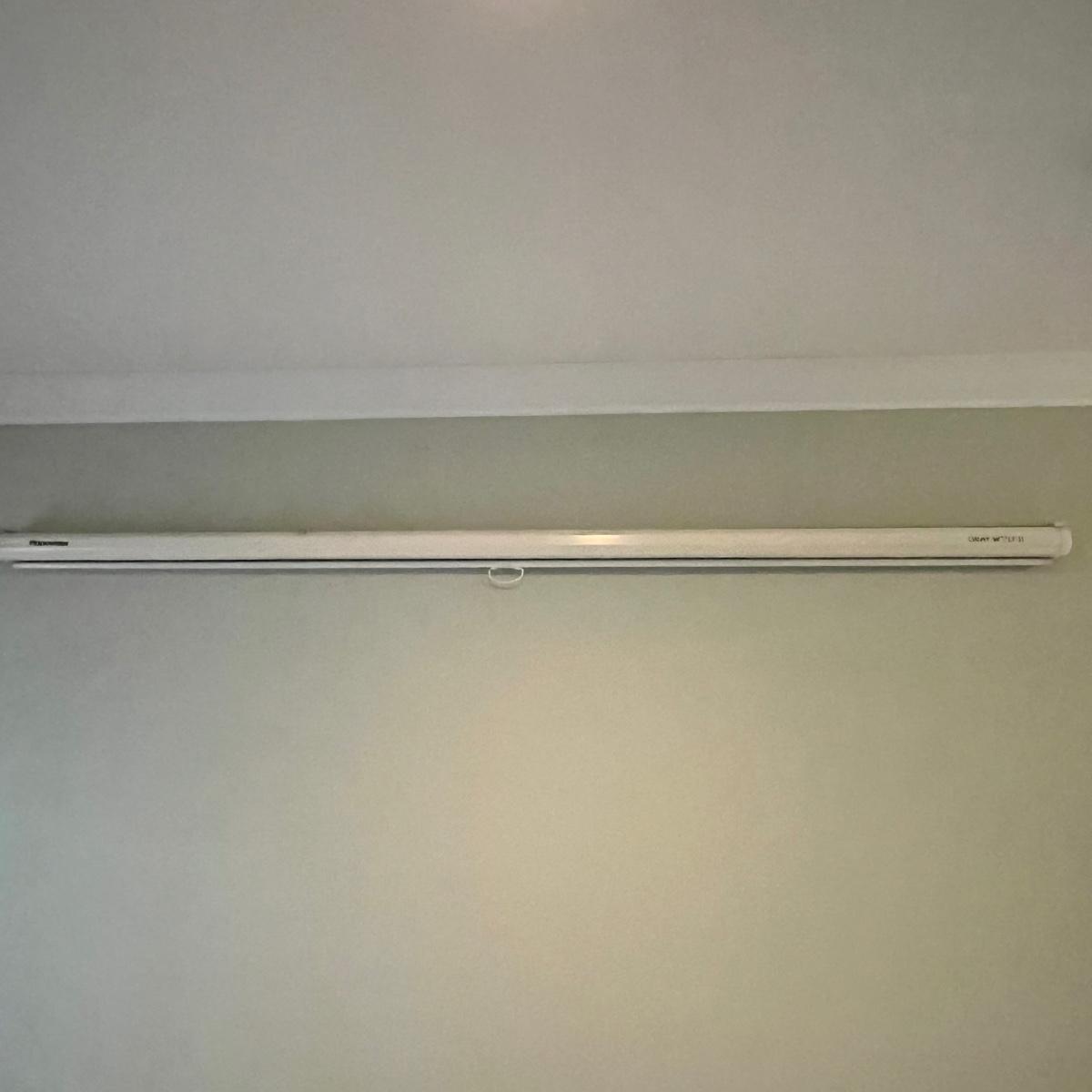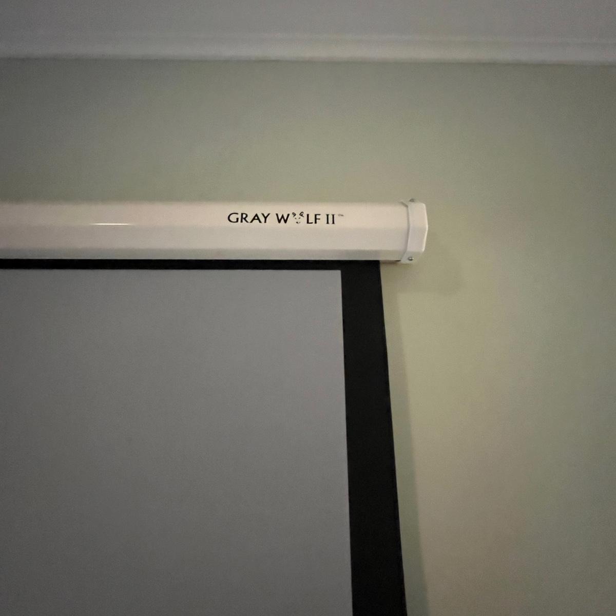Lot includes a Panoview 106” projector screen model Gray Wolf 2. Unit rolls up and down manually.