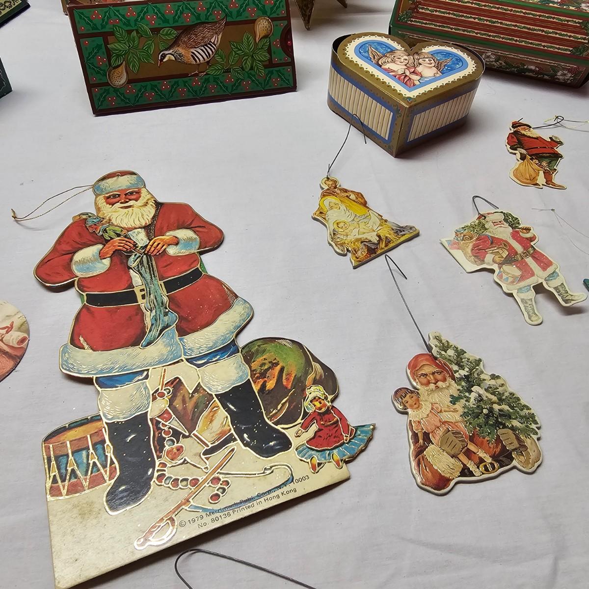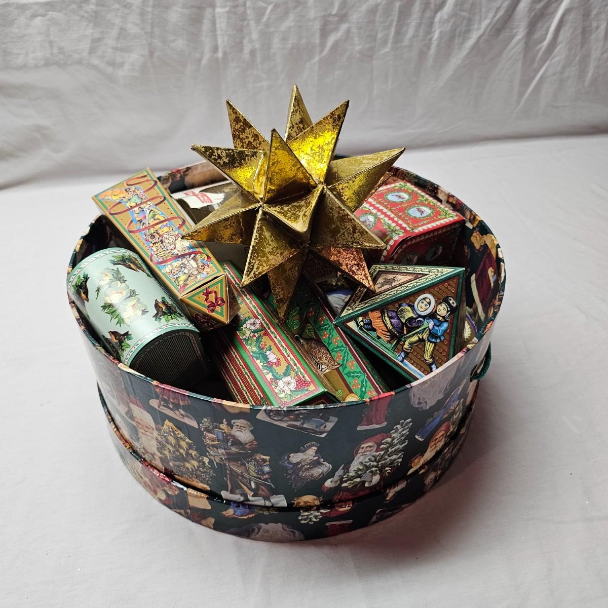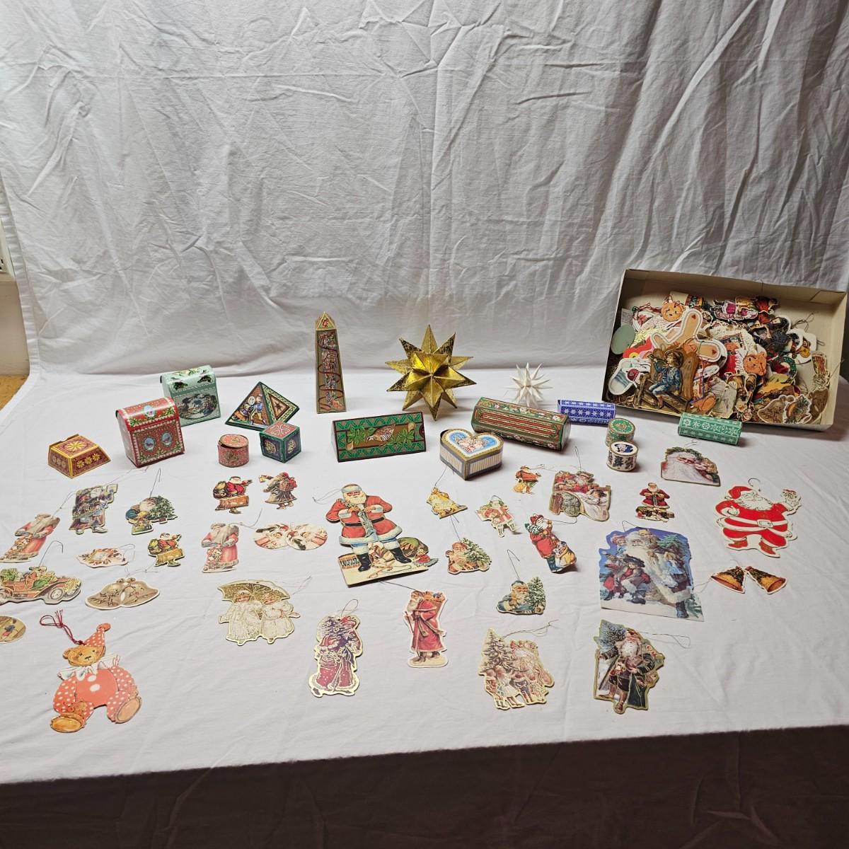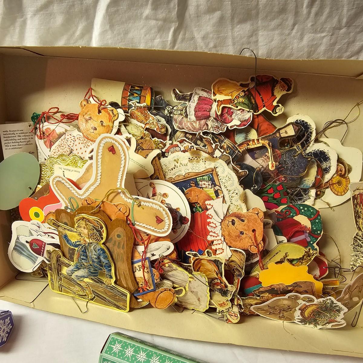 An entire box of 2D and 3D Christmas ornaments and gift tags. All items are made of paper, some have images on both sides. Fold up pieces can be used for table decor. Ornaments are from 3" to 7" H. See photos for details. Round gift box included. Shipping available.