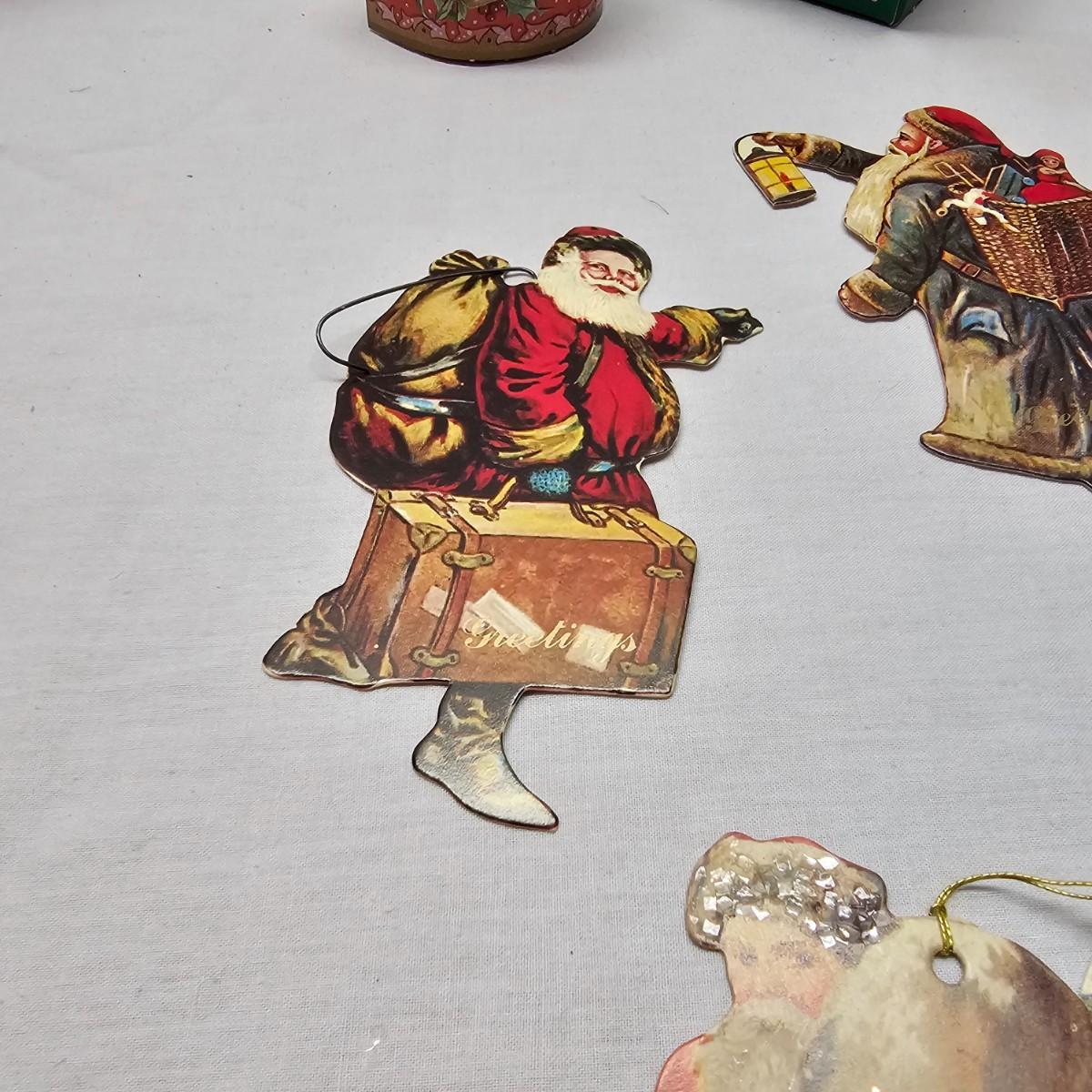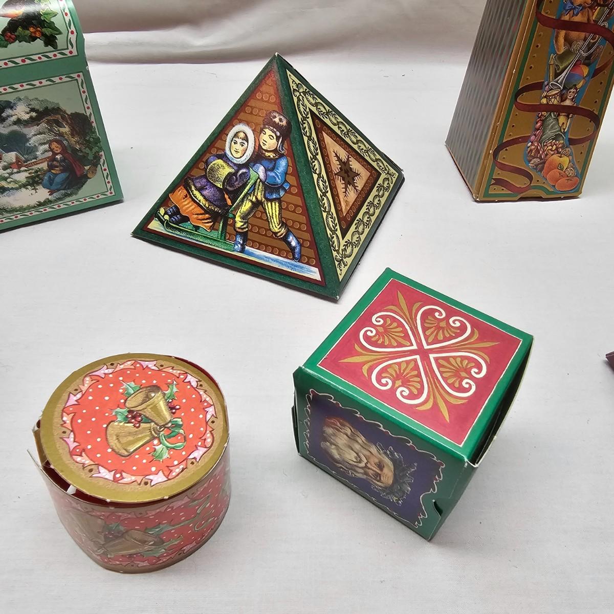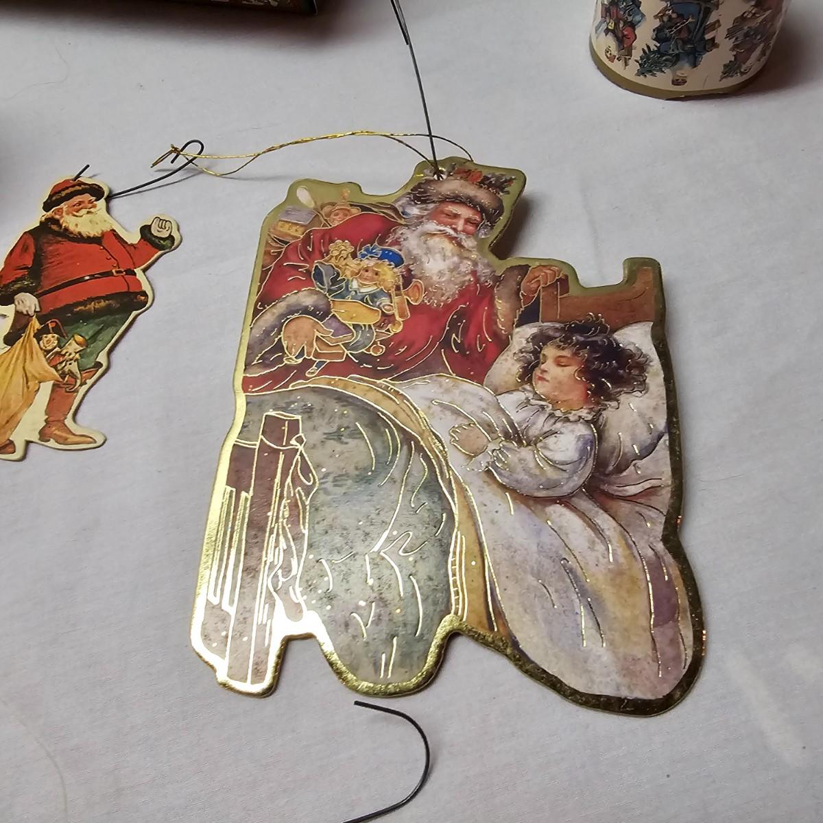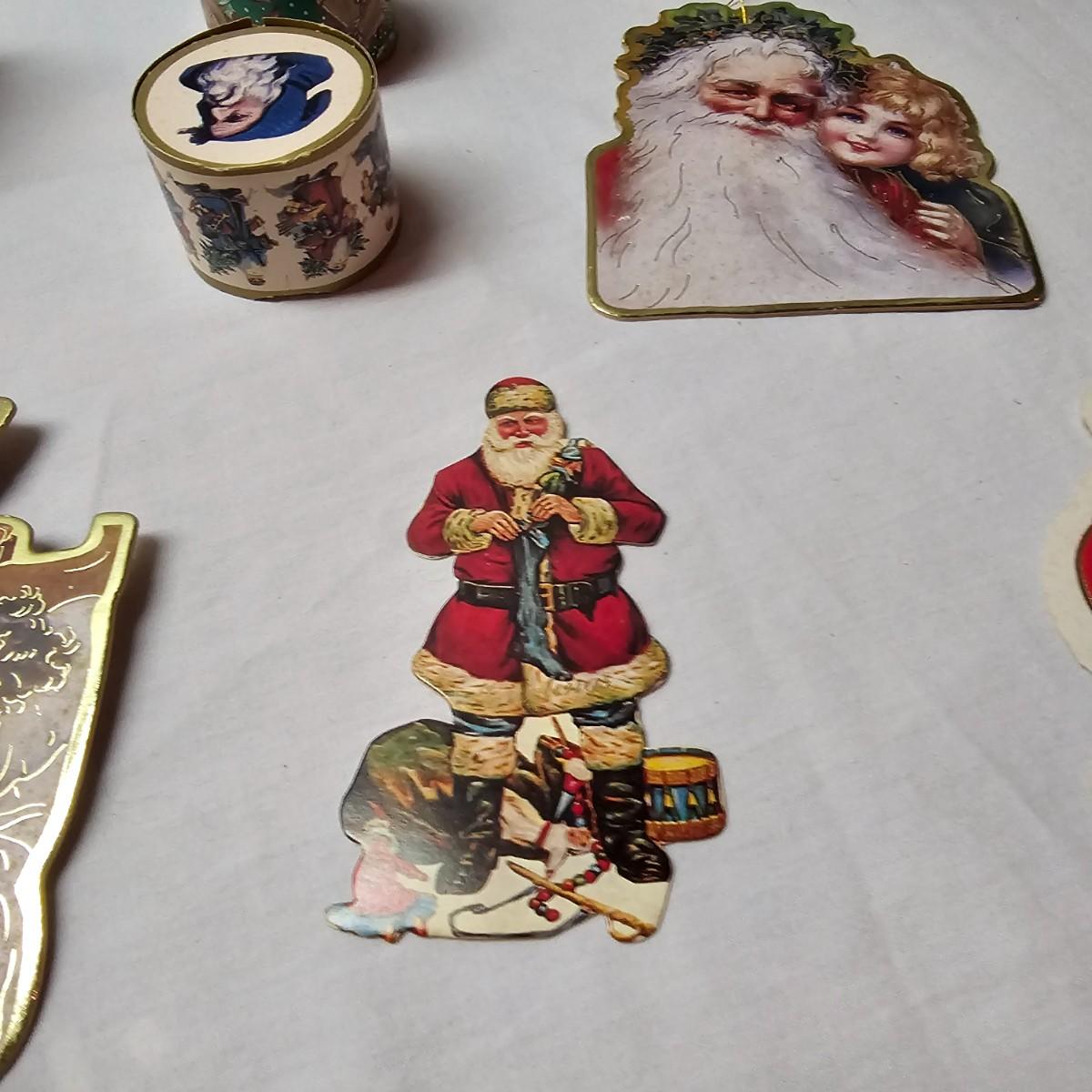 An entire box of 2D and 3D Christmas ornaments and gift tags. All items are made of paper, some have images on both sides. Fold up pieces can be used for table decor. Ornaments are from 3" to 7" H. See photos for details. Round gift box included. Shipping available.