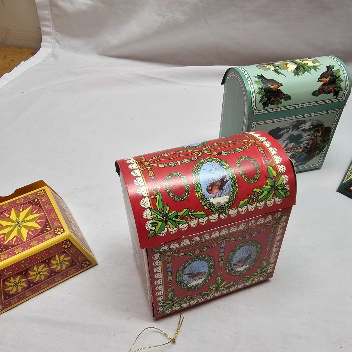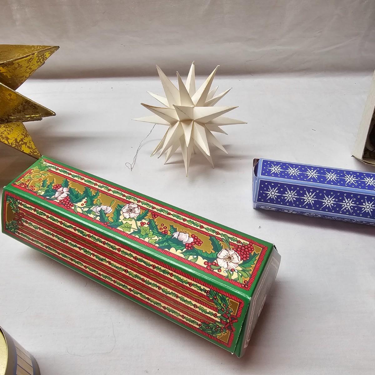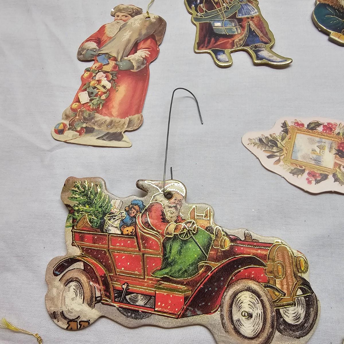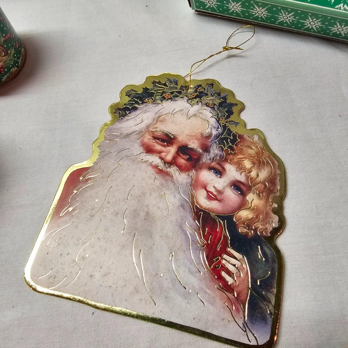 An entire box of 2D and 3D Christmas ornaments and gift tags. All items are made of paper, some have images on both sides. Fold up pieces can be used for table decor. Ornaments are from 3" to 7" H. See photos for details. Round gift box included. Shipping available.