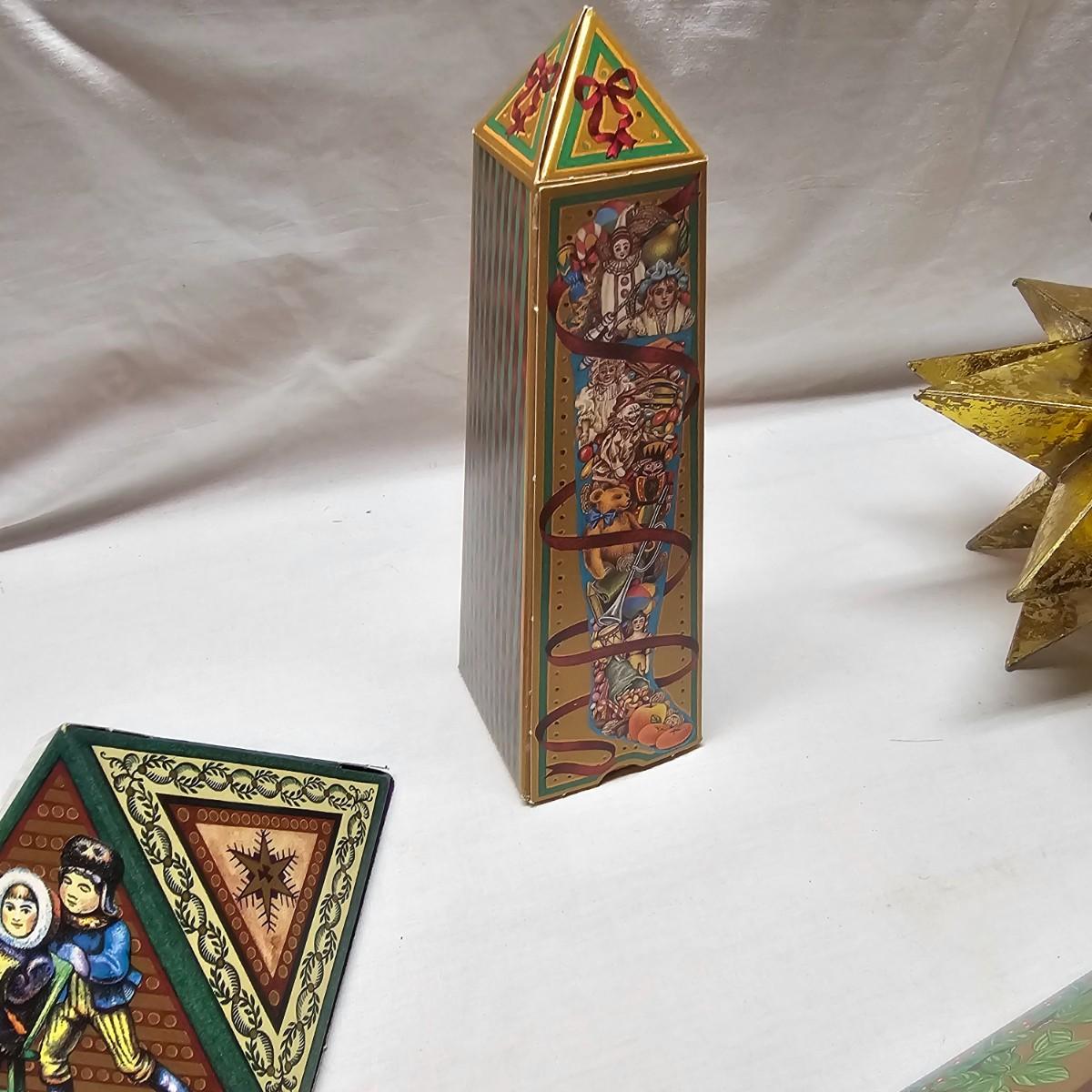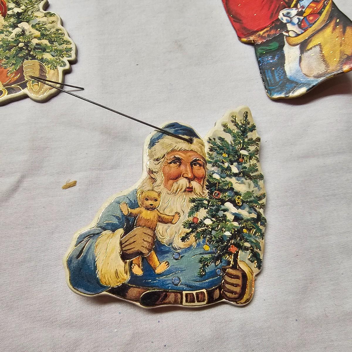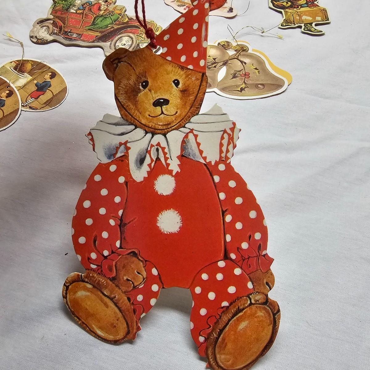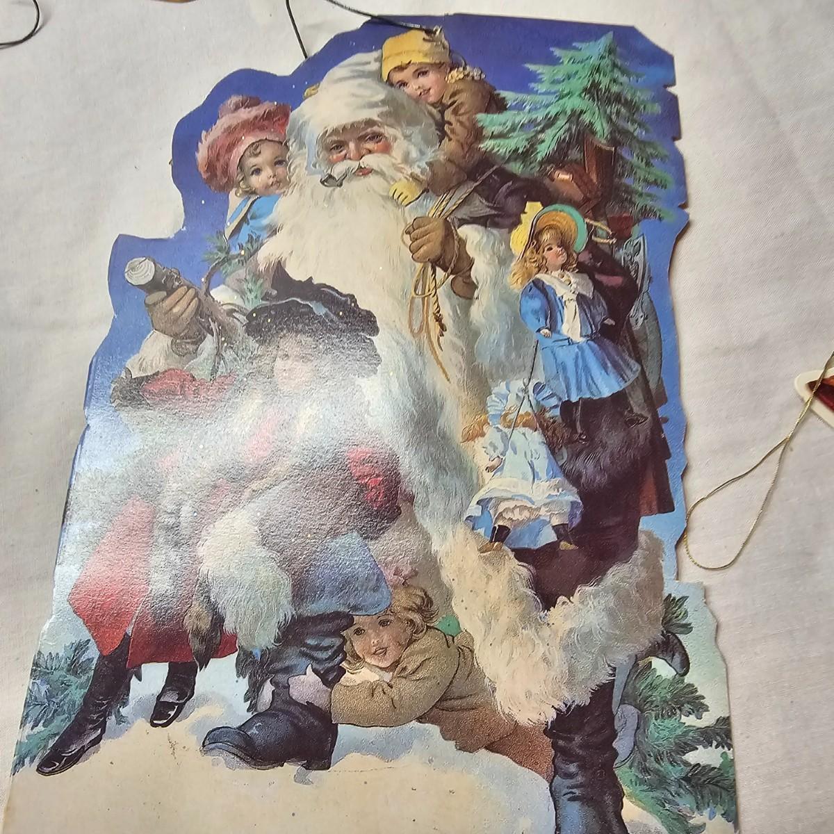 An entire box of 2D and 3D Christmas ornaments and gift tags. All items are made of paper, some have images on both sides. Fold up pieces can be used for table decor. Ornaments are from 3" to 7" H. See photos for details. Round gift box included. Shipping available.