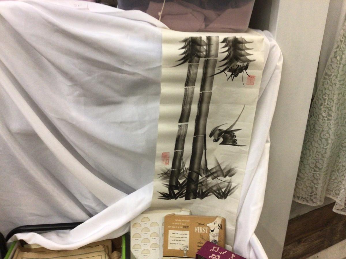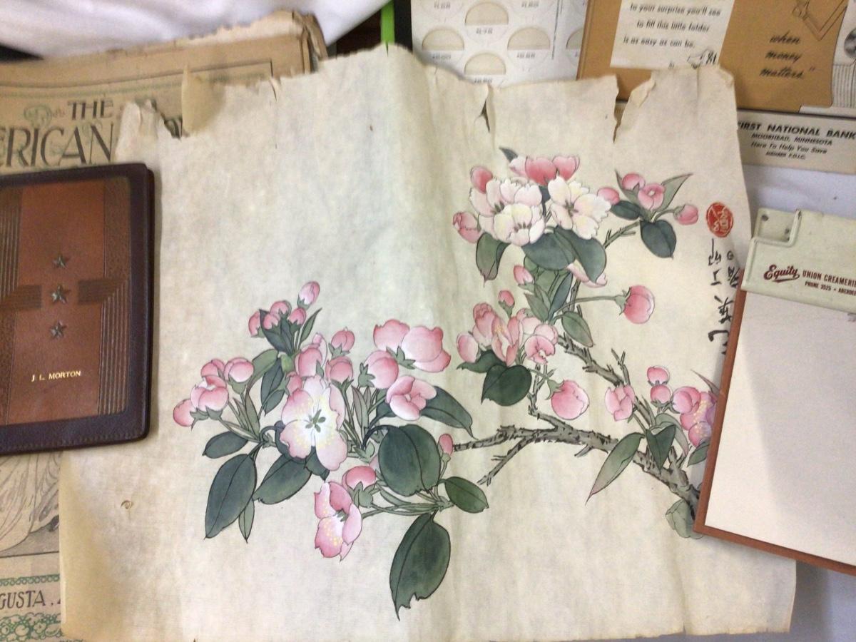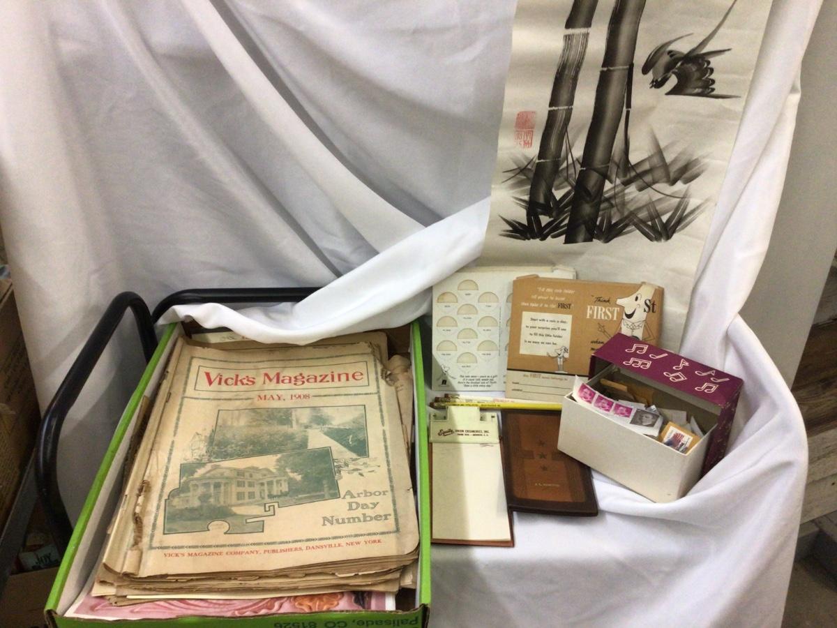 You get two pictures ( flowers and bamboo) rice paper drawings. Small box of stamps, coin collecting sleeves, advertising, magazines, calendars and more.