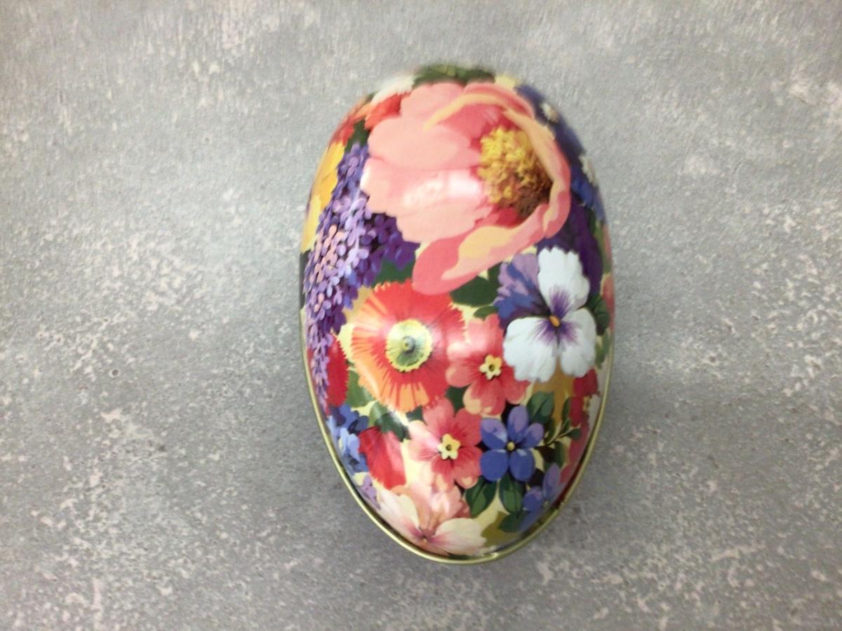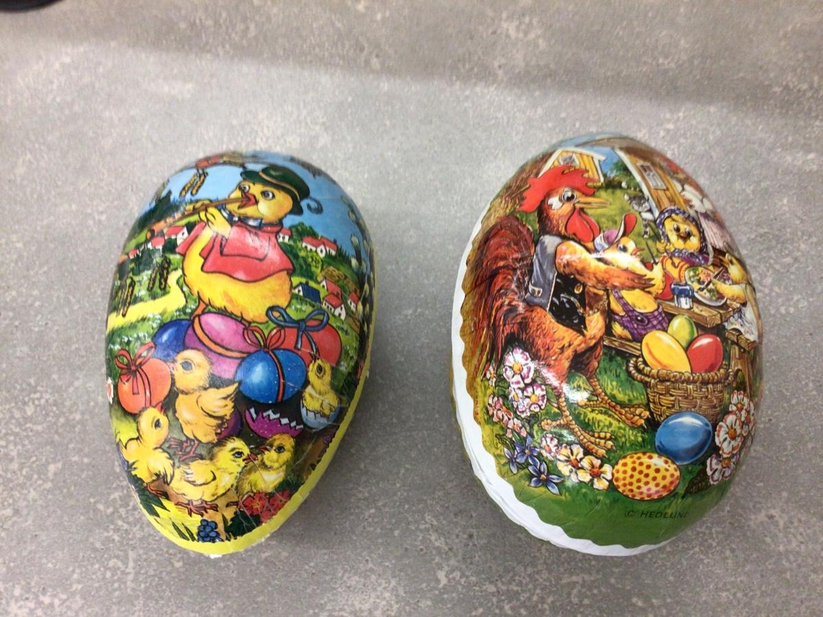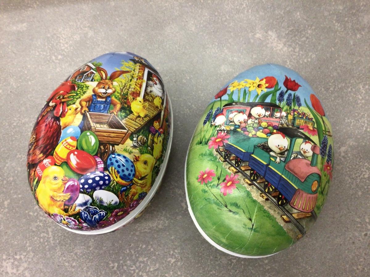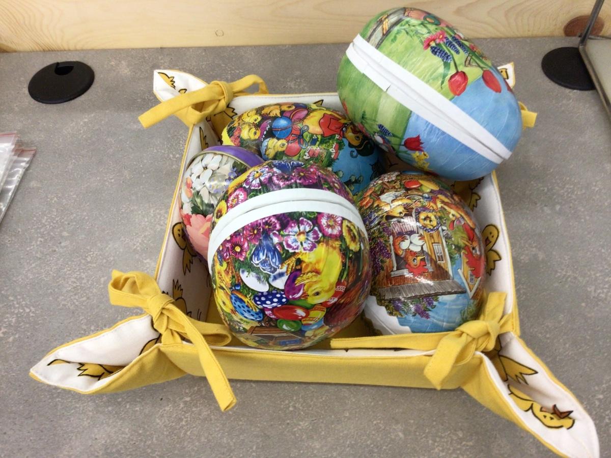 There are 4 paper mache and one metal eggs with Easter themes. They come in a square cloth basket with chicks on it.