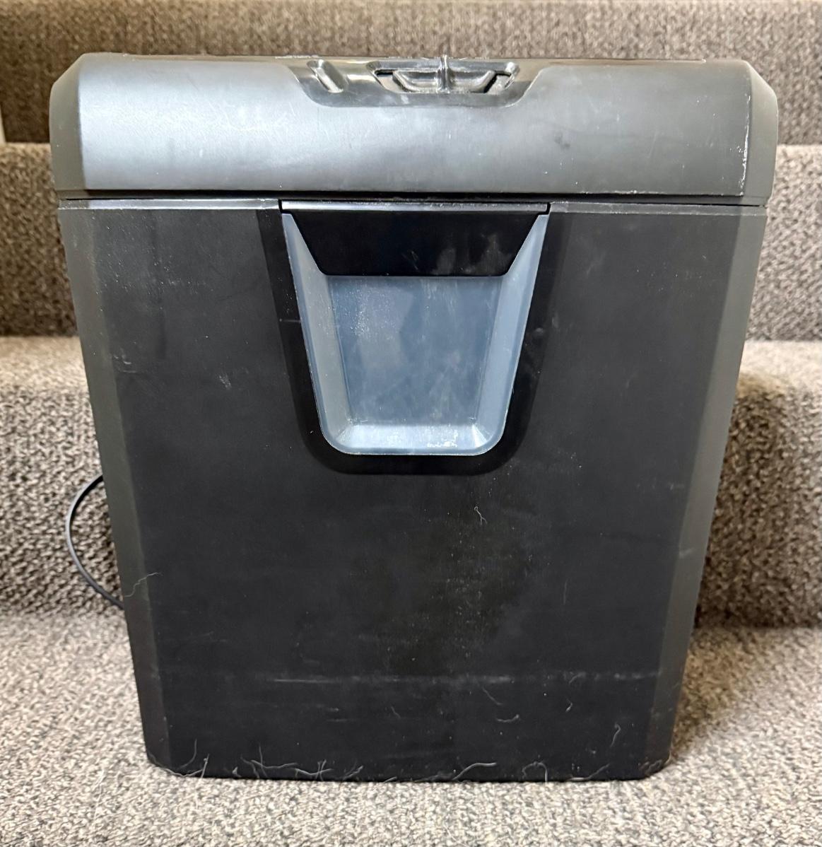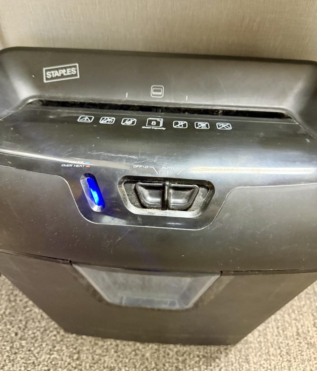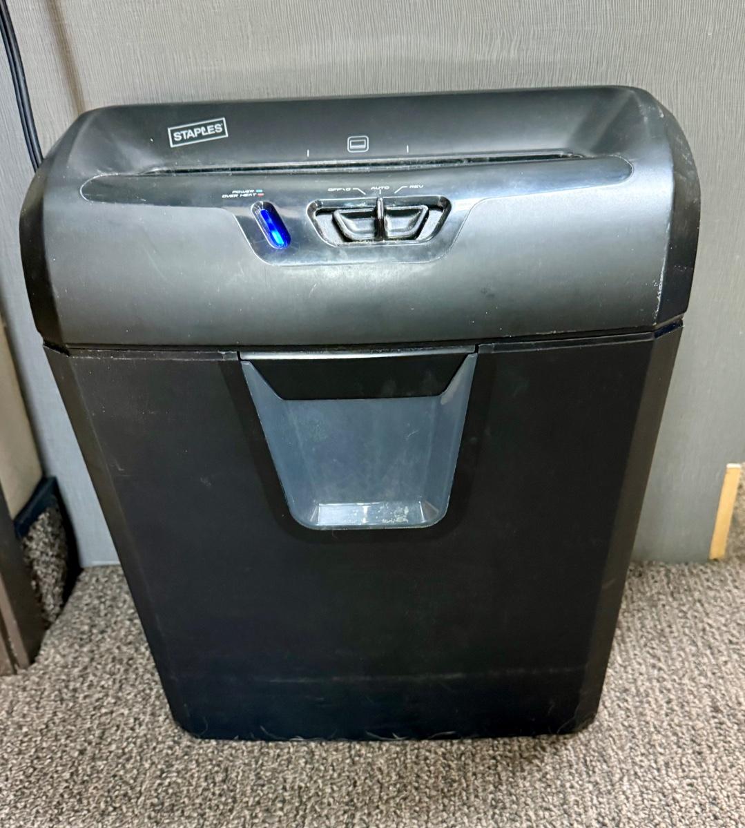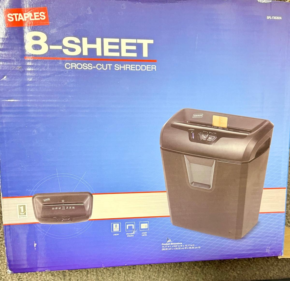 Staples 8-sheet crosscut shredder. Tested, works as expected.