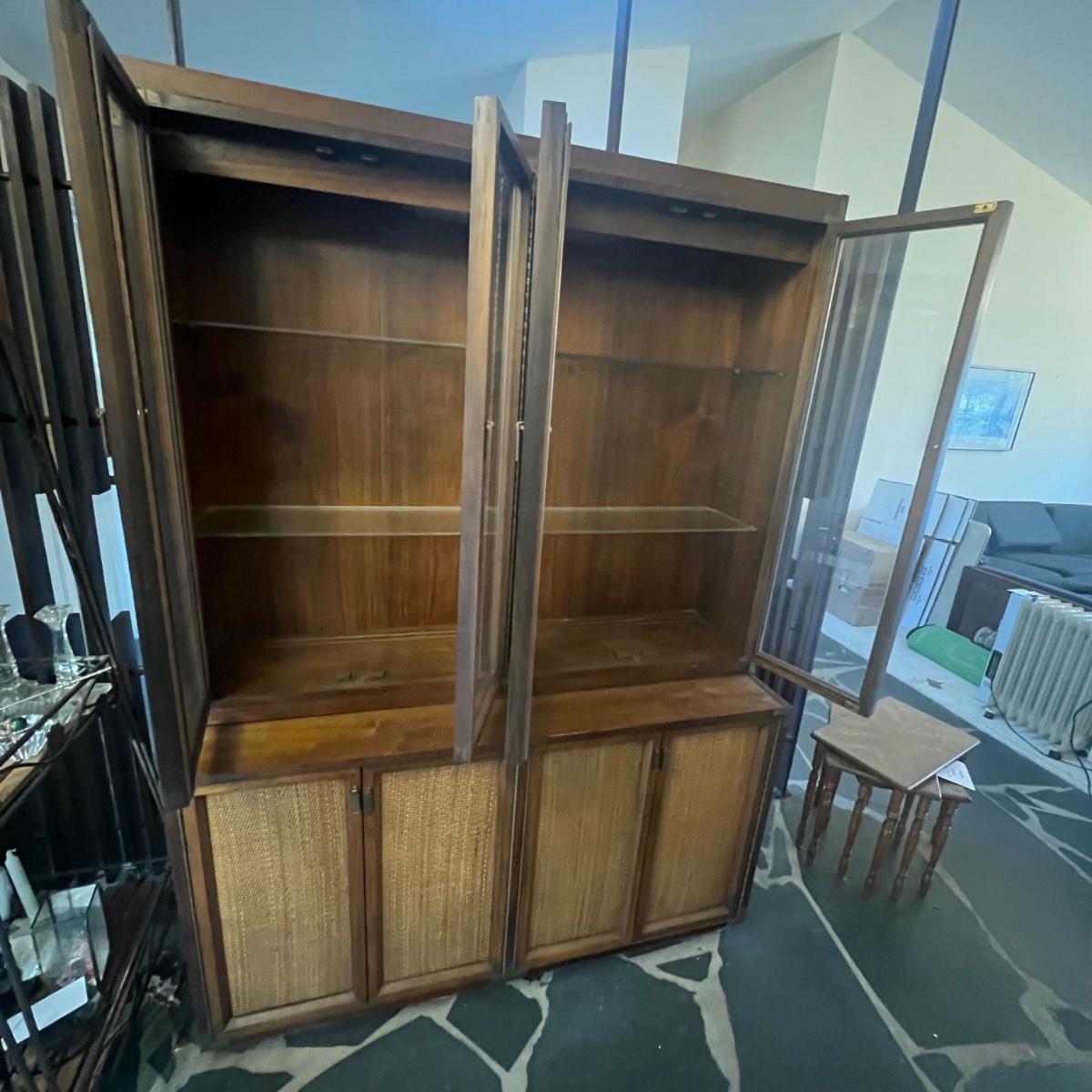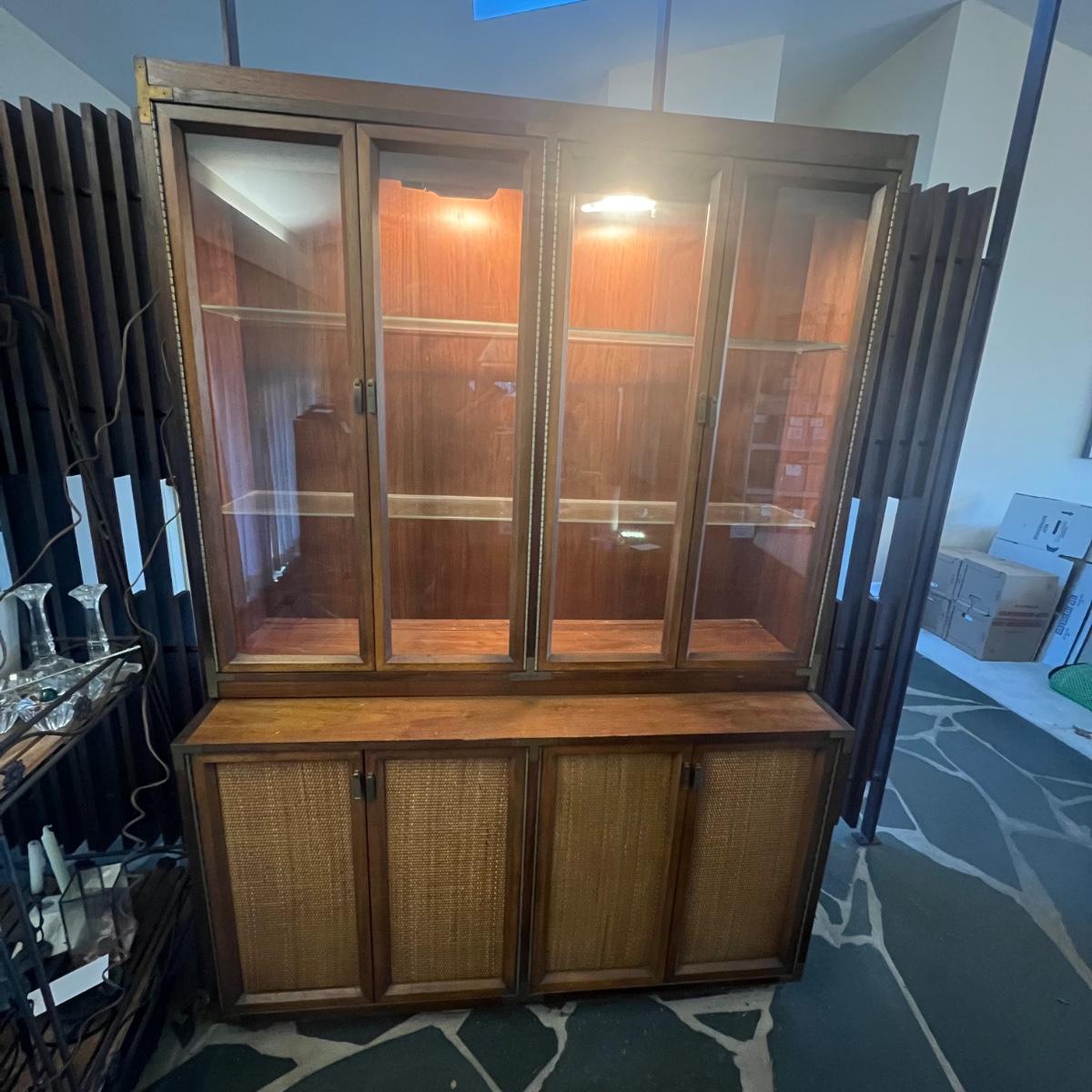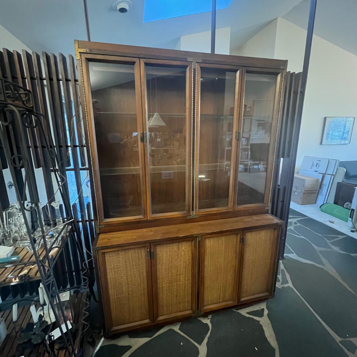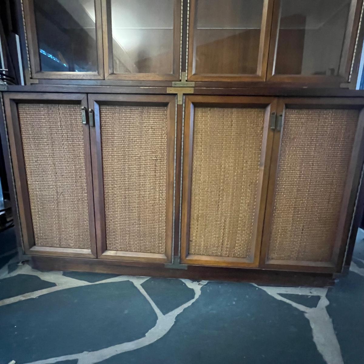 This Lane hutch is two sections; upper section just sits on top of the cabinet which has woven cane door fronts and what appears to be aged brass pulls and corner plates. Right cabinet has a shelf with the left side having one spacious drawer with dovetailed joints (minor blemishes, see images). The display case has lights and glass shelves with plate rails.
