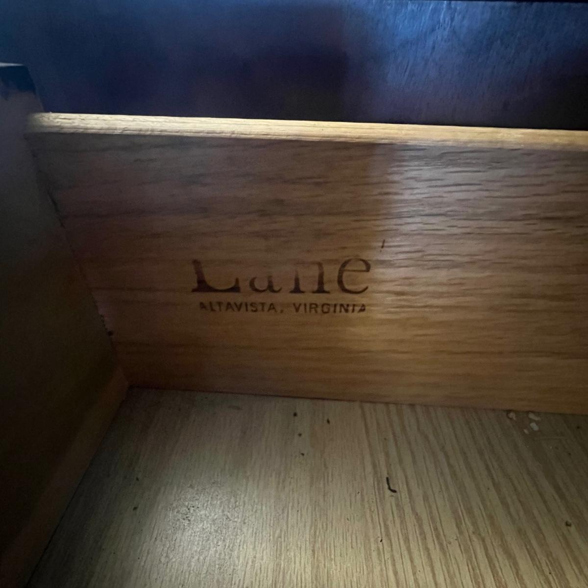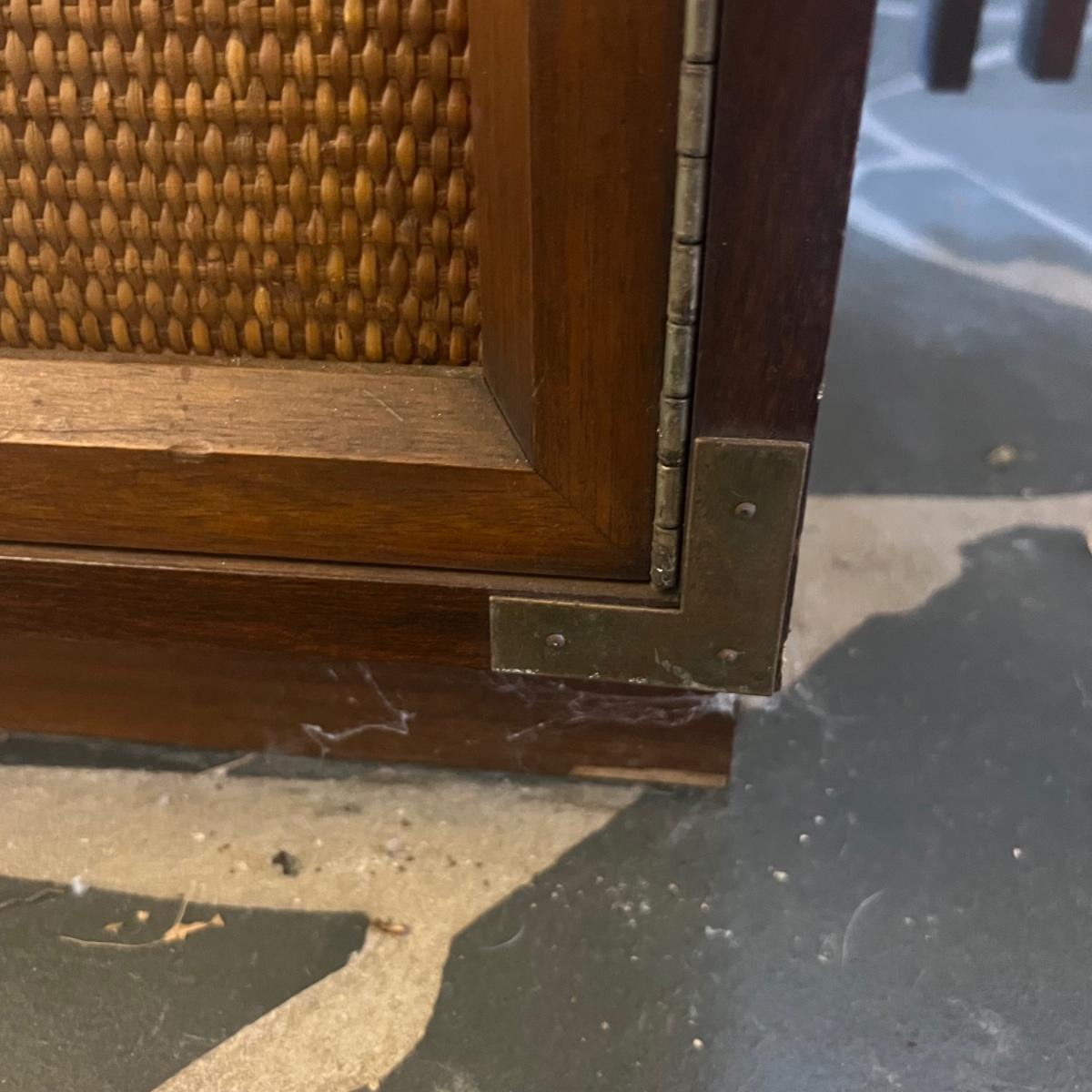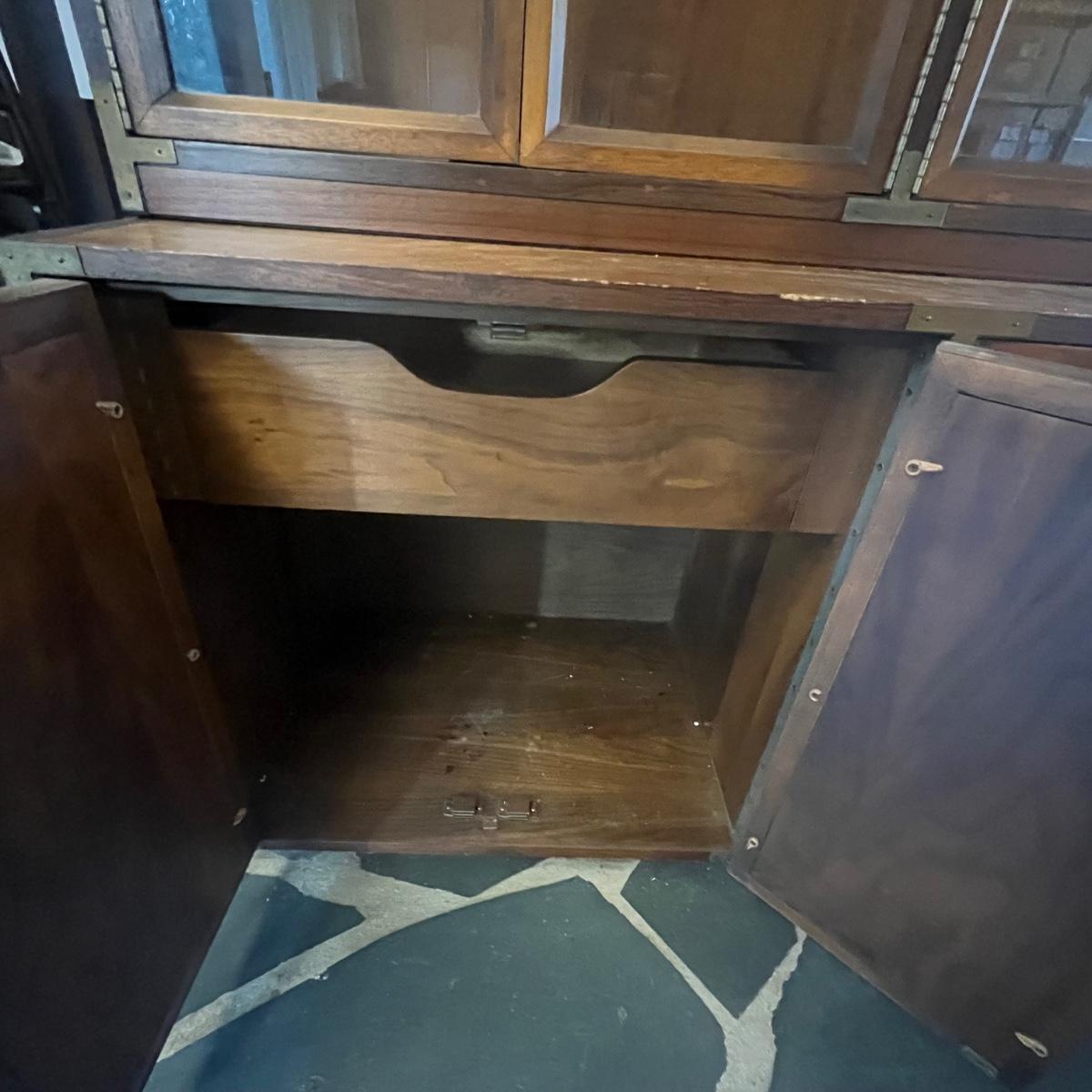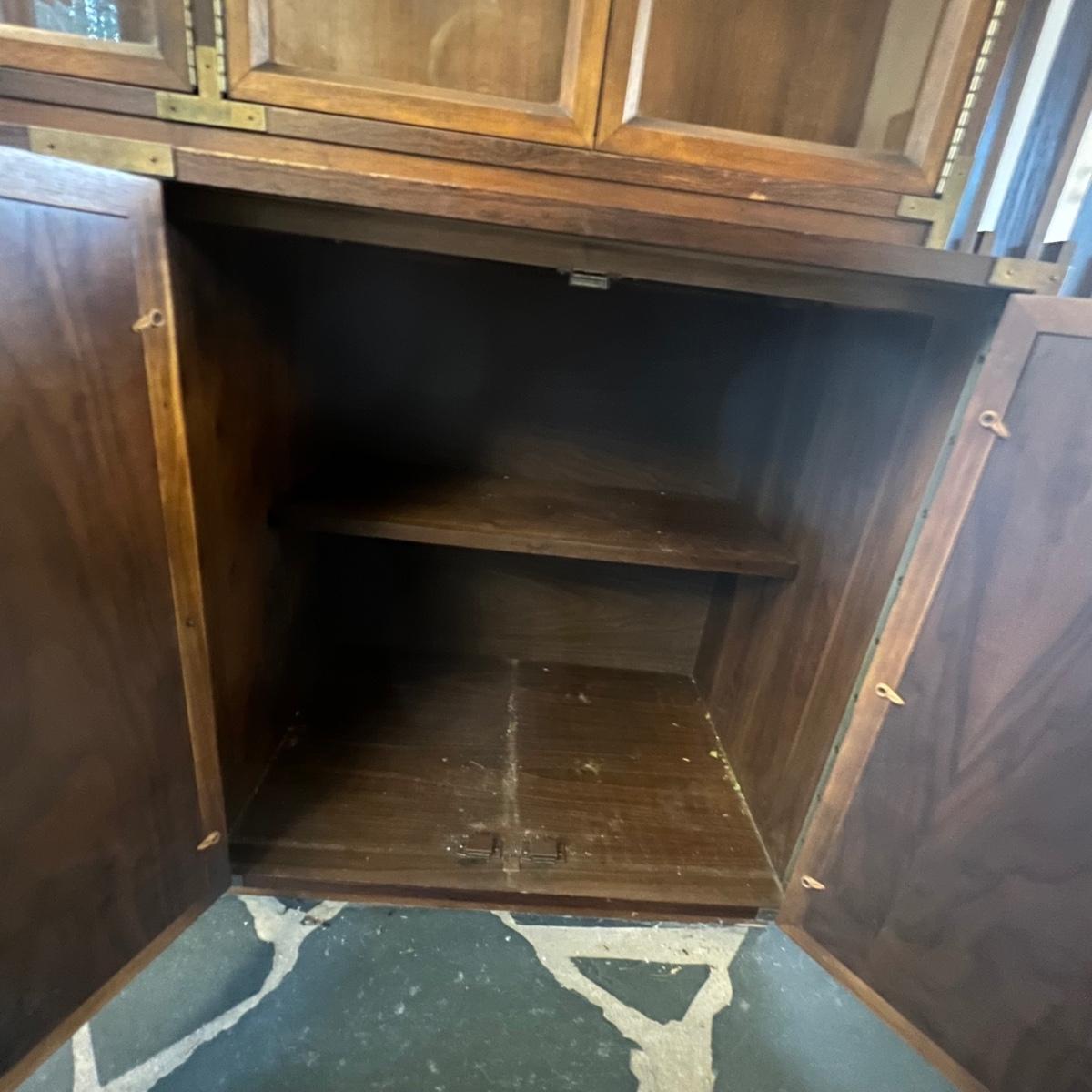 This Lane hutch is two sections; upper section just sits on top of the cabinet which has woven cane door fronts and what appears to be aged brass pulls and corner plates. Right cabinet has a shelf with the left side having one spacious drawer with dovetailed joints (minor blemishes, see images). The display case has lights and glass shelves with plate rails.