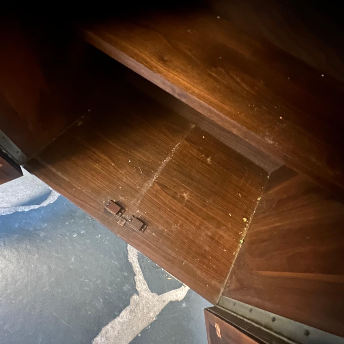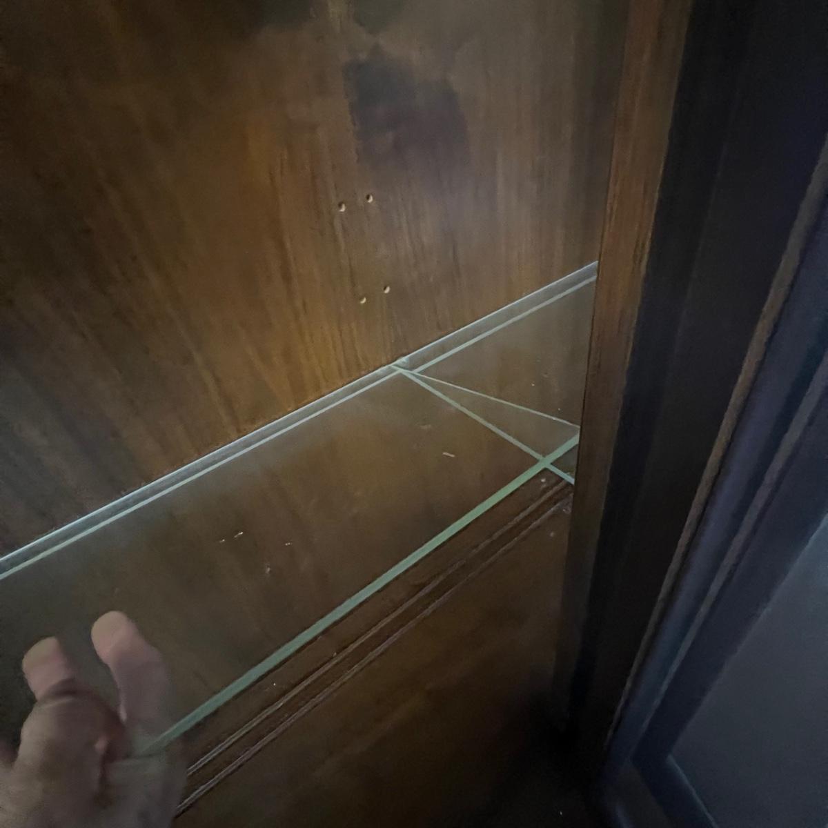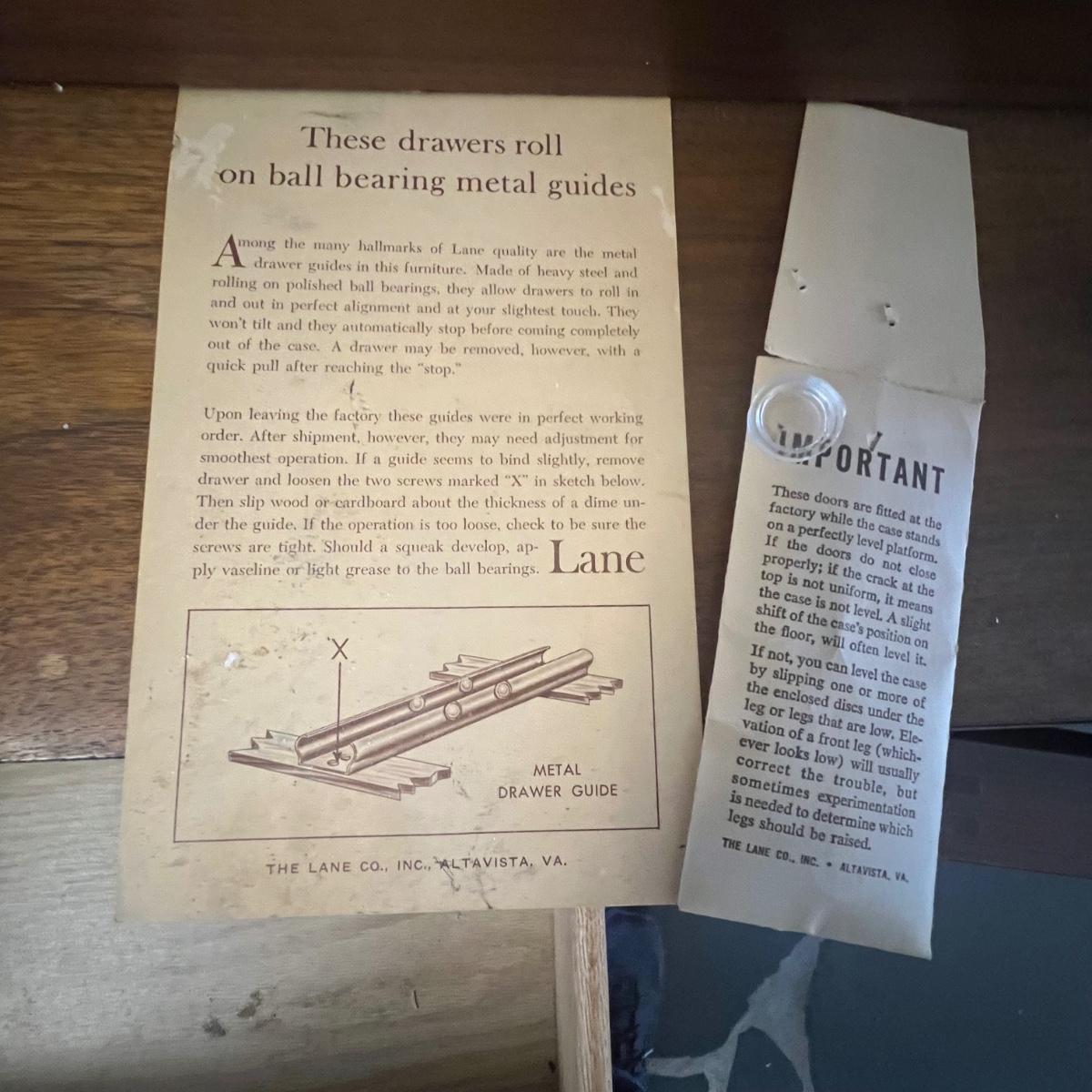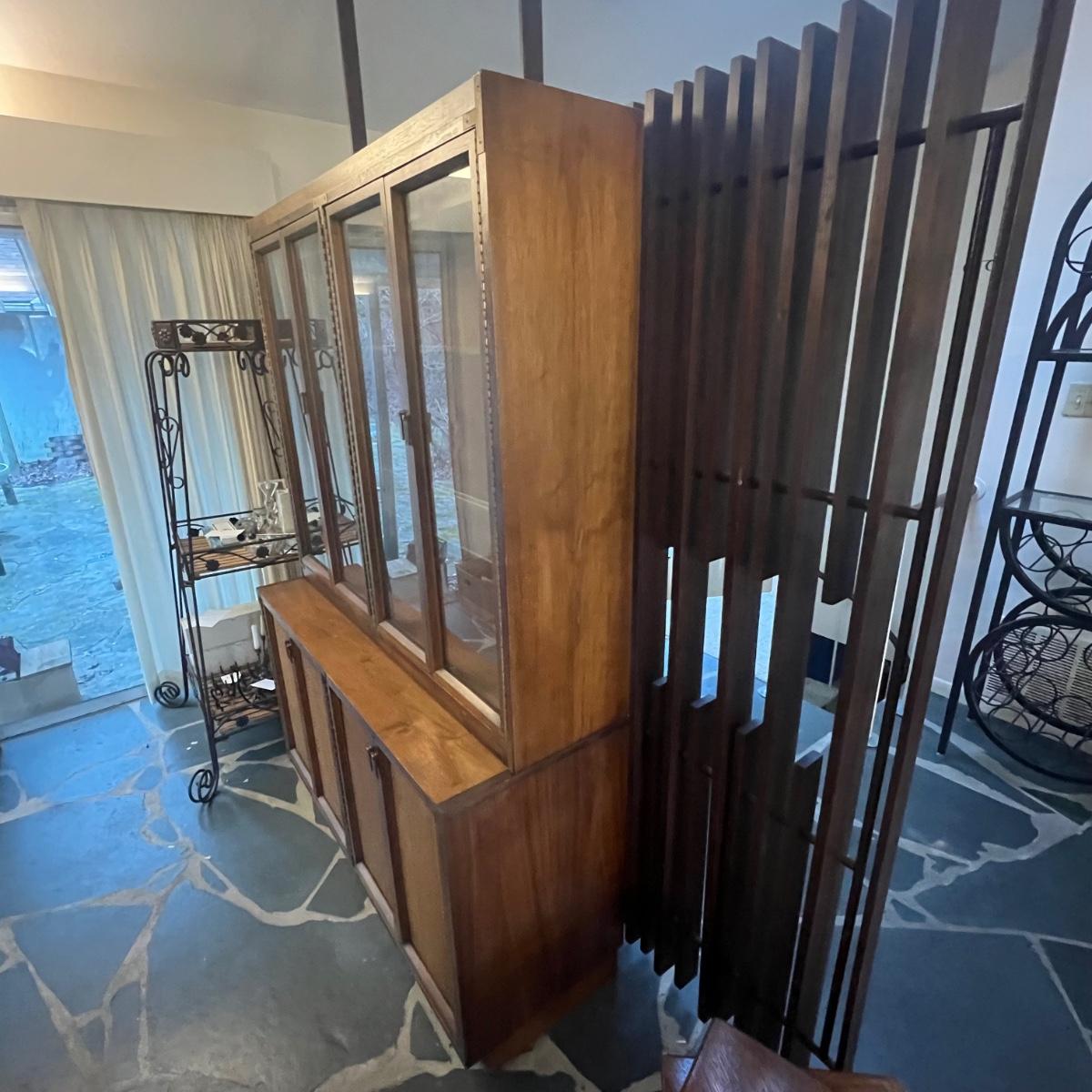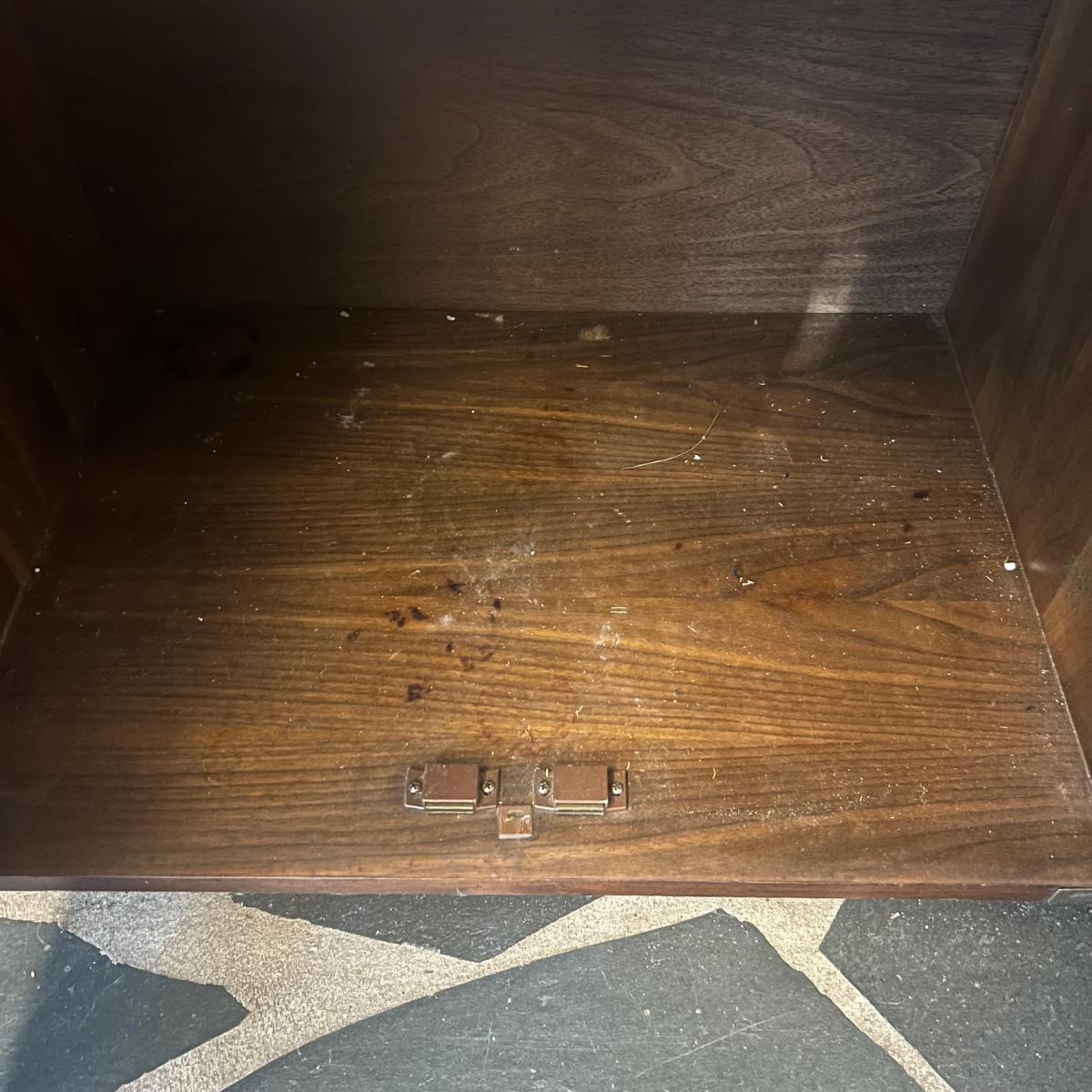This Lane hutch is two sections; upper section just sits on top of the cabinet which has woven cane door fronts and what appears to be aged brass pulls and corner plates. Right cabinet has a shelf with the left side having one spacious drawer with dovetailed joints (minor blemishes, see images). The display case has lights and glass shelves with plate rails.