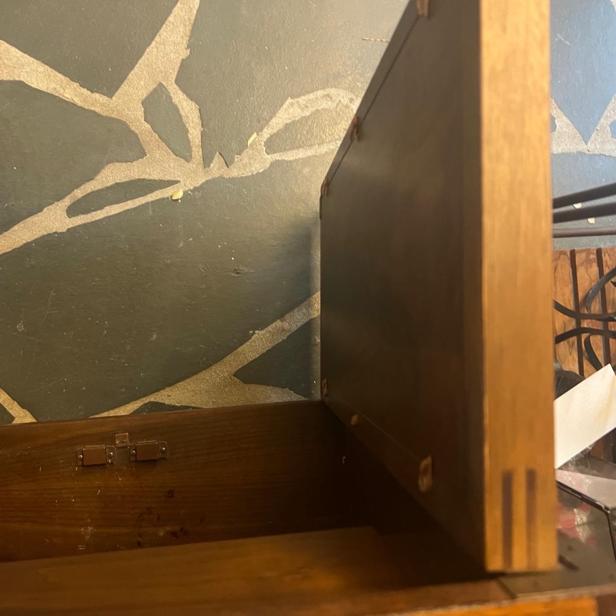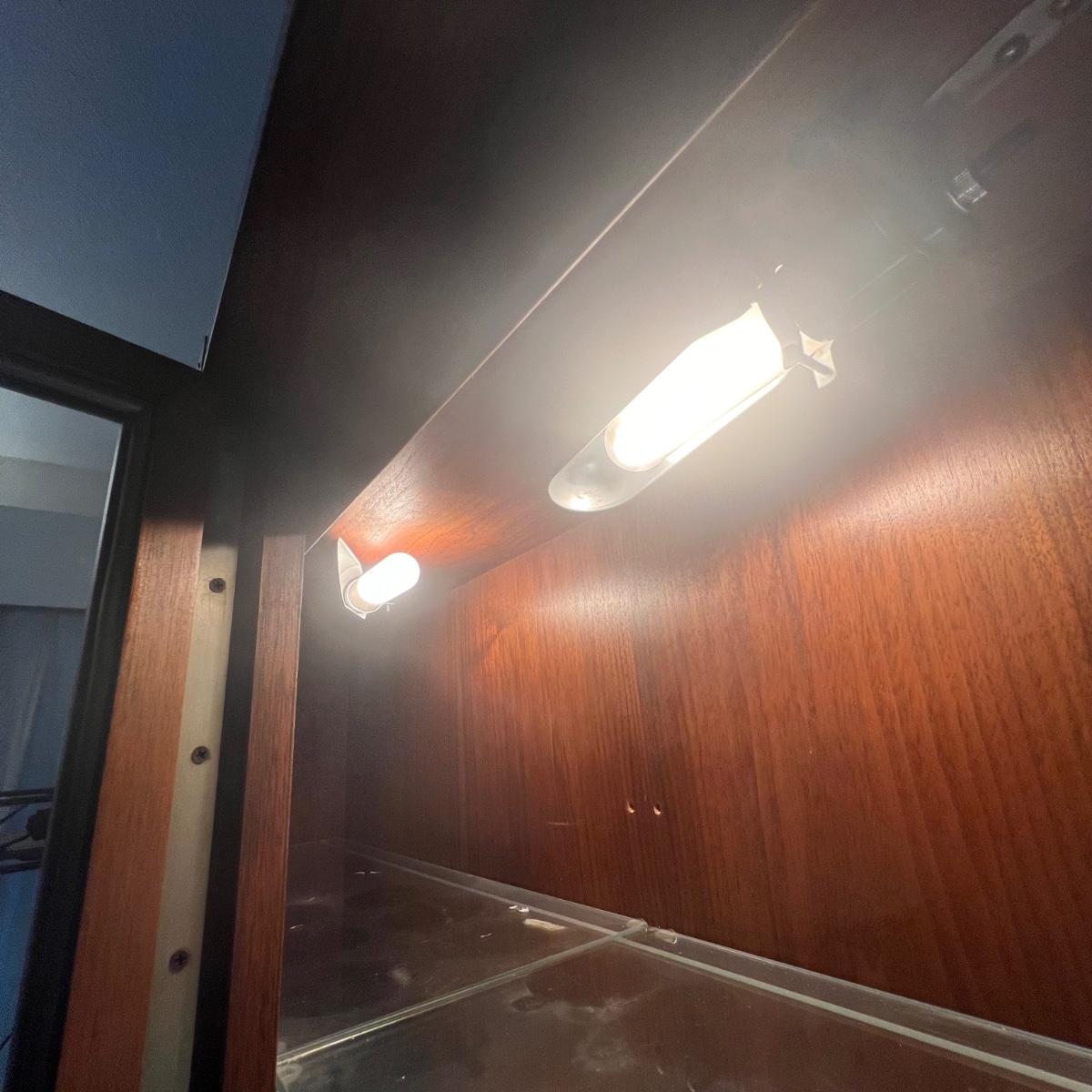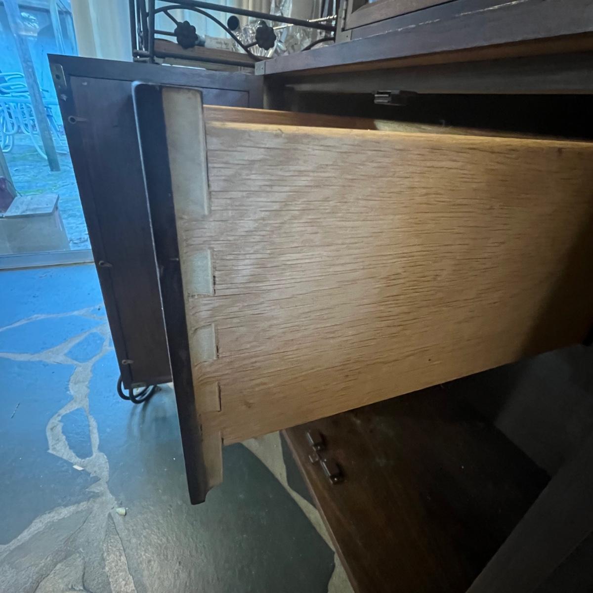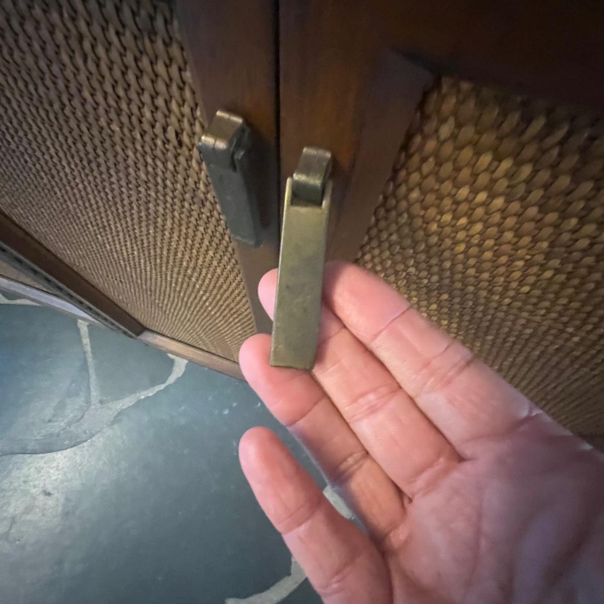 This Lane hutch is two sections; upper section just sits on top of the cabinet which has woven cane door fronts and what appears to be aged brass pulls and corner plates. Right cabinet has a shelf with the left side having one spacious drawer with dovetailed joints (minor blemishes, see images). The display case has lights and glass shelves with plate rails.