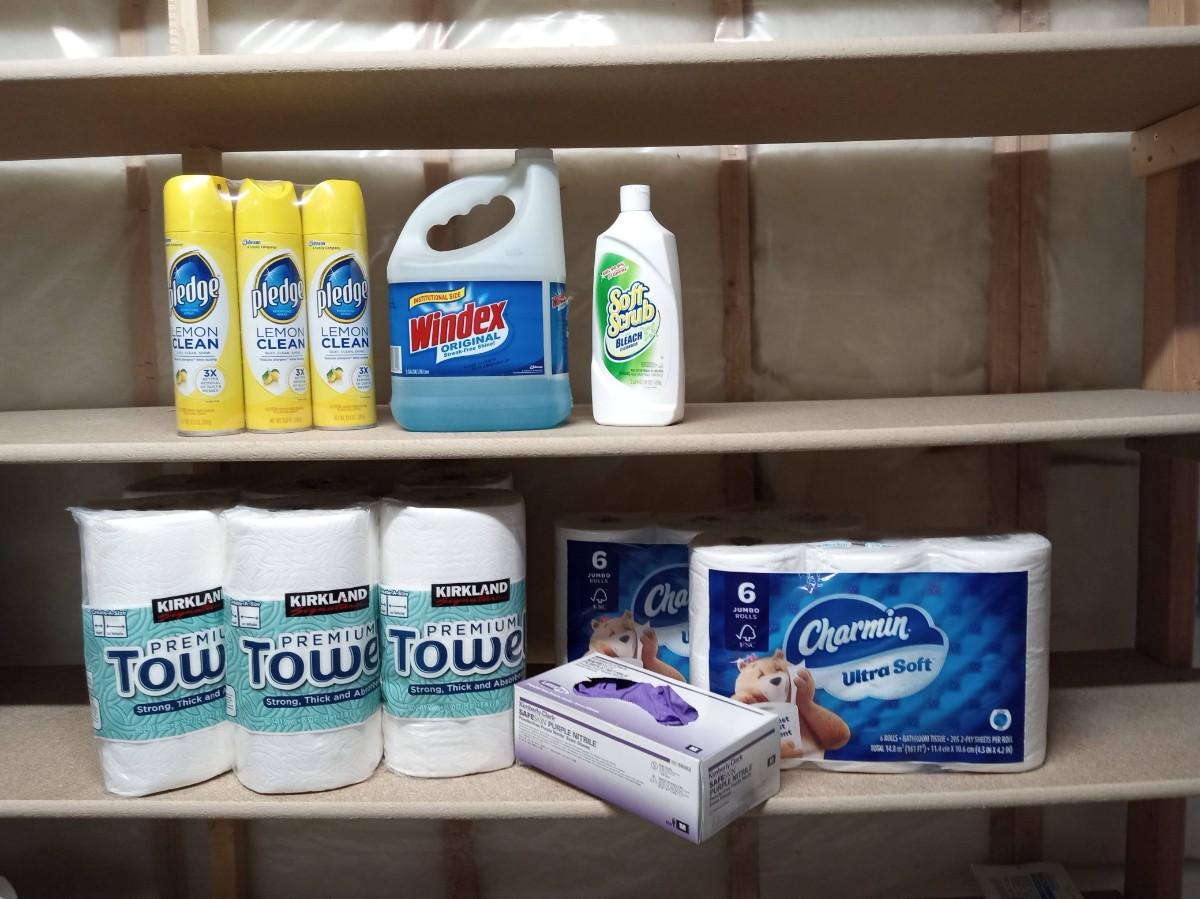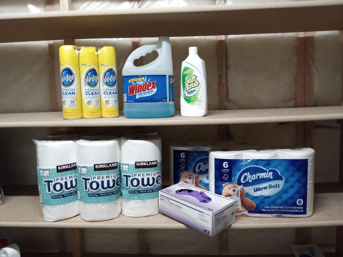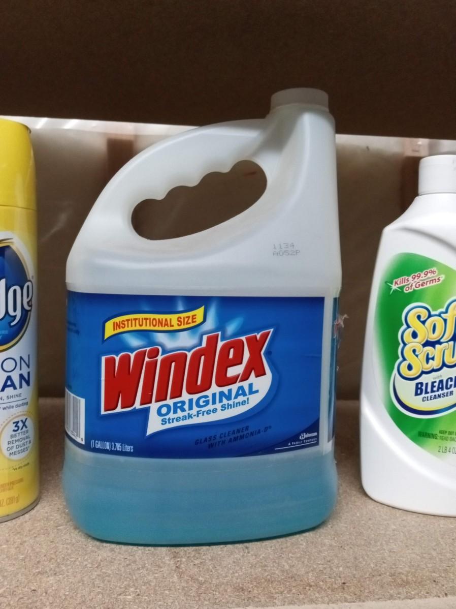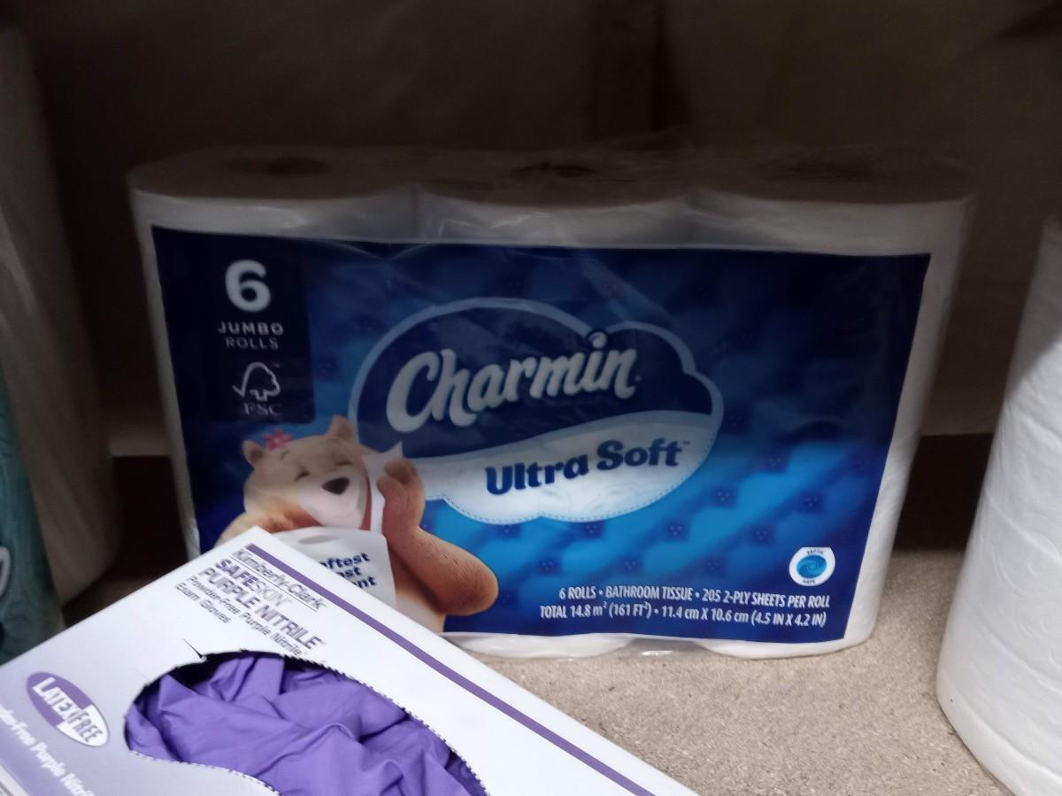 6 ROLLS OF PAPER TOWELS. PARTIAL BOTTLE OF WINDEX, 3 NEW LEMON PLEDGE FURNITURE POLISH AND BOTTLE OF SOFT SCRUB