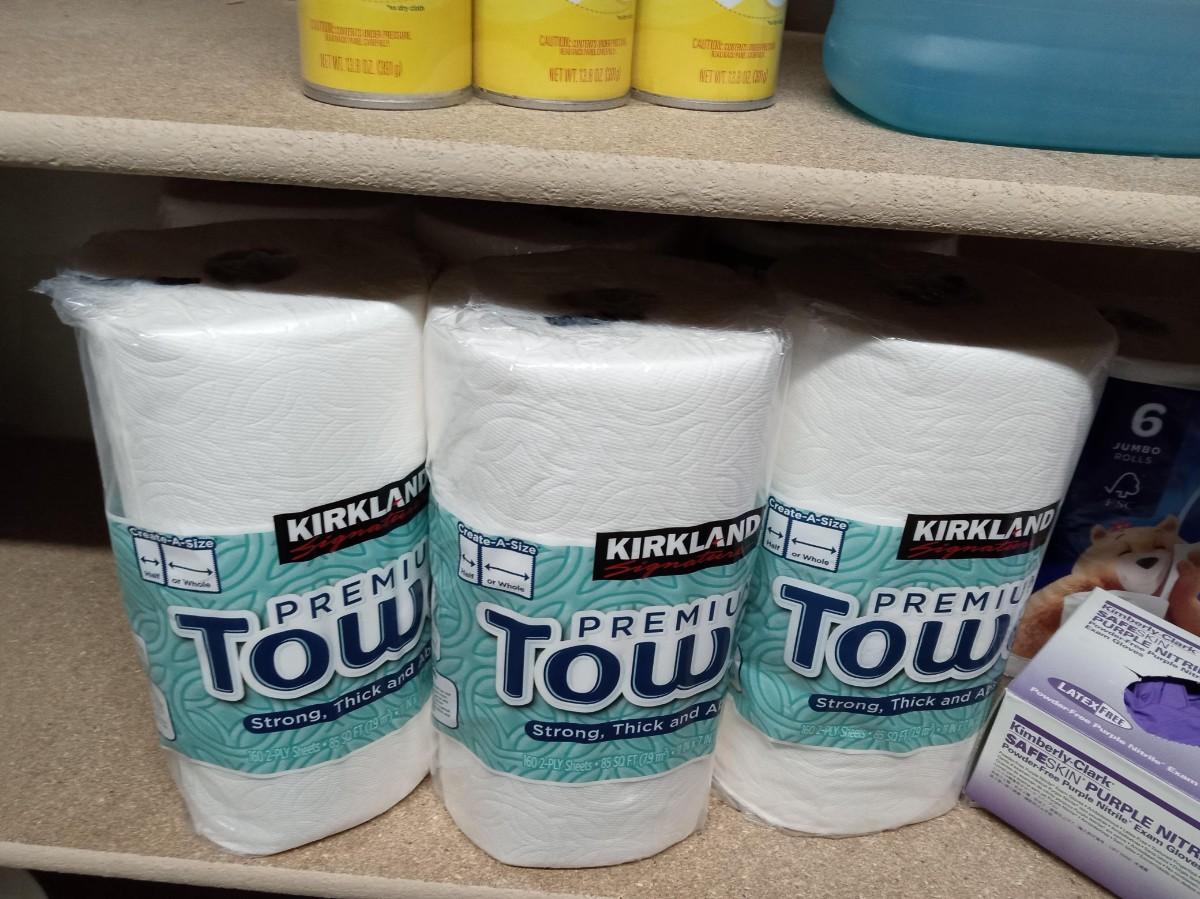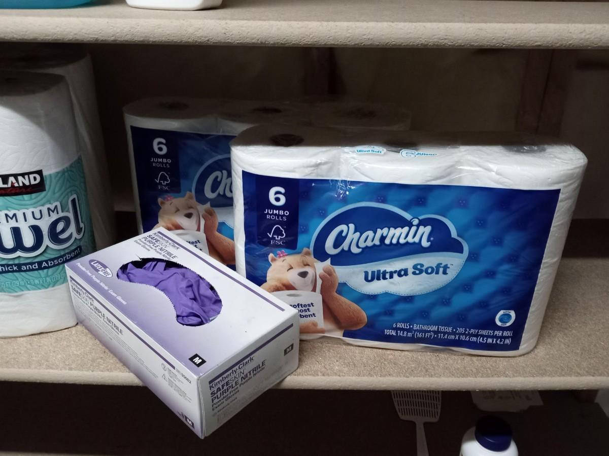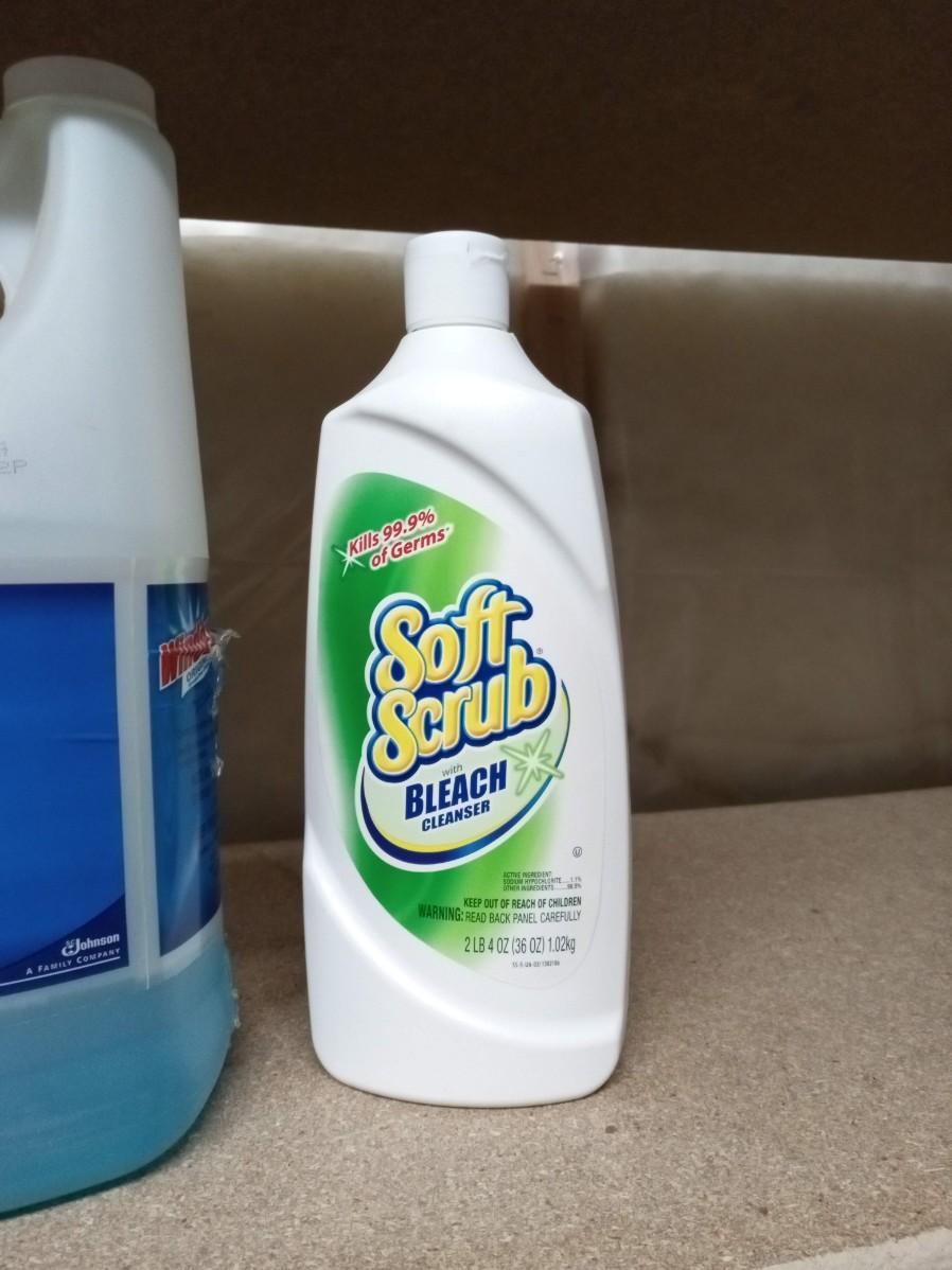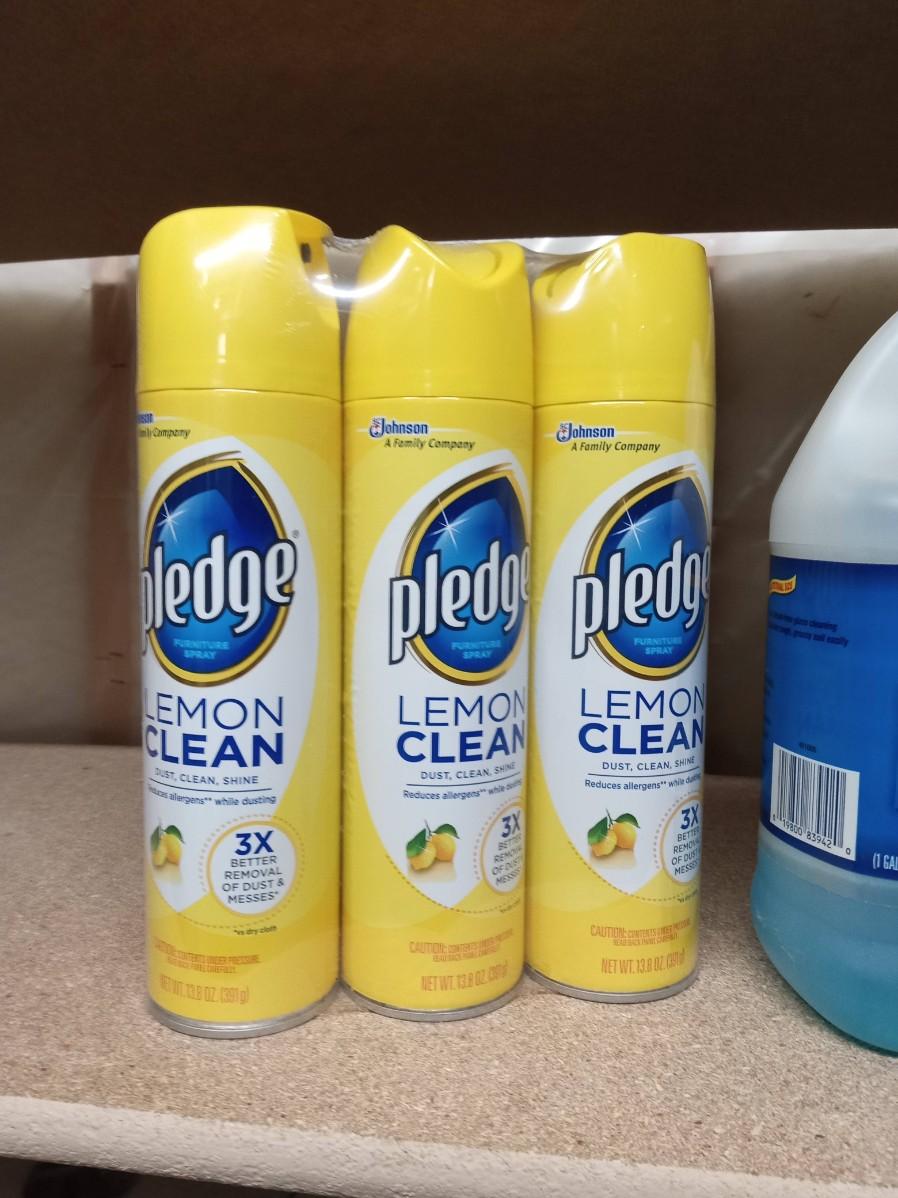 6 ROLLS OF PAPER TOWELS. PARTIAL BOTTLE OF WINDEX, 3 NEW LEMON PLEDGE FURNITURE POLISH AND BOTTLE OF SOFT SCRUB