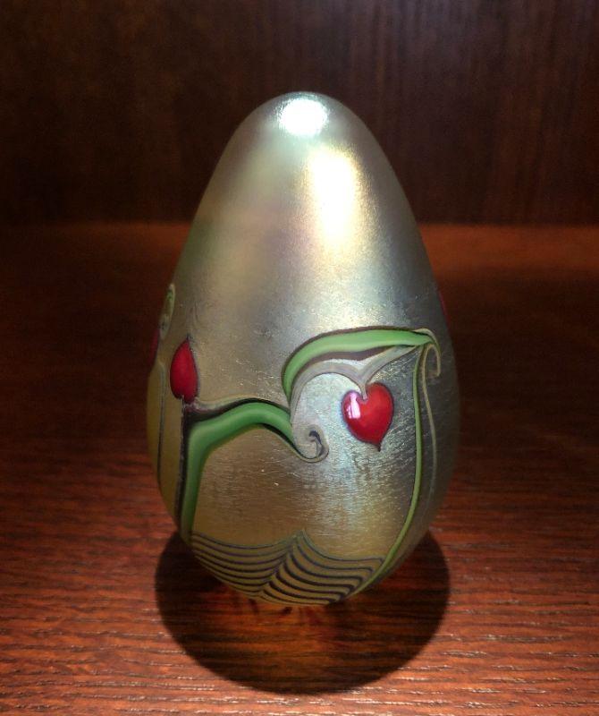 Egg shaped Orient & Flume Paperweight with a hanging hearts design. 4” x 2.25”