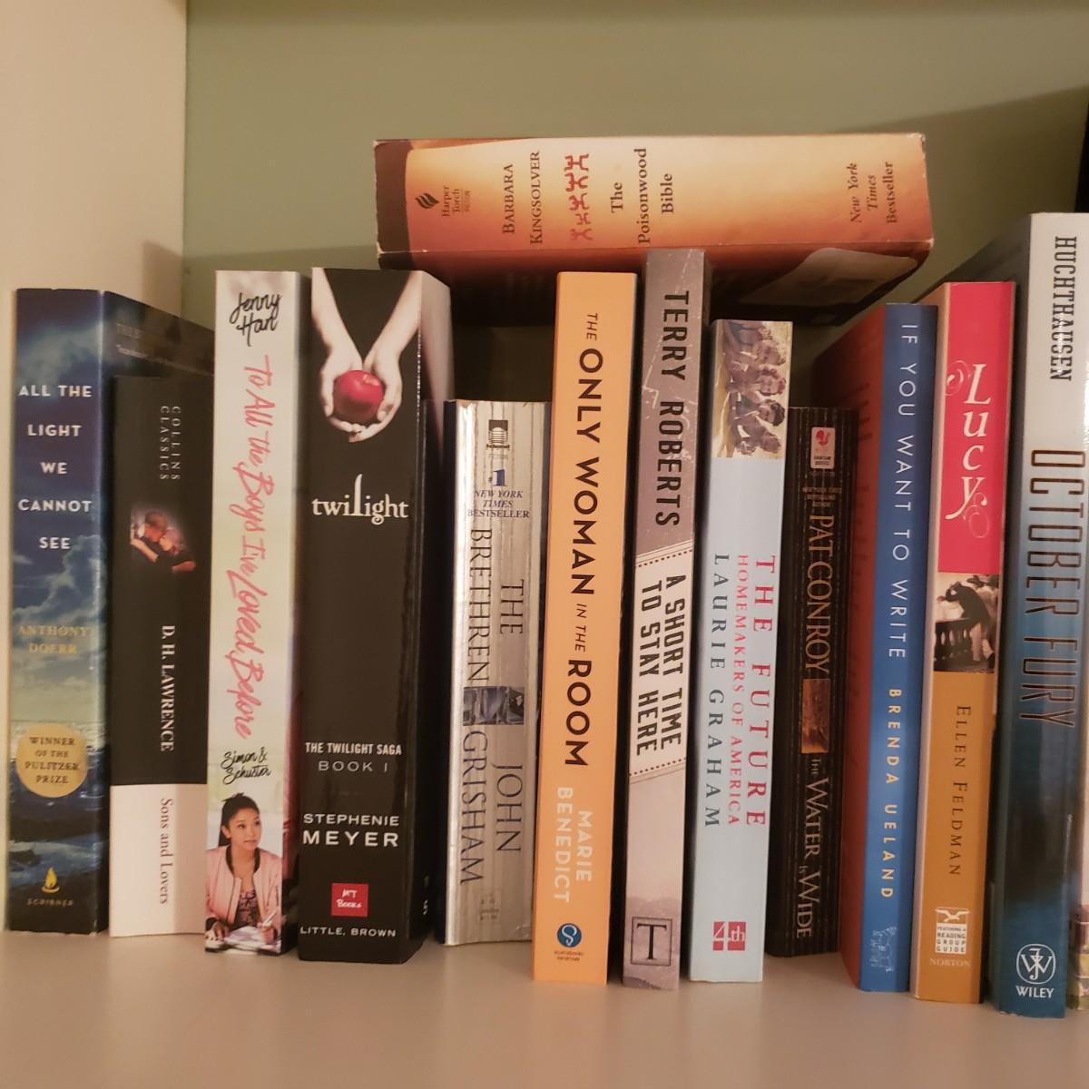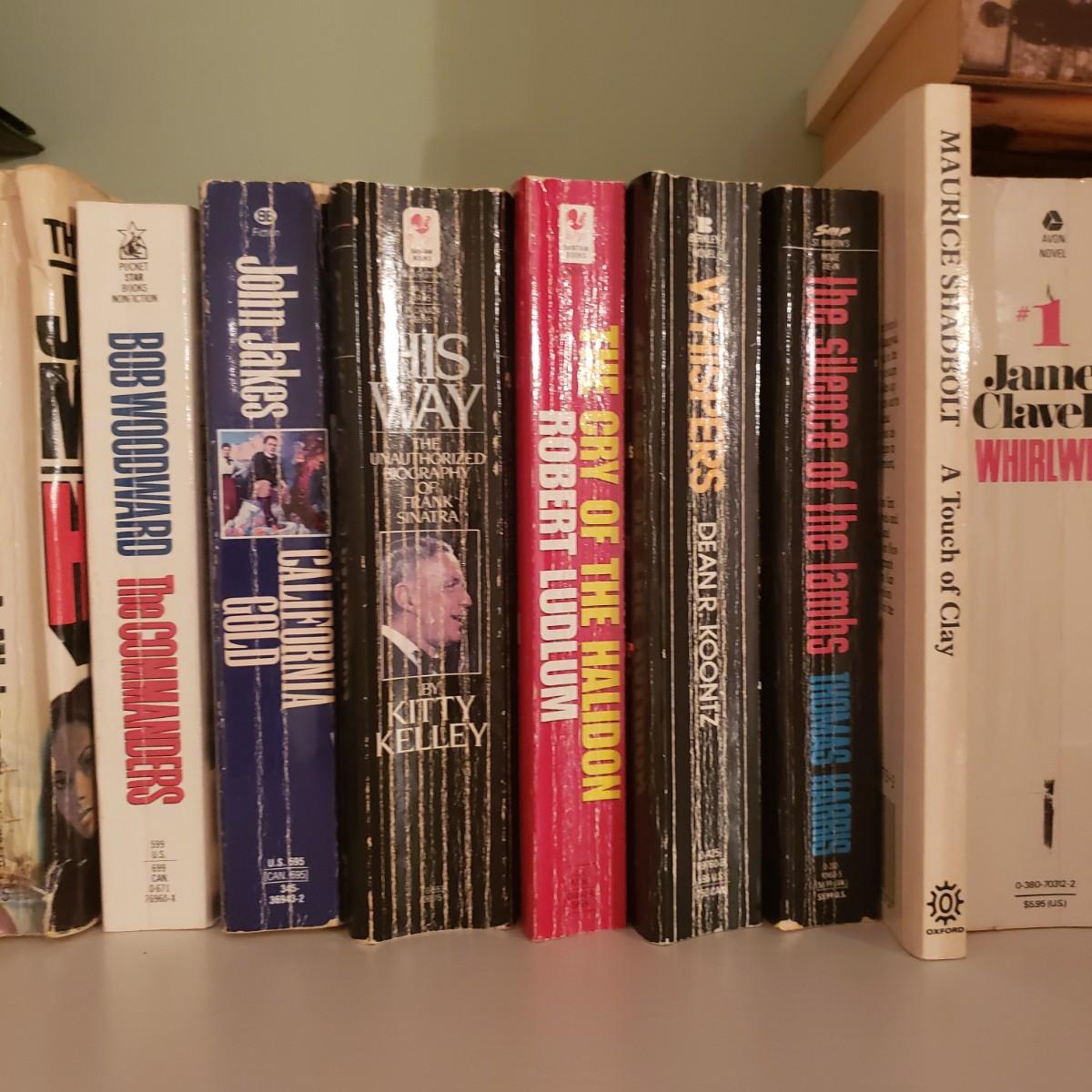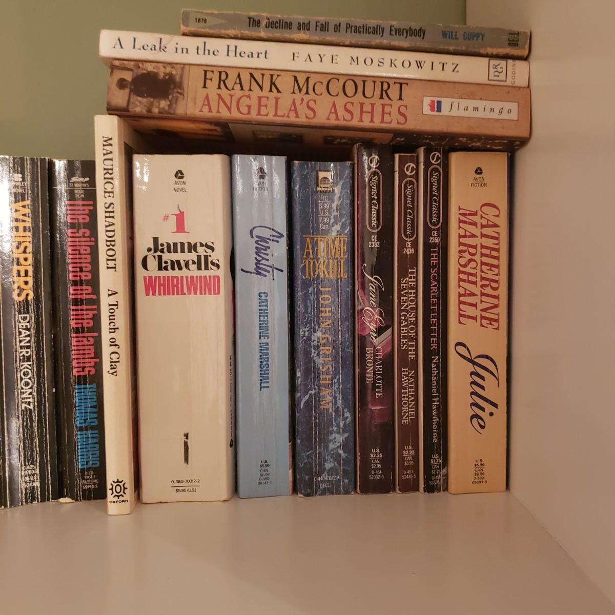 This paperback book lot has a wide variety! See pictures for titles and authors. Also included are plastic book covers, see picture. There is one book cover that is leather and has a book mark string as a bonus!