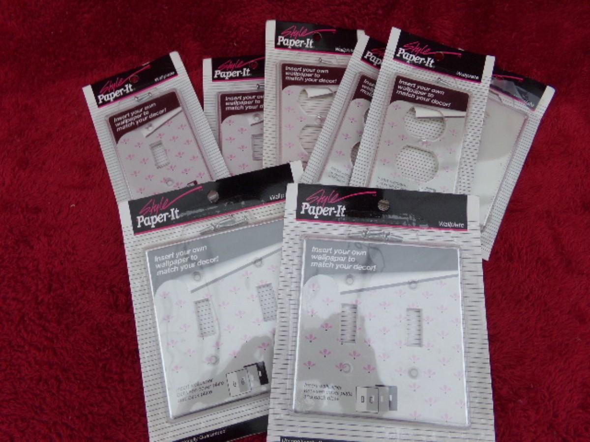 Paper-It outlet & switch cover plates. Insert strips of your wall paper to make it match you walls.