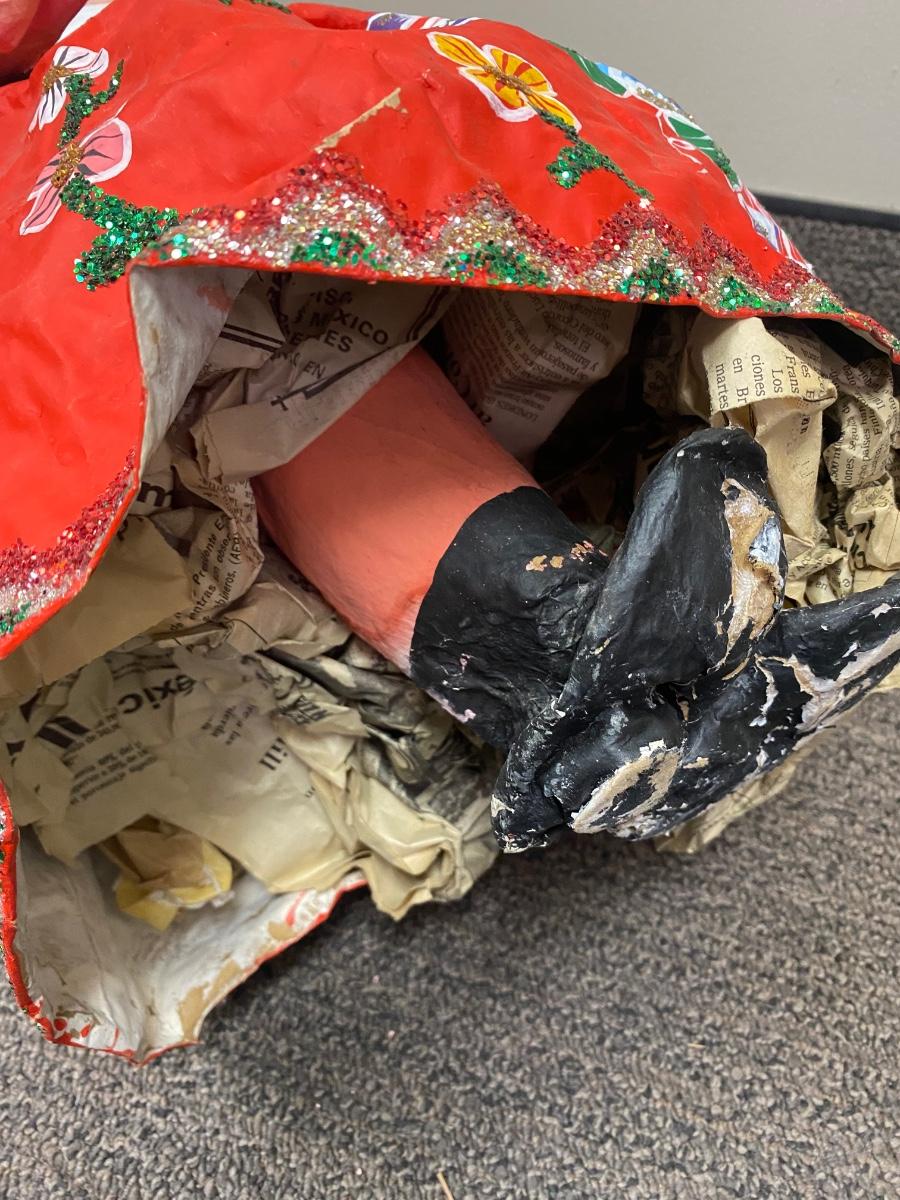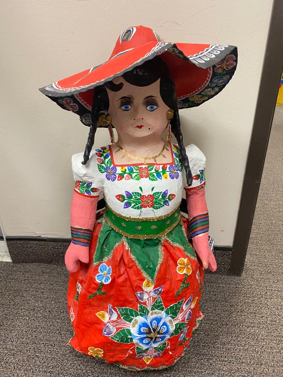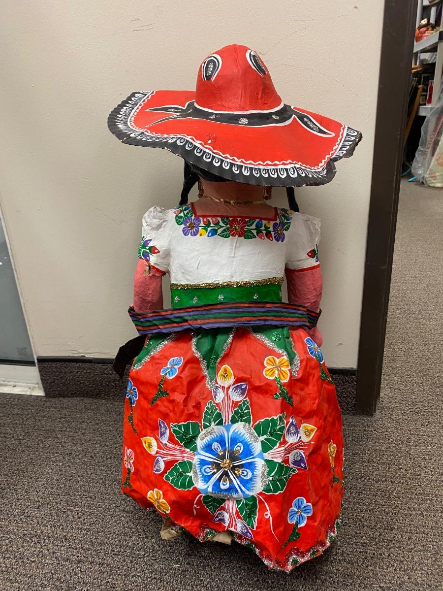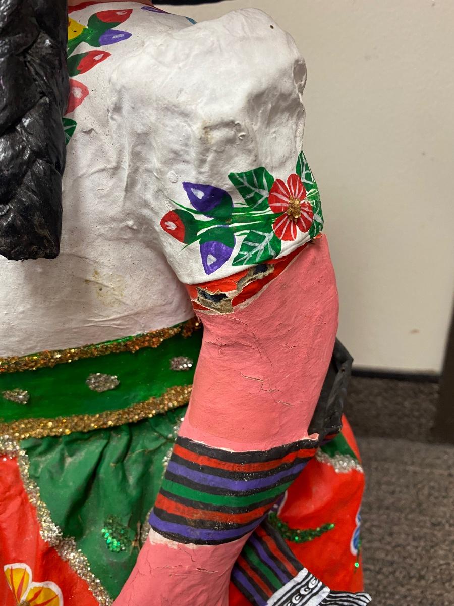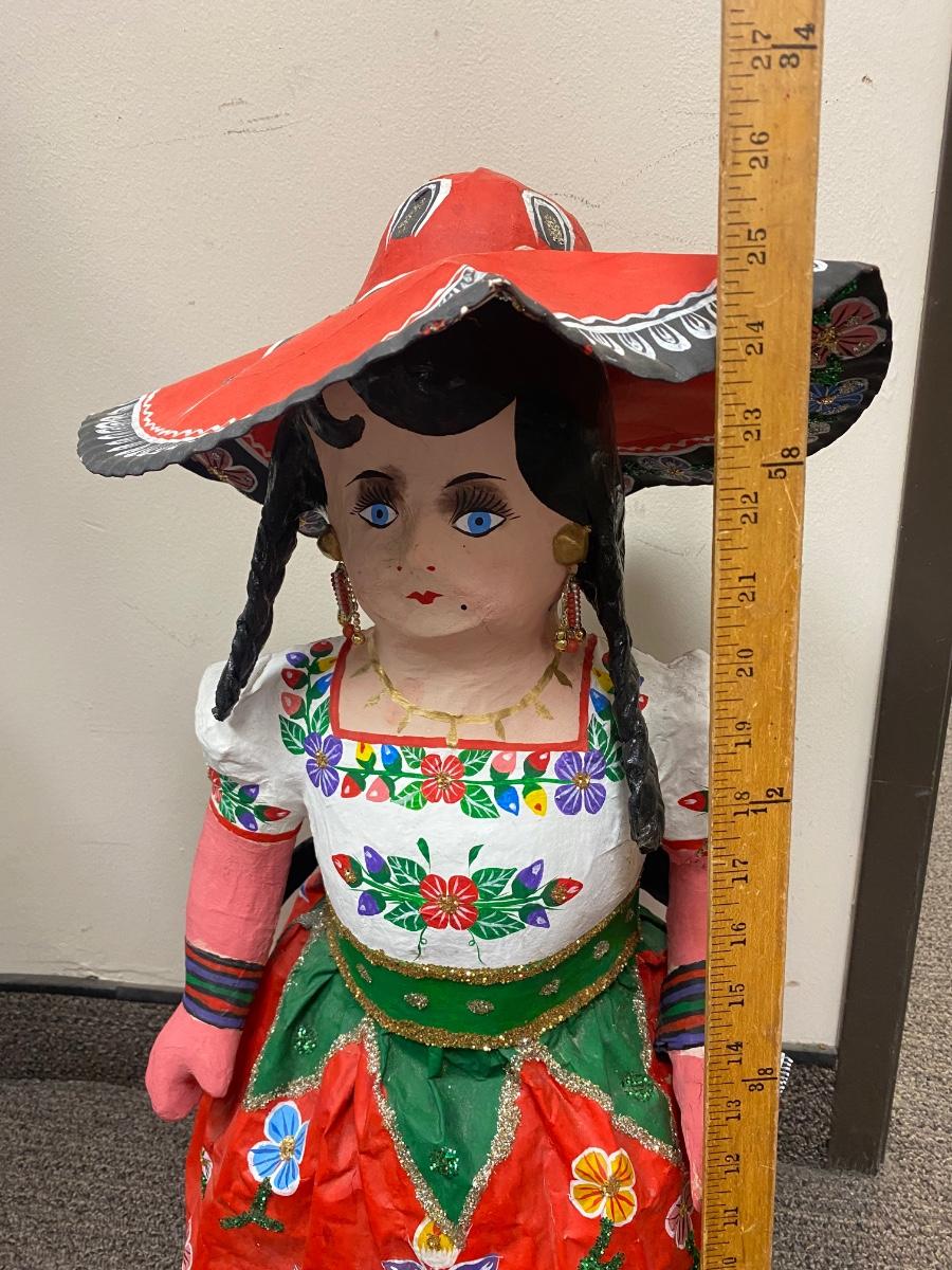 Papier Mache Mexican folk art senora doll. Hand crafted. It does have damage to one arm and signs of wear. Large, about 26" size.
