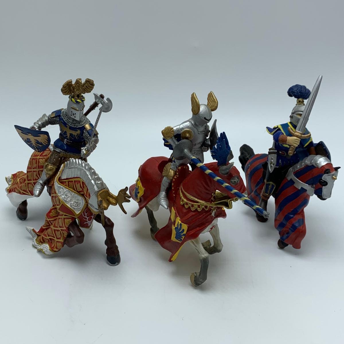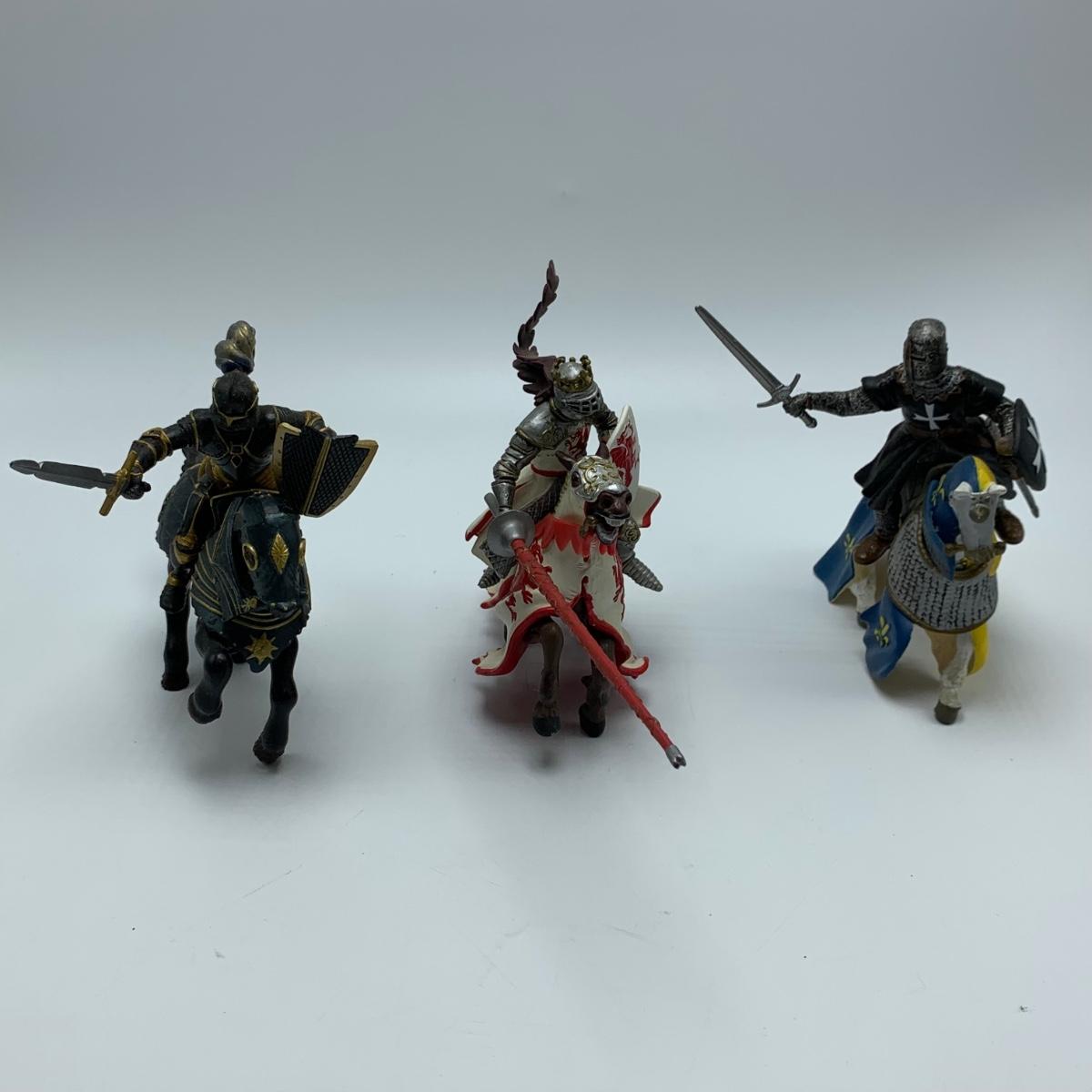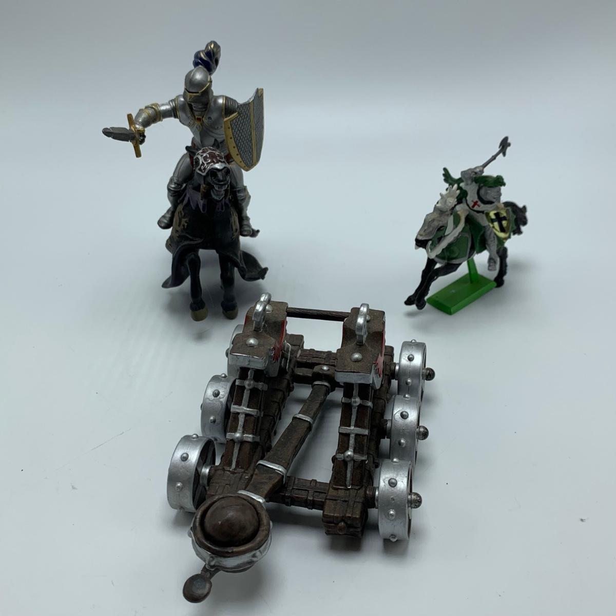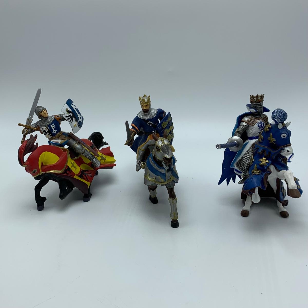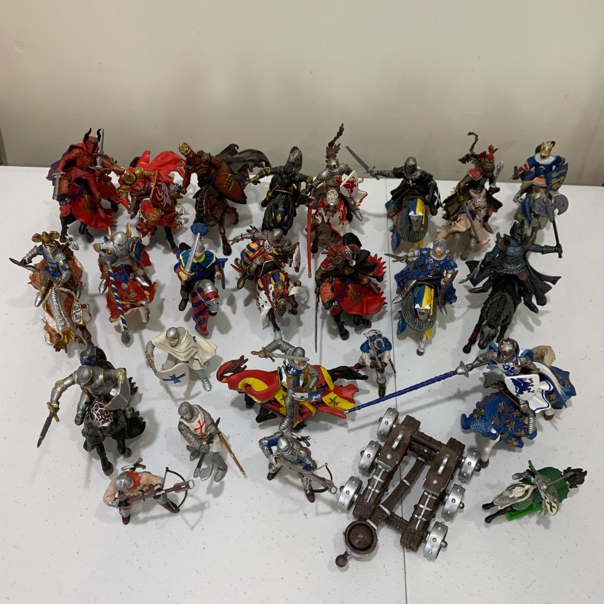 A large collection of mostly Papo brand action figures including 19 knights on horses and five standing knight figurines, as well as one catapult. The knights without the horses are approximately 4” tall.