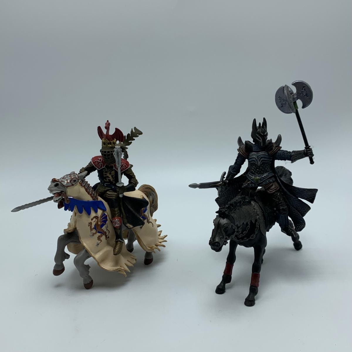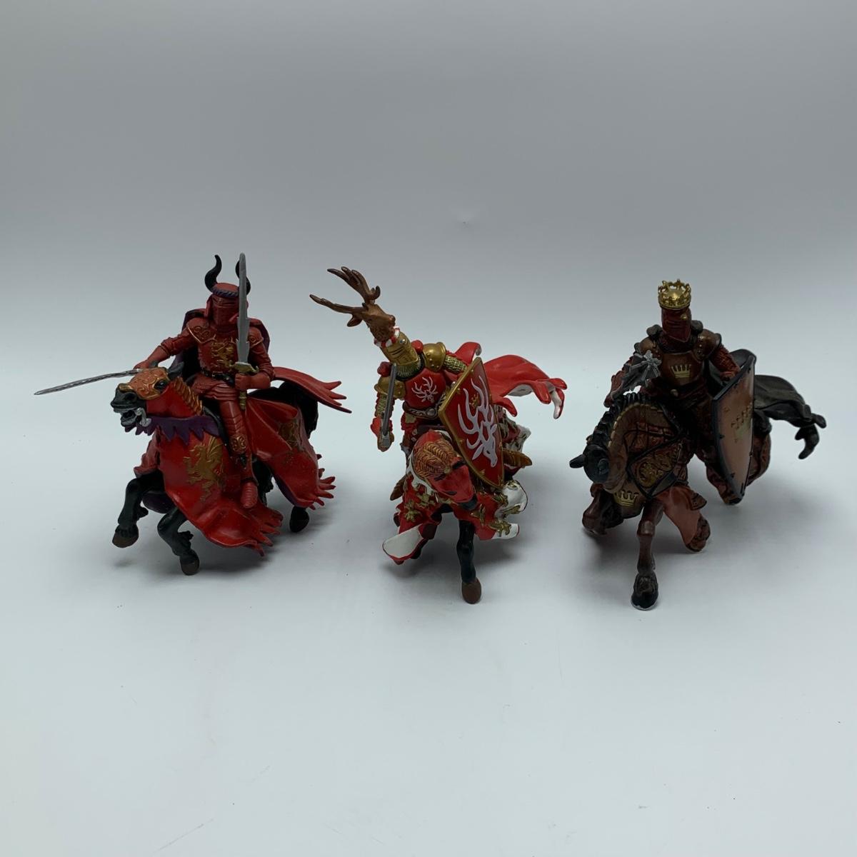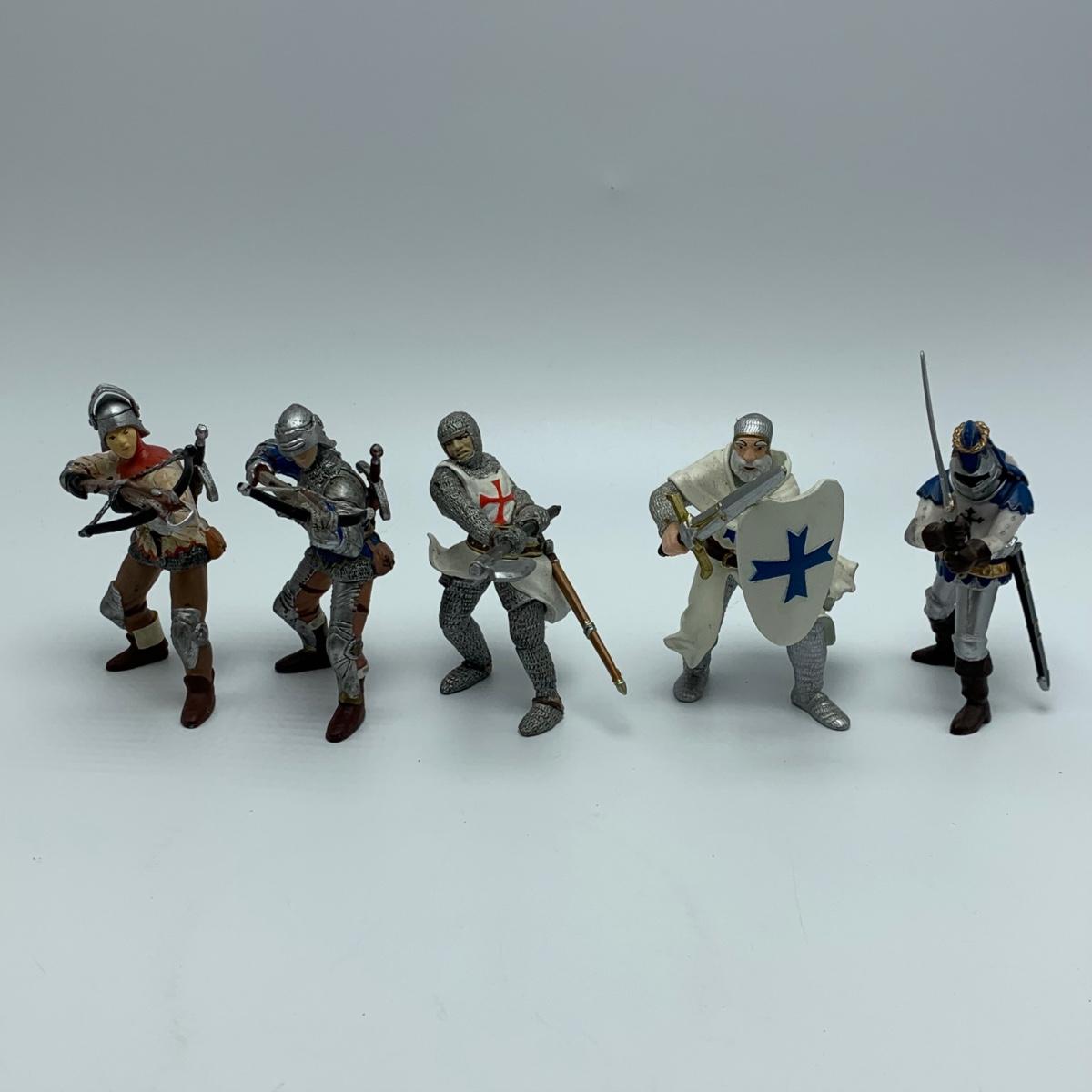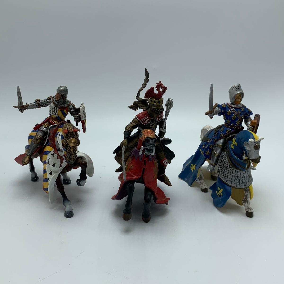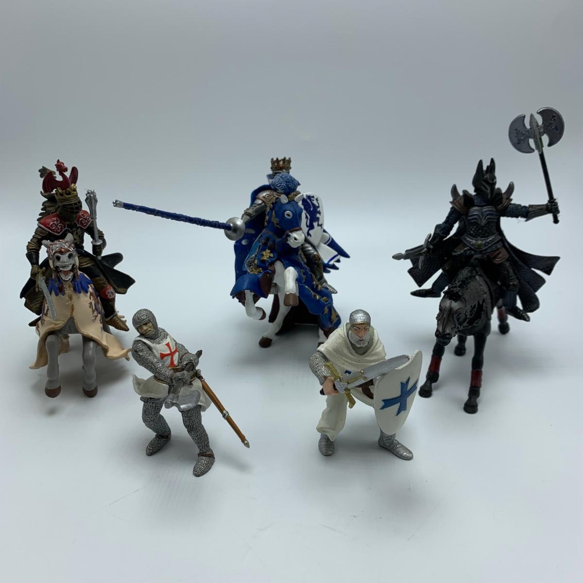 A large collection of mostly Papo brand action figures including 19 knights on horses and five standing knight figurines, as well as one catapult. The knights without the horses are approximately 4” tall.