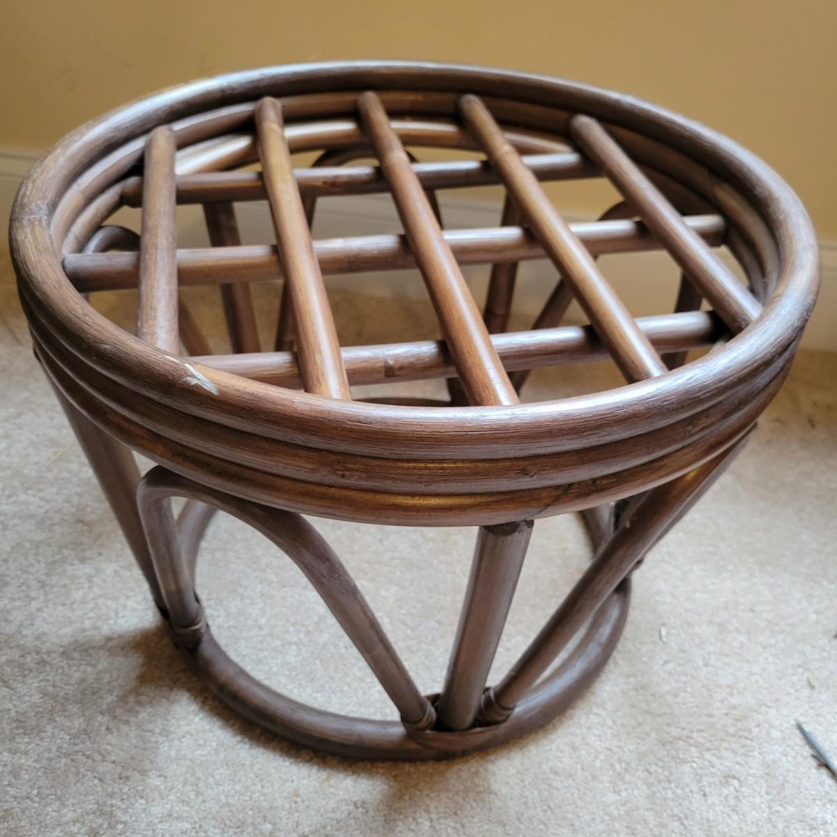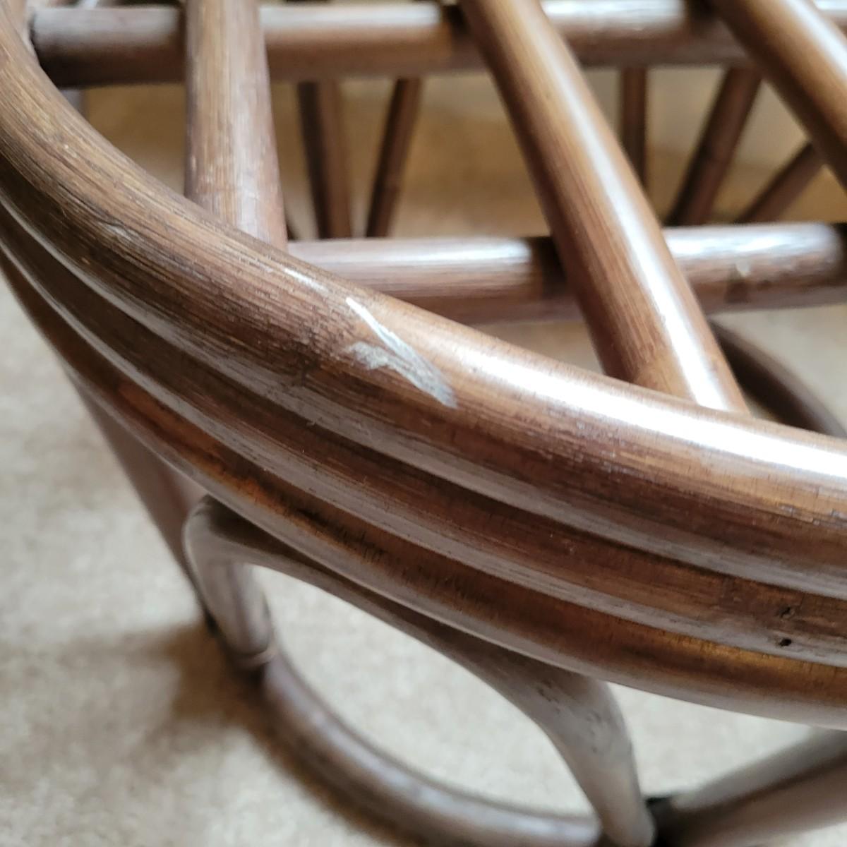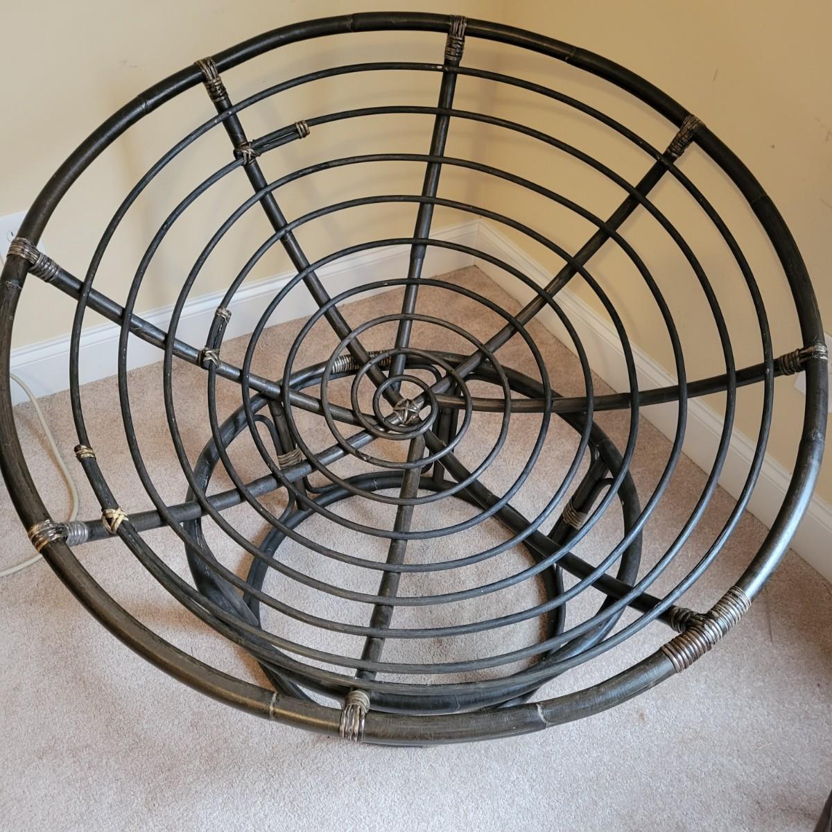 A bamboo papasan chair with a velvet-like camel colored cushion and a footstool. Papasan measures approximately 46"D x 31" H. Local pickup only.