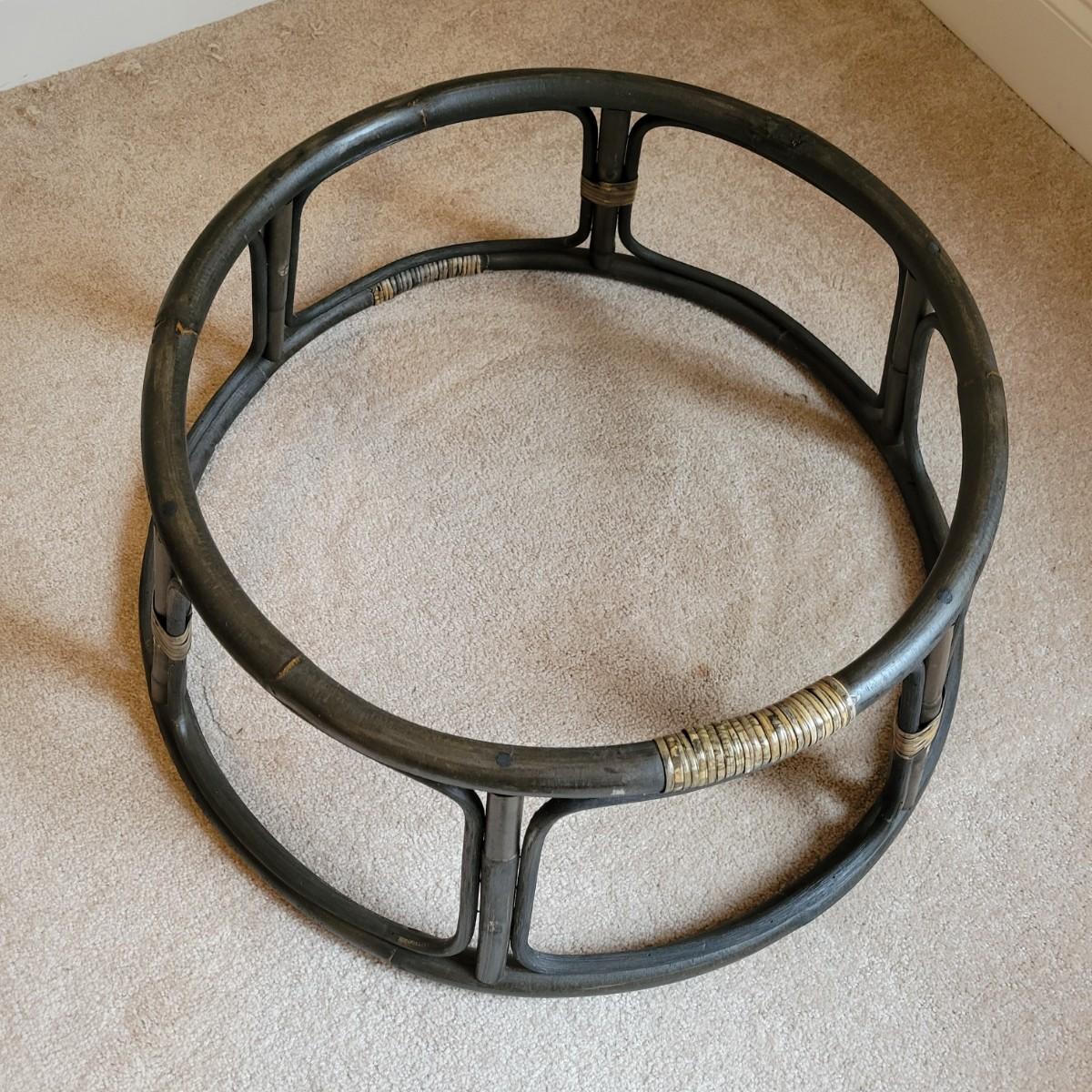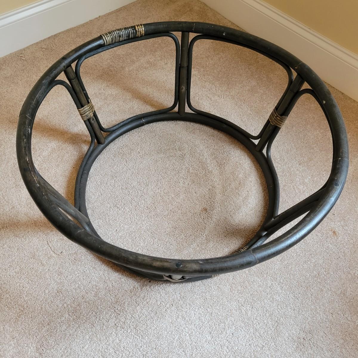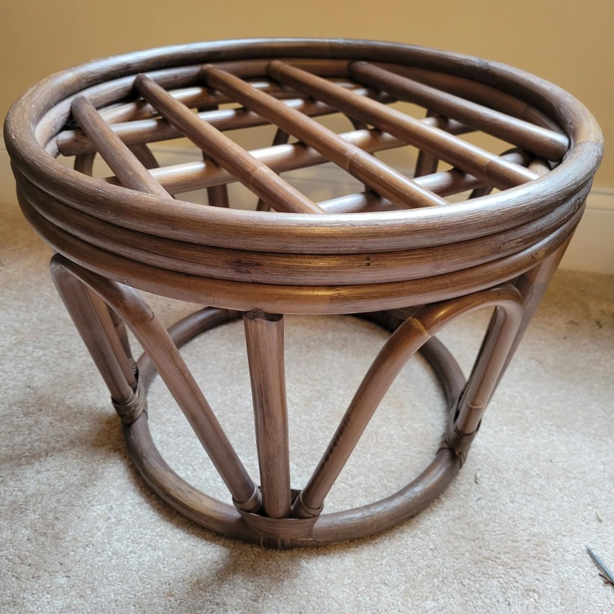 A bamboo papasan chair with a velvet-like camel colored cushion and a footstool. Papasan measures approximately 46"D x 31" H. Local pickup only.