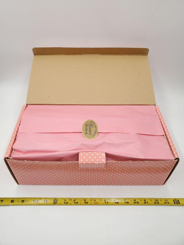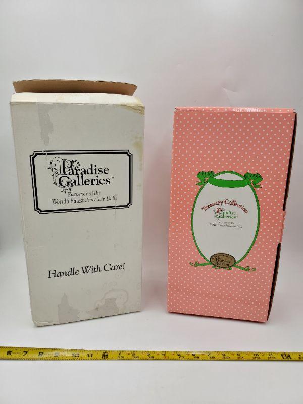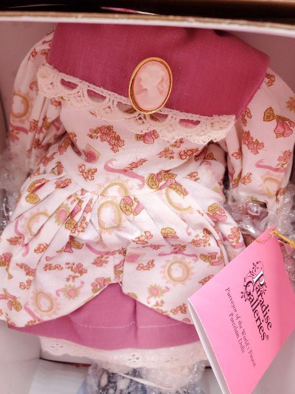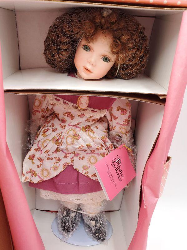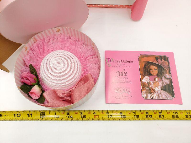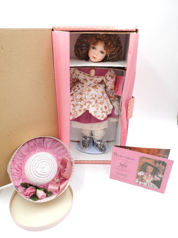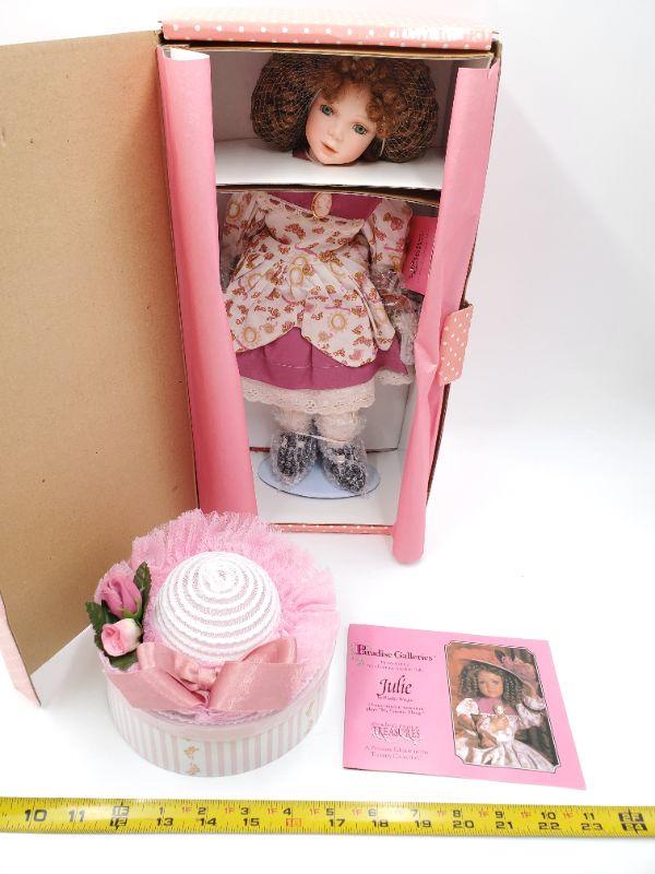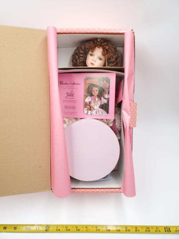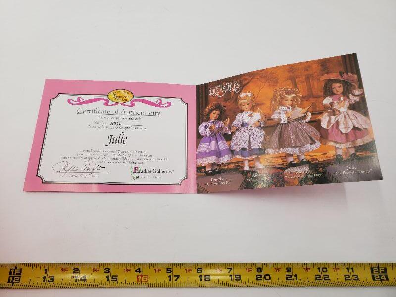 This doll is new in box, she has been stored in her original packaging and never taken out. Julie is her name, she has been handcrafted and comes with Certificate of Authenticity. 18-note musical movement plays "My Favorite Things "