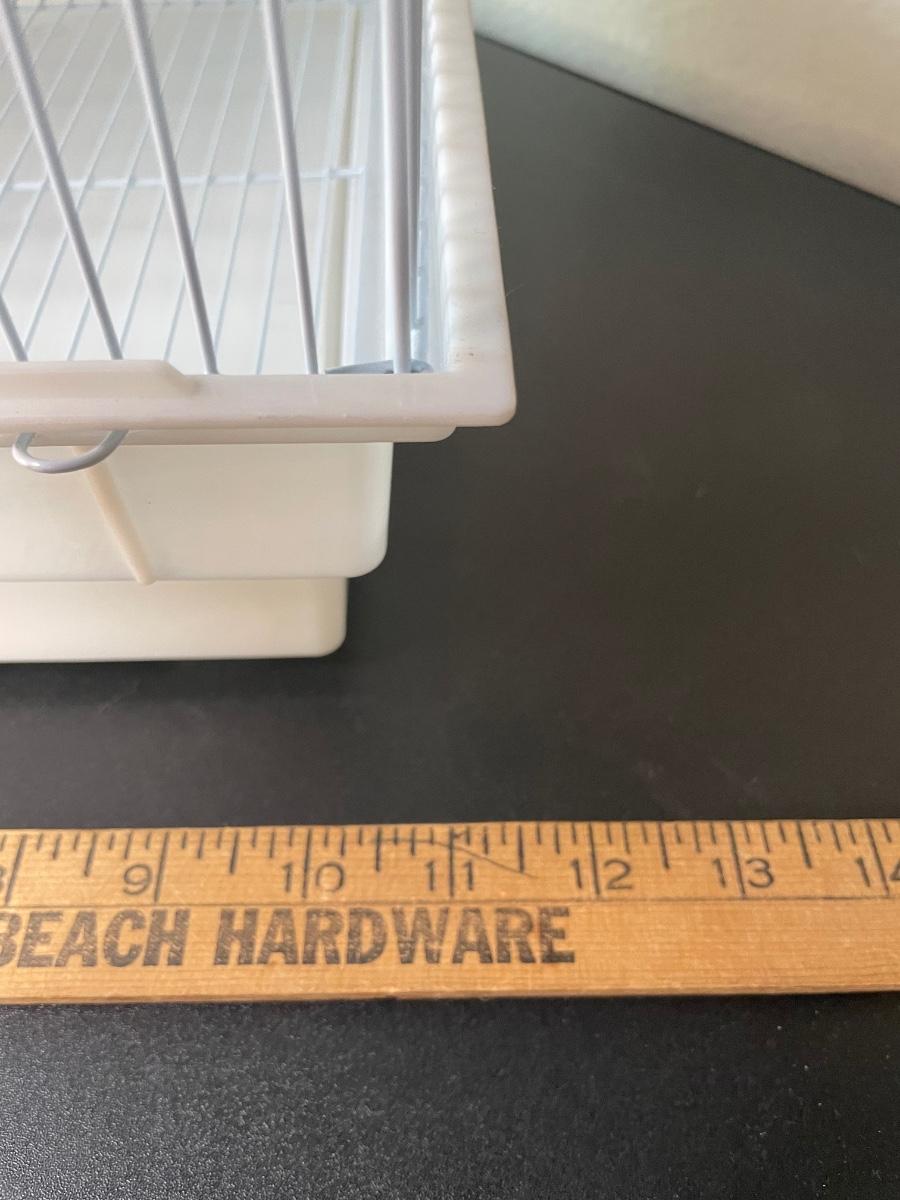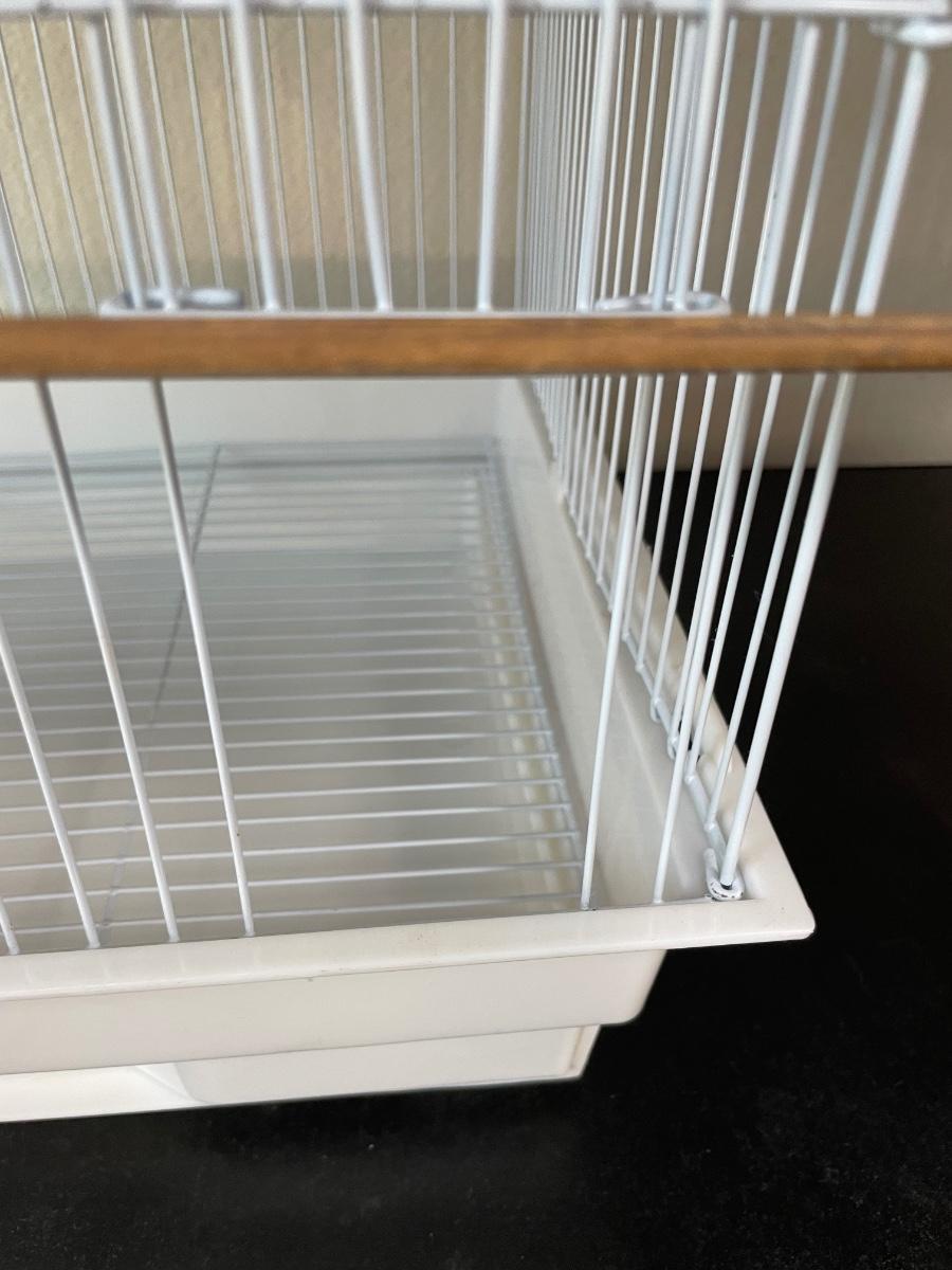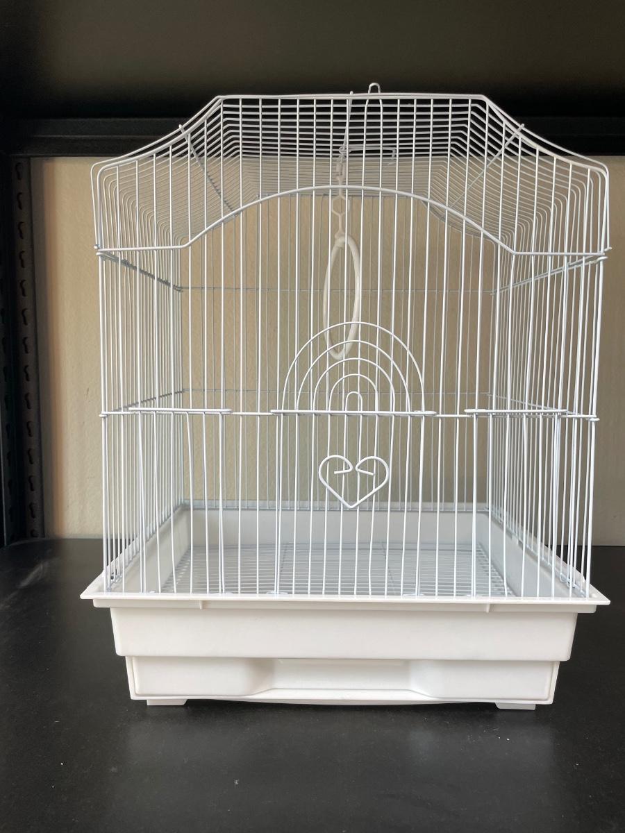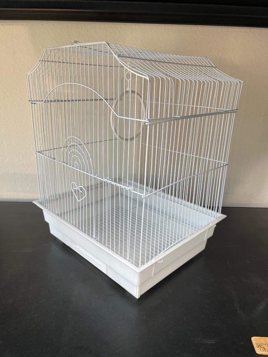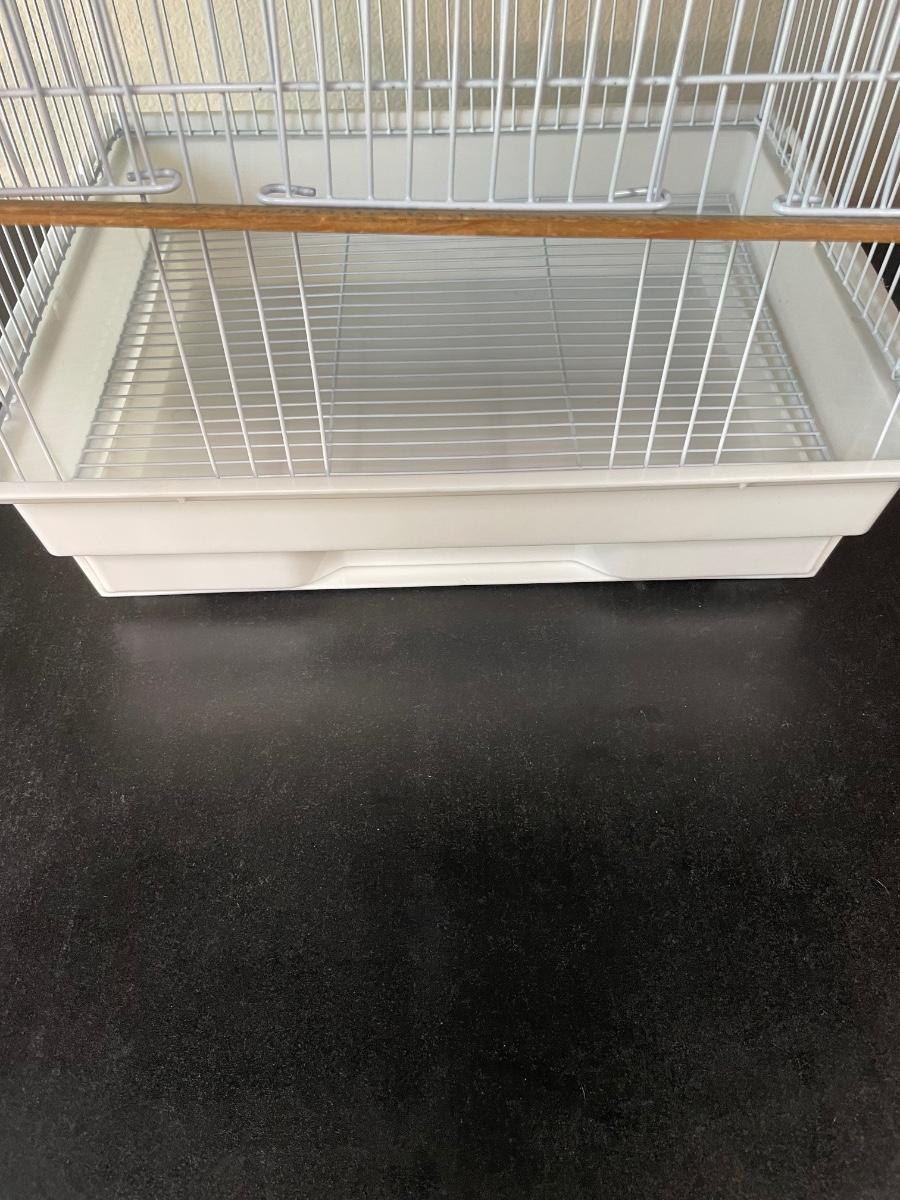With ring perch and removable bottom drawer. In good condition, very clean. 3 sliding door openings for food, water and entry/exit. Approx. 17" tall.