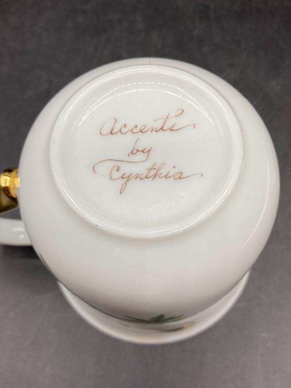Parakeet tea/coffee cup. Made by Accents by Cynthia. Has a green bird on one side and a blue one on the other. Gold along rim and handle is worn in spots. About 3.5".