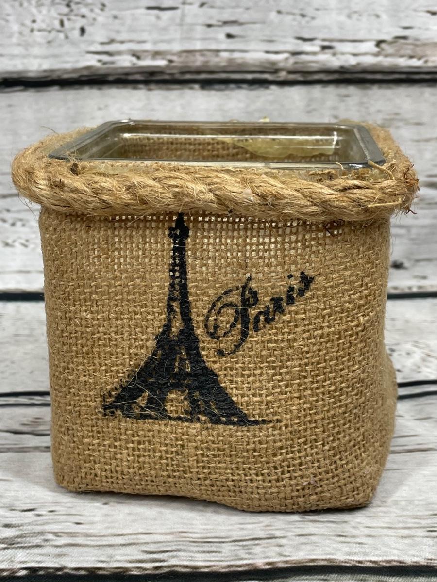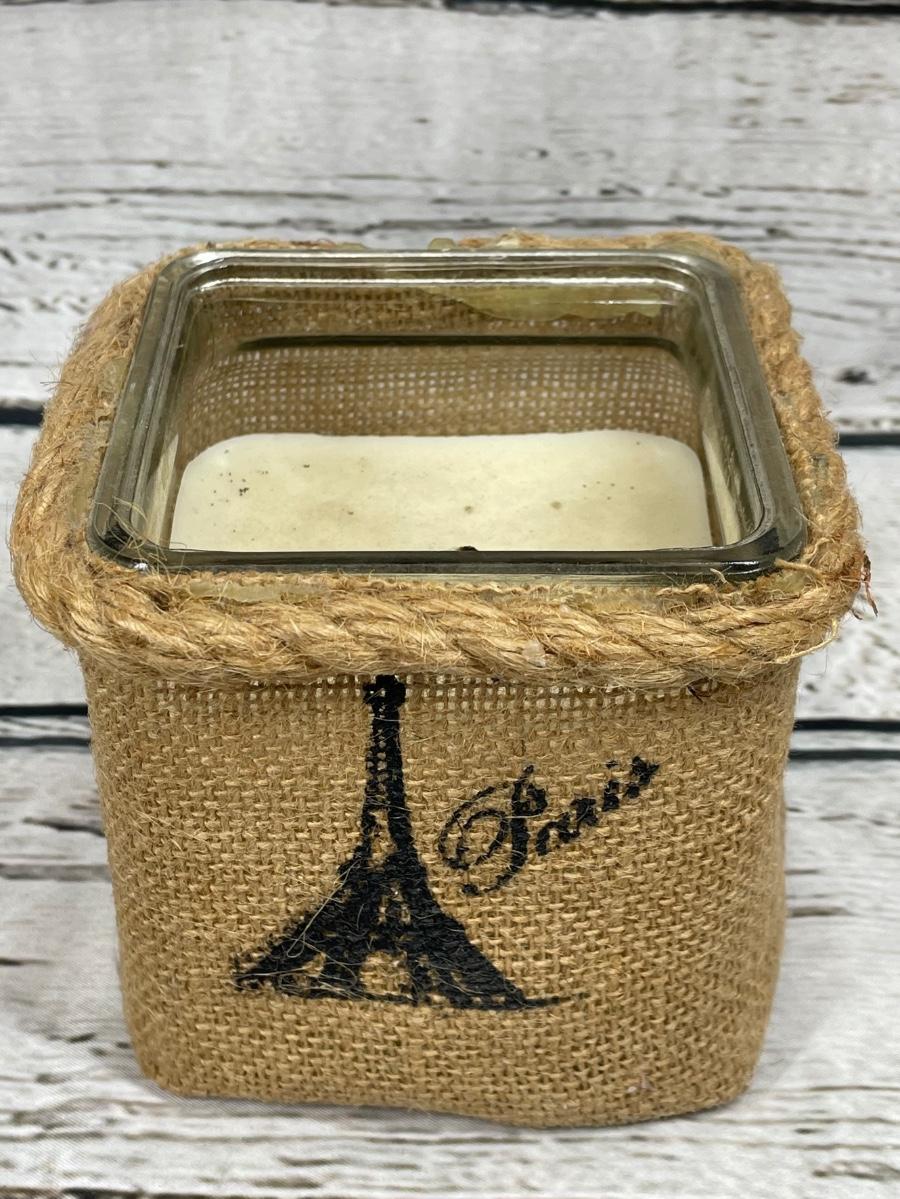 This item is in good condition. It has been used but there is still a lot of candle left to burn. The front has a picture of an Eiffel Tower and says “Paris” on it.