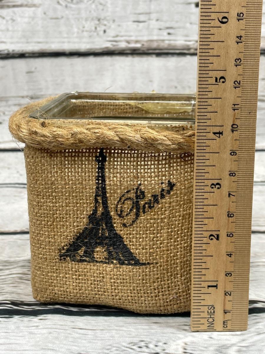 This item is in good condition. It has been used but there is still a lot of candle left to burn. The front has a picture of an Eiffel Tower and says “Paris” on it.
