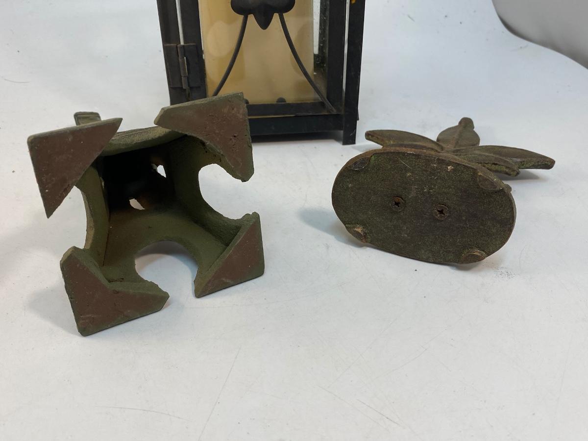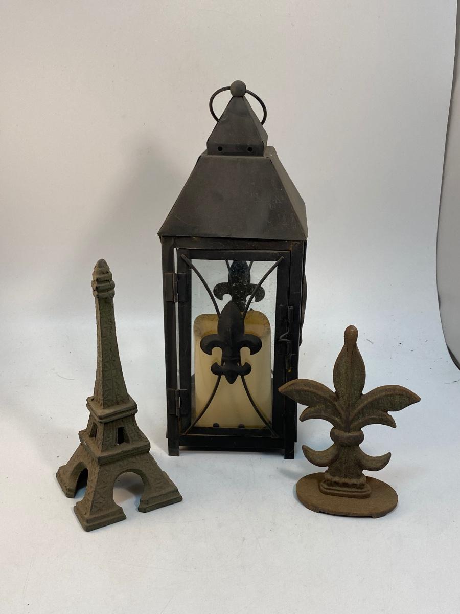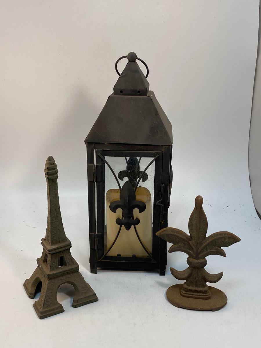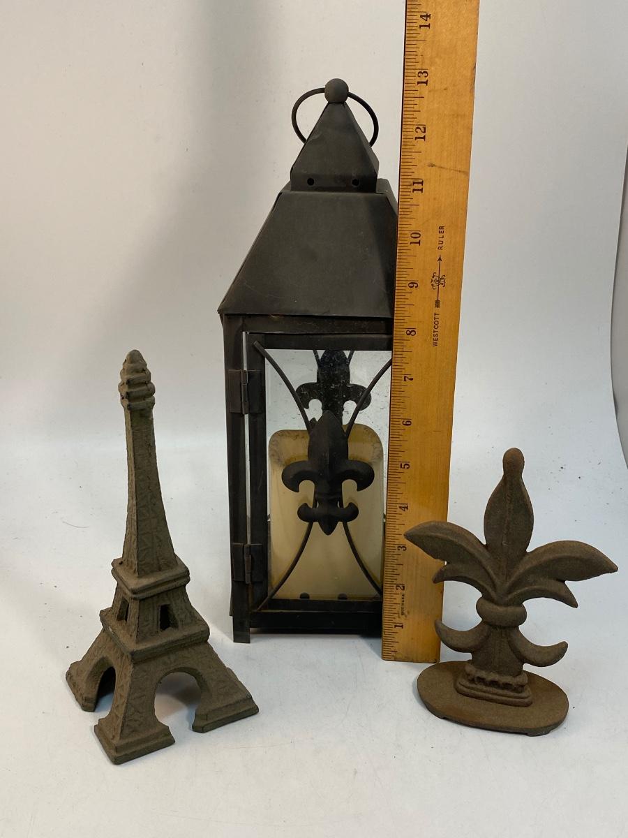 Paris Fleur de Lis Themed Cast Metal Door Stops Faux Candle Lantern Garden Yard Art. A little weathered from being outside. Metal pieces can be painted. Good inside or outside display.