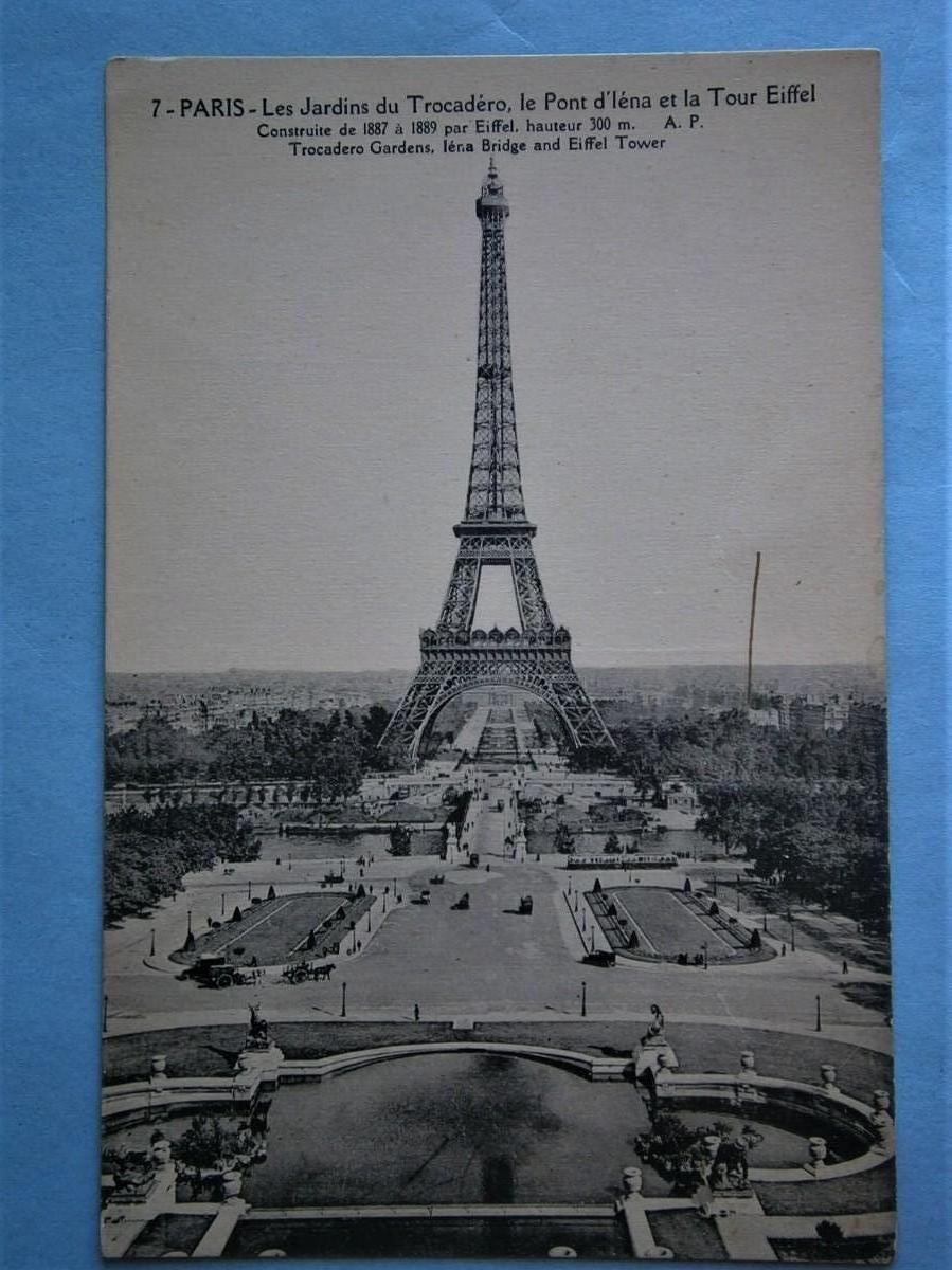Postcard of Paris France "Les Jardinsdu Trocadore ...La Tour Eiffel" from early 1900's, divided back, standard size, unposted.