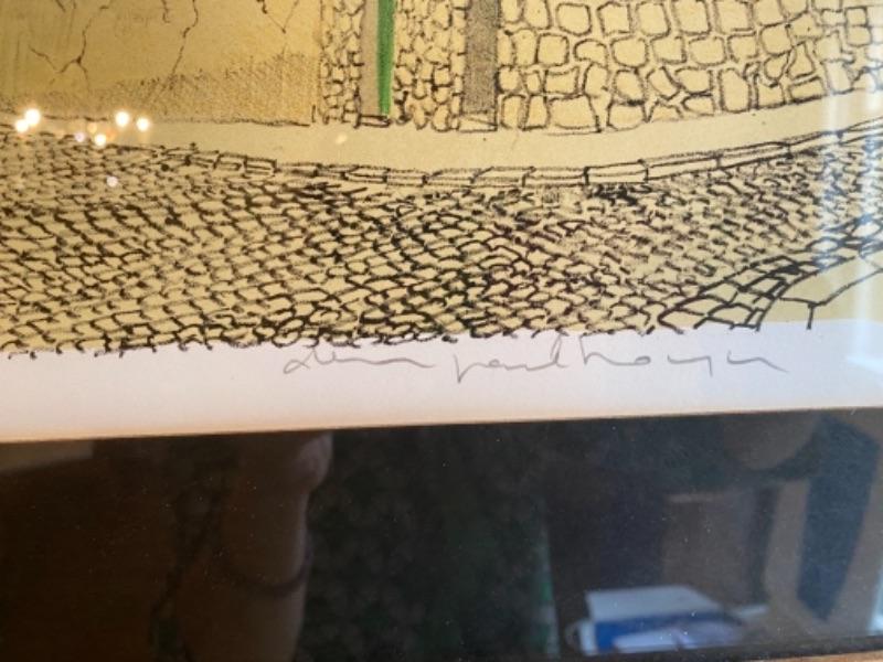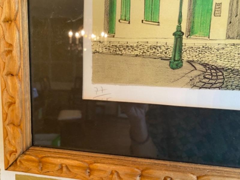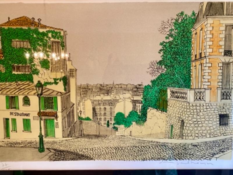 # 77/375 signed lithograph of gorgeous cobblestone street overlooking Paris by artist Denis Paul Noyer. Gorgeous greens and pale gold / yellow with carved French frame measuring 20 x 26. Certificate of authenticity .