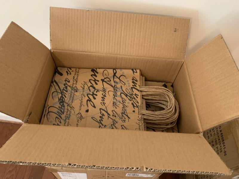 Brand new box of 100 "Paris Script" medium size paper shopping bags from the Store Supply Warehouse. Unopened box (picture is of Lot 1).