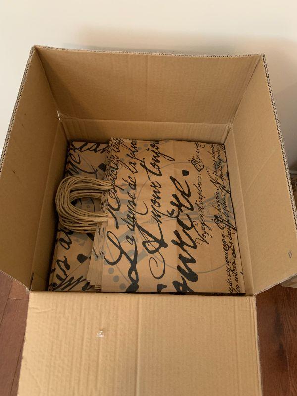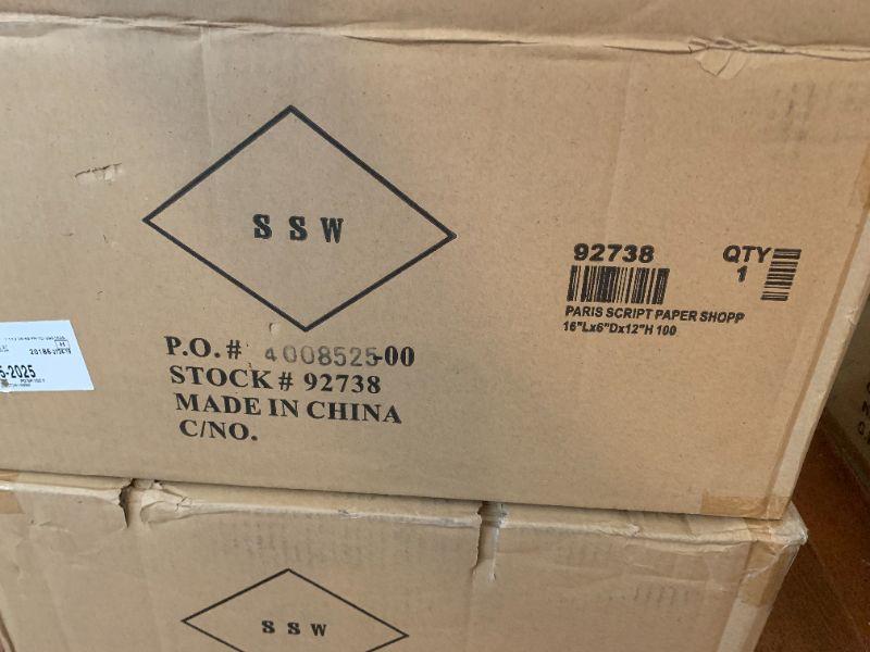 Brand new box of 100 "Paris Script" large size paper shopping bags from the Store Supply Warehouse. Box only opened for photo.