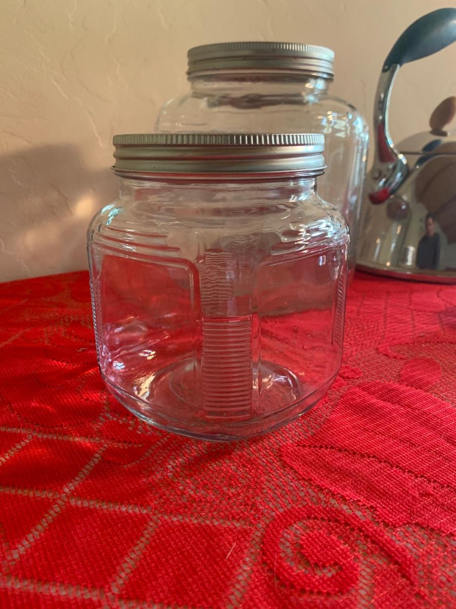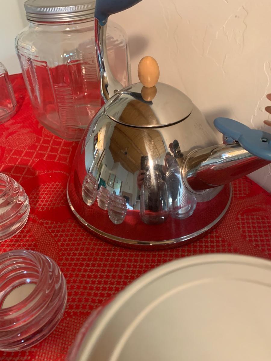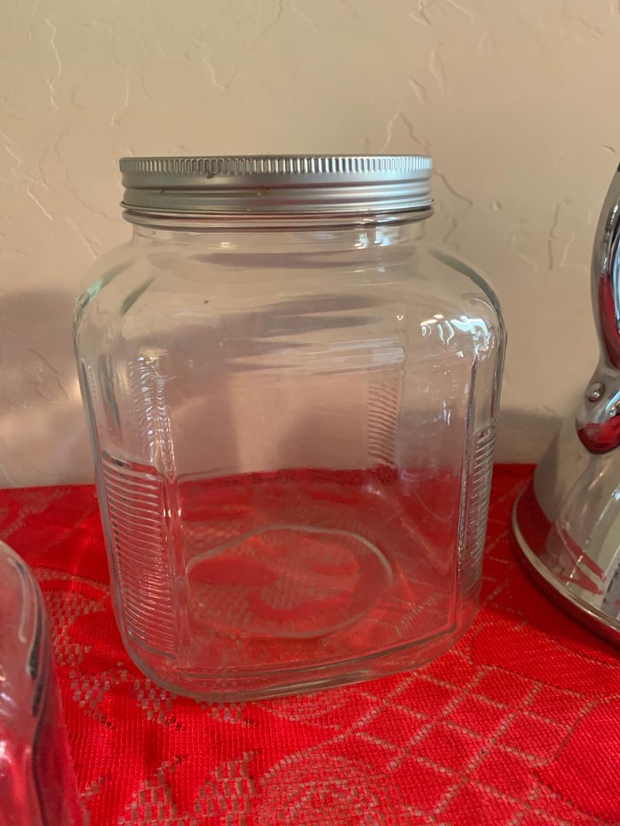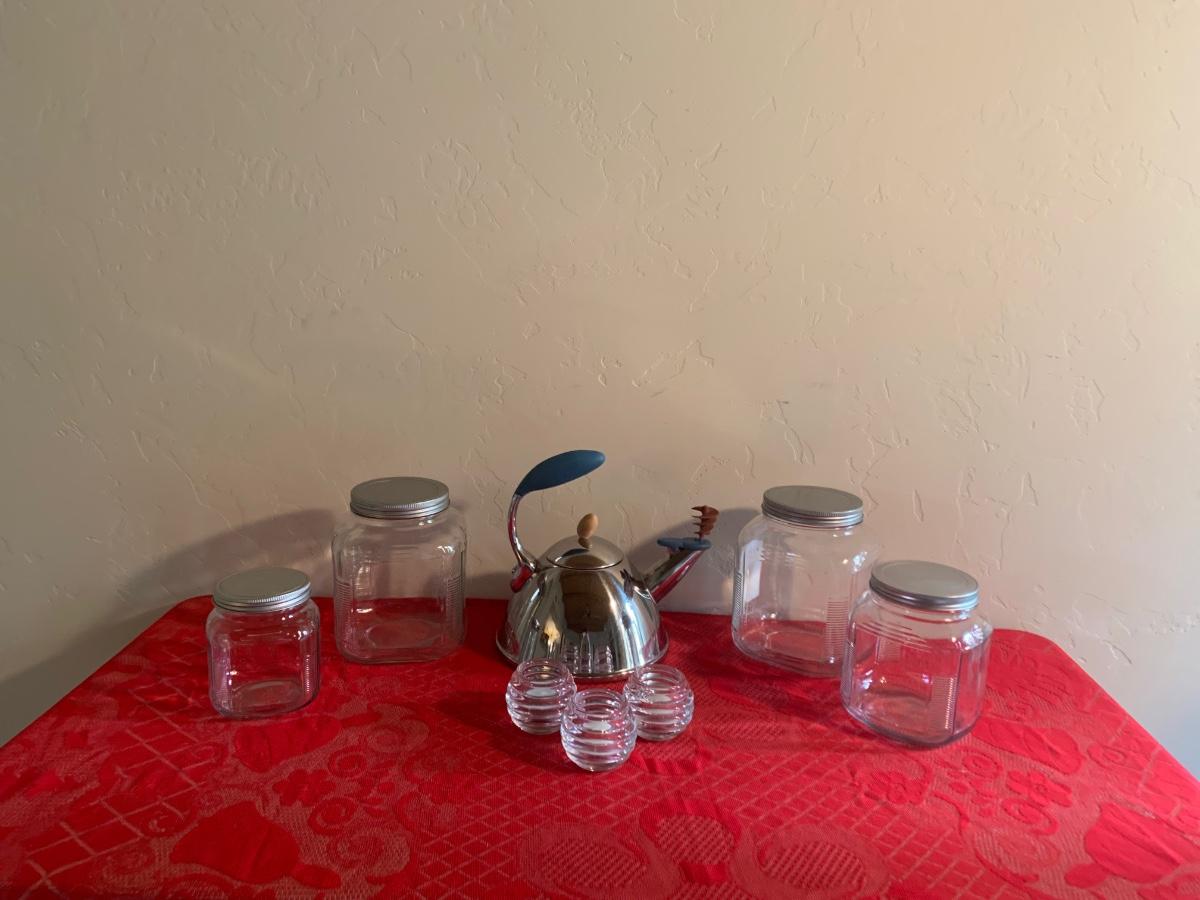 Lot includes a very nice chrome teapot, 4 glass pantry storage jars and 3 tea lights. Bigger jars are 8” tall, smaller are 5.5”.