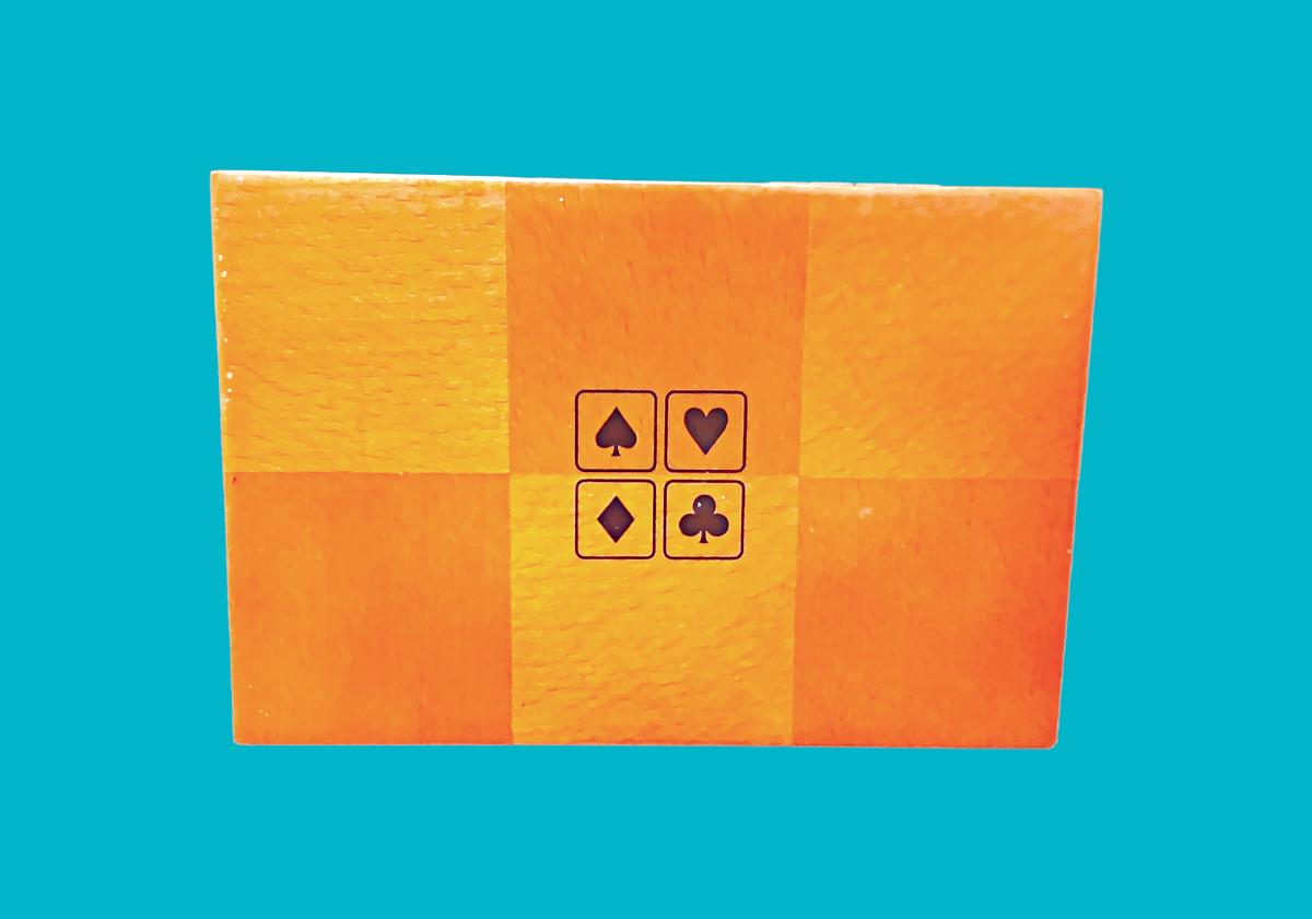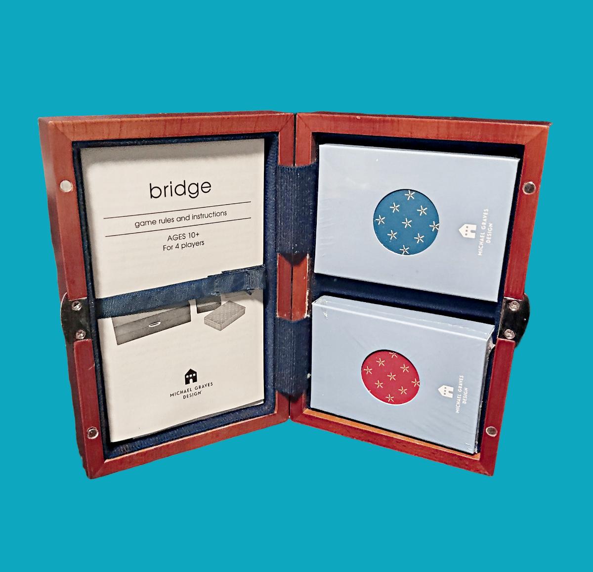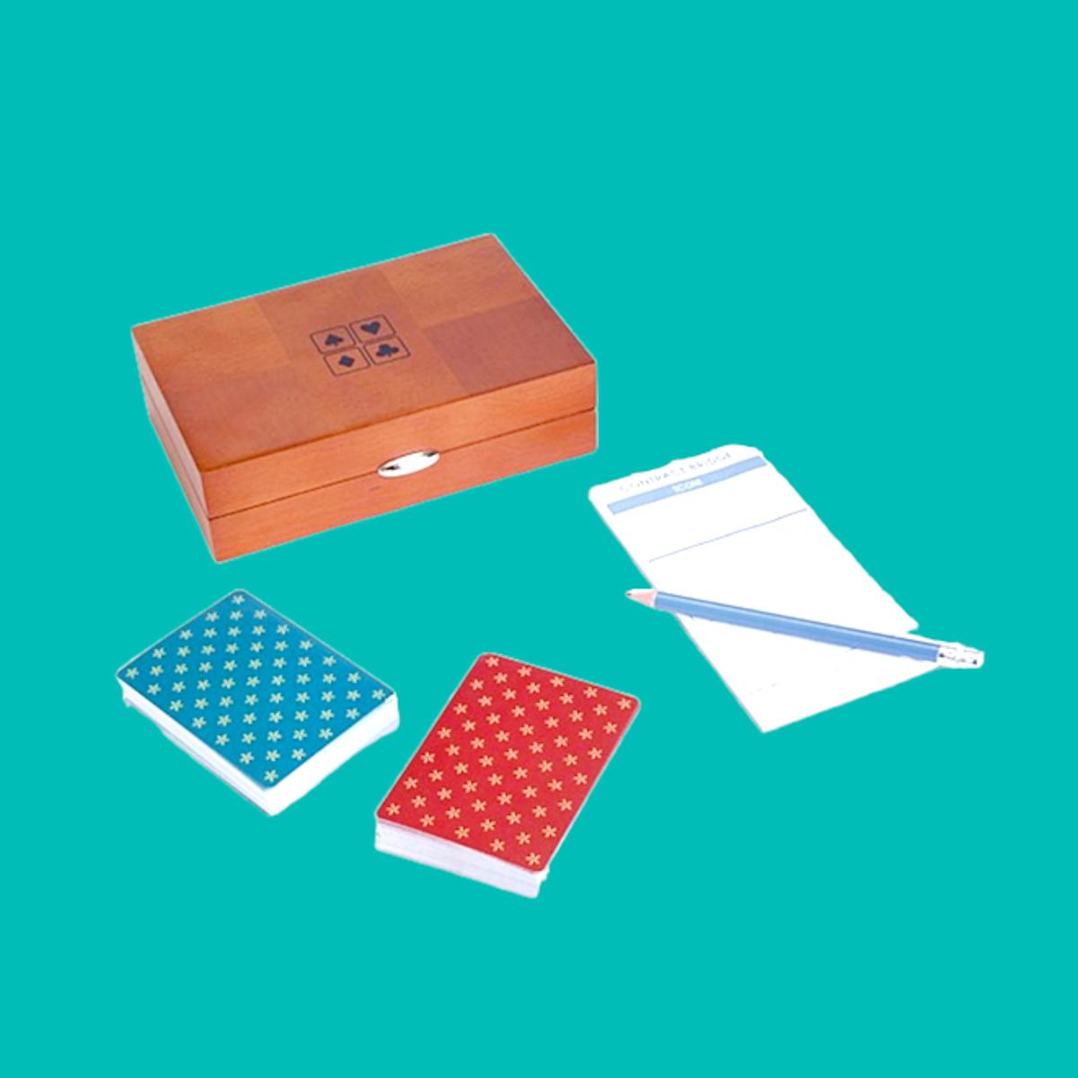 Cherry stained hardwood & veneer carrying case with magnetic closure contains uniquely designed playing cards, score sheets & pencil