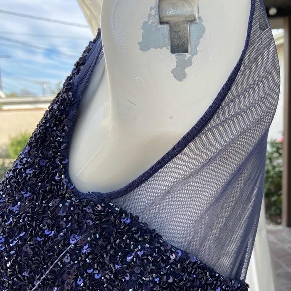 Parker Navy heavily beaded and sequined mini dress with mesh cut-outs. Great condition. No visible flaws. Gorgeous navy color. Super sexy! Fully lined in the sequin areas.. Approx Dimensions 36" long, 14" armpit to armpit.