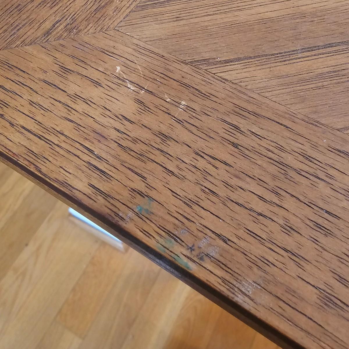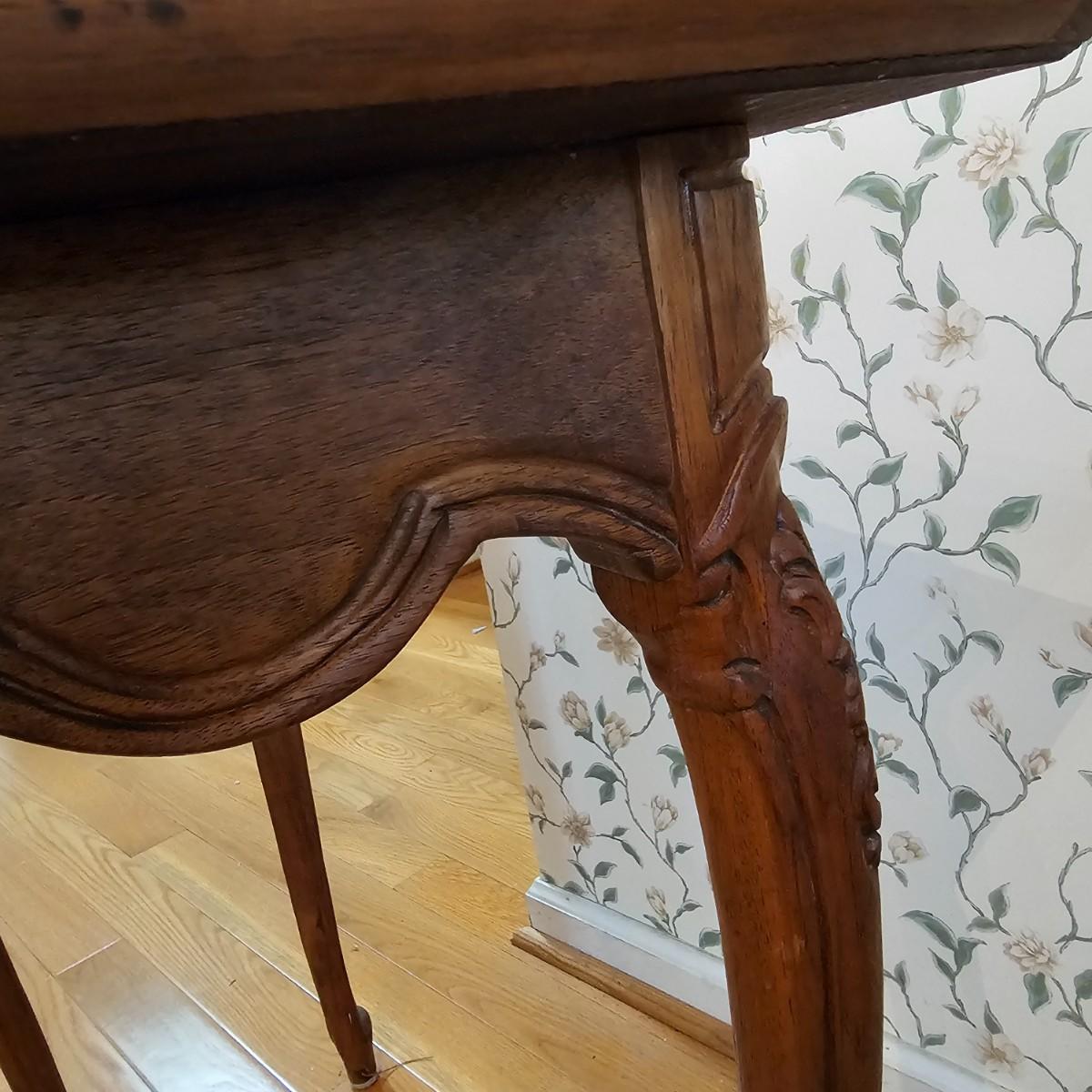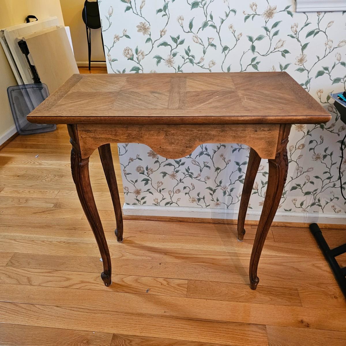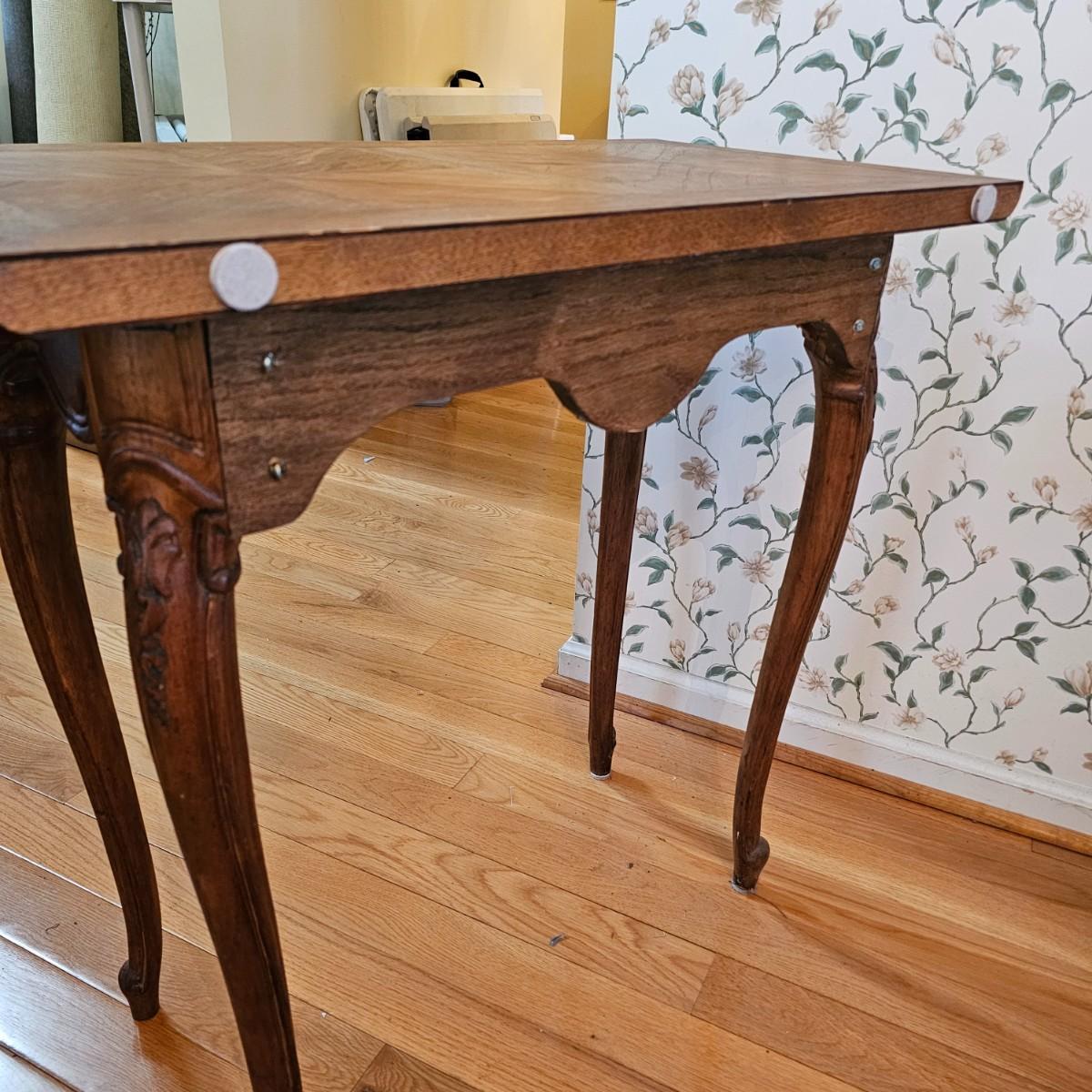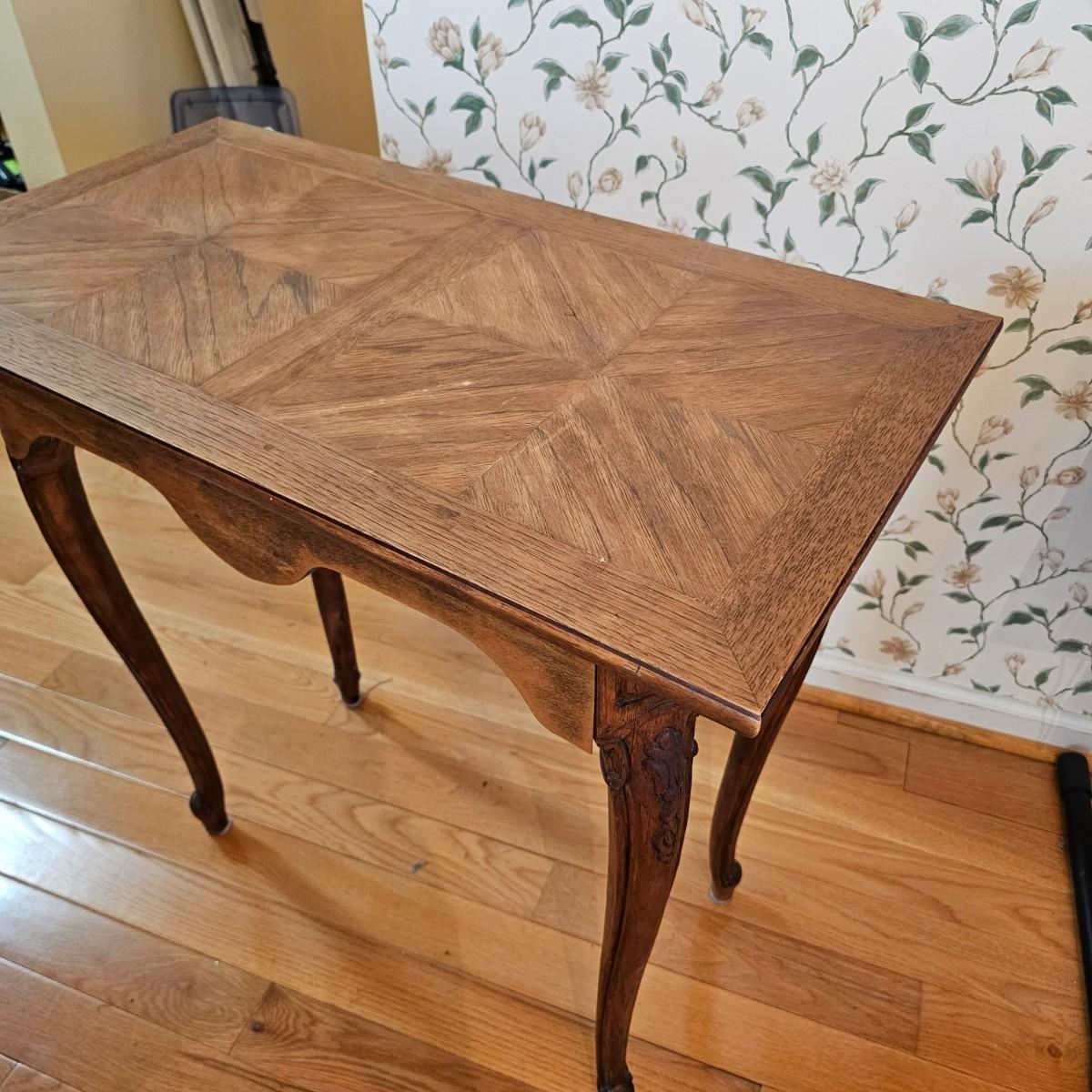 Slender side table with a parquet design pattered top and stylish carved legs. Table measures 16" x 30" x 30"H. Top and legs have minor blemishes, see photos for details. Local pickup only.