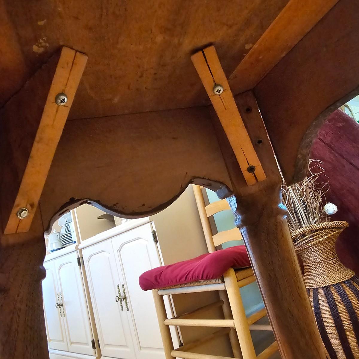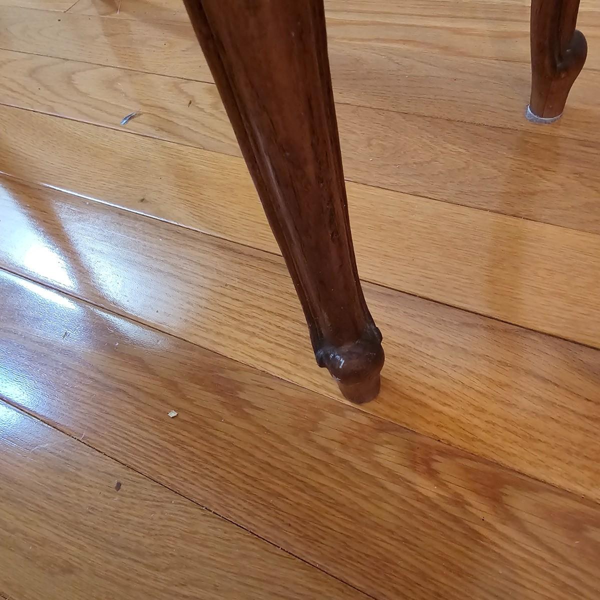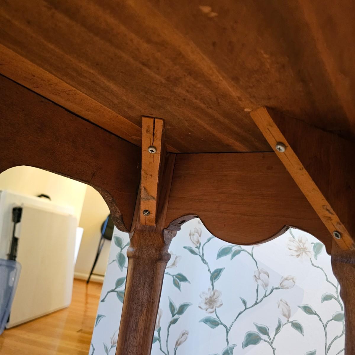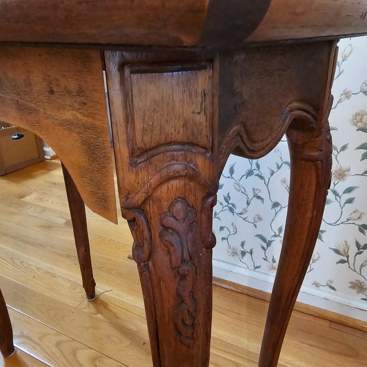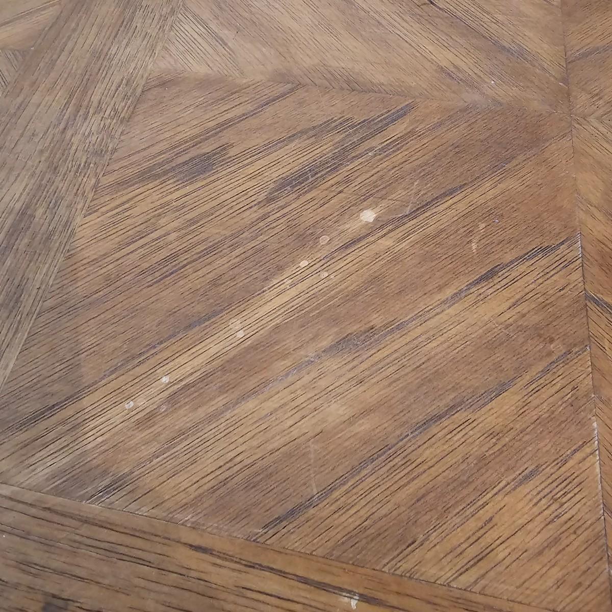Slender side table with a parquet design pattered top and stylish carved legs. Table measures 16" x 30" x 30"H. Top and legs have minor blemishes, see photos for details. Local pickup only.