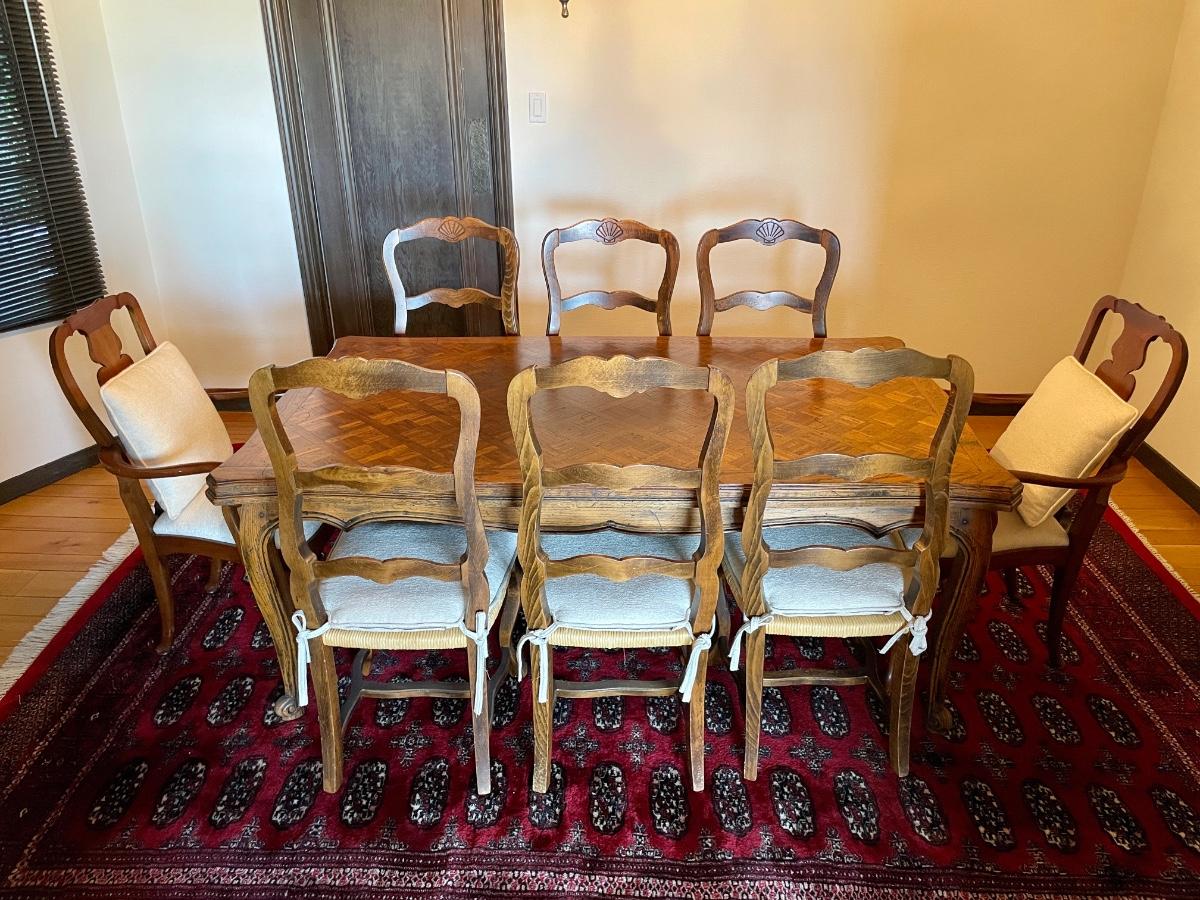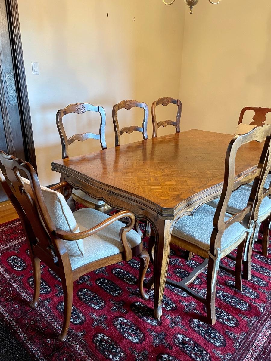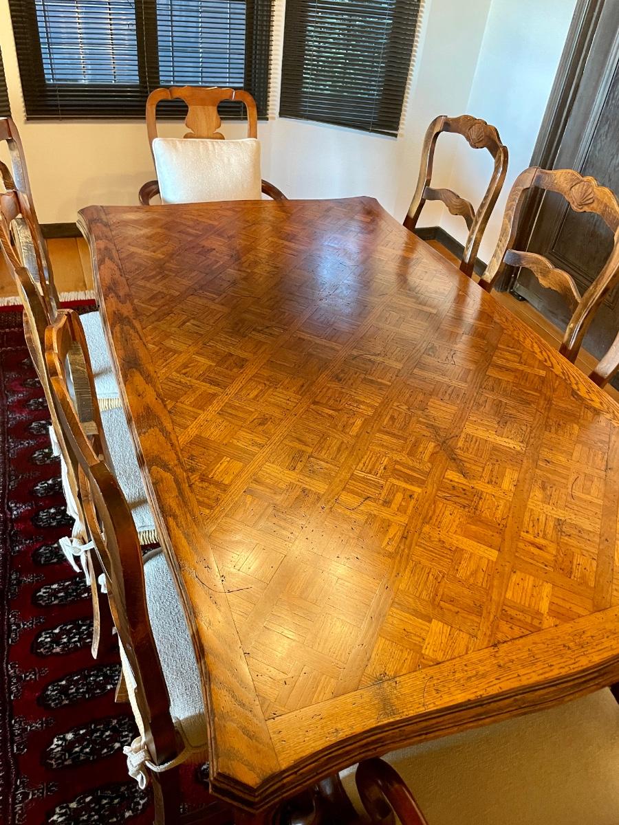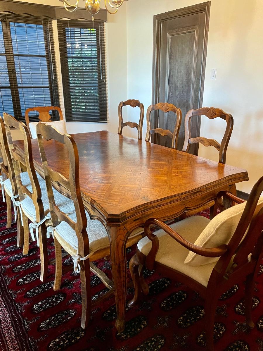 Dimensions: 41.5W x 72L x 29H Excellent condition Comes with eight dining chairs solid wood with scalllop carving and the back. Dimensions of chair: 39H x 20D x 23W
