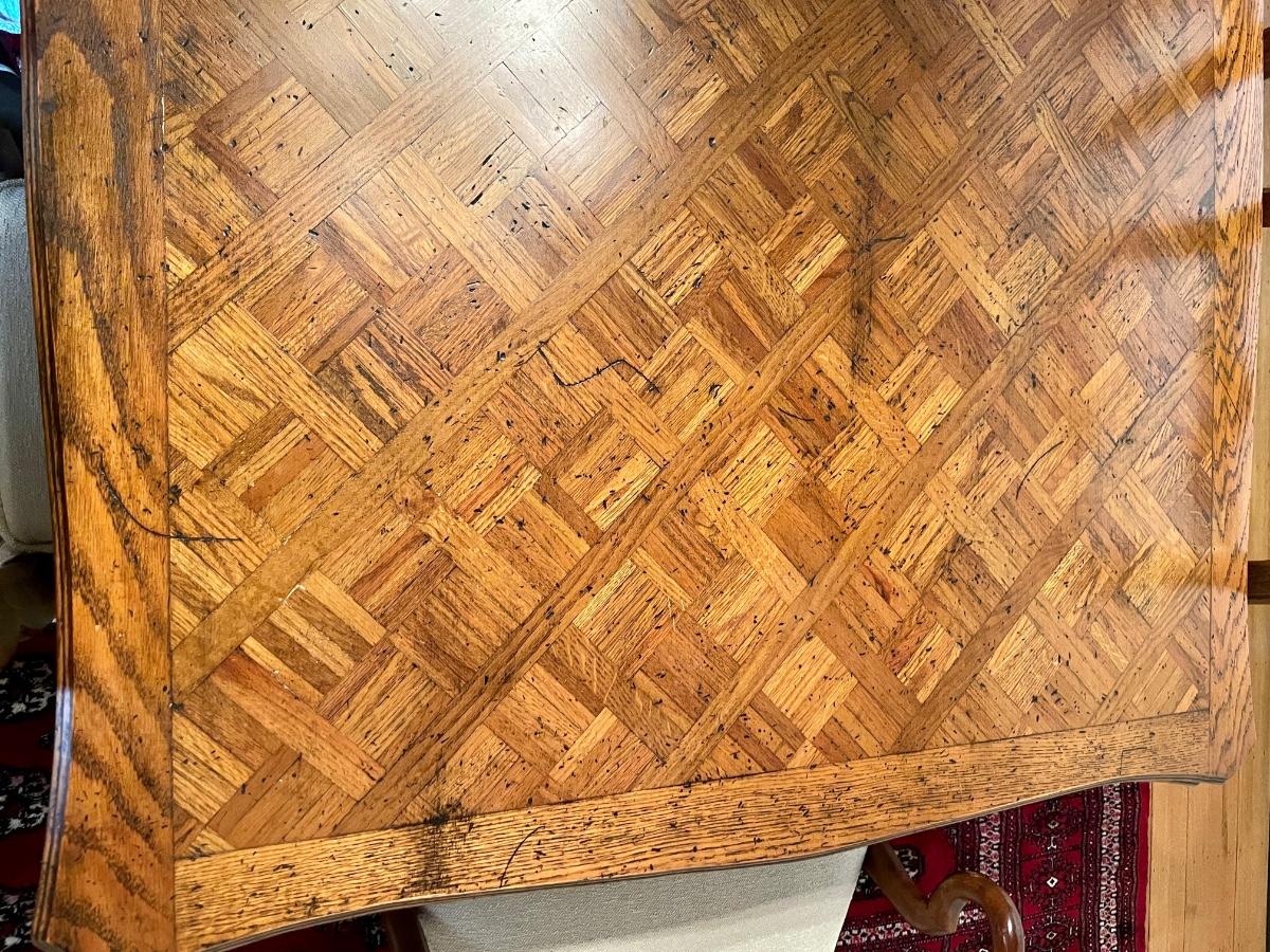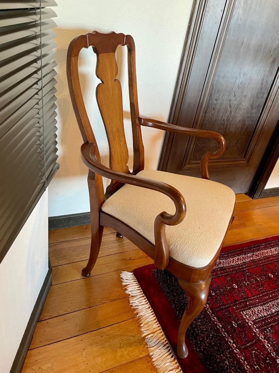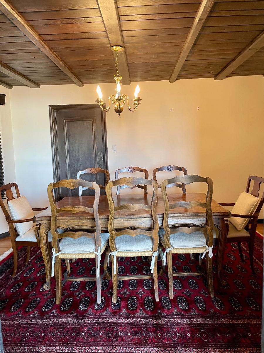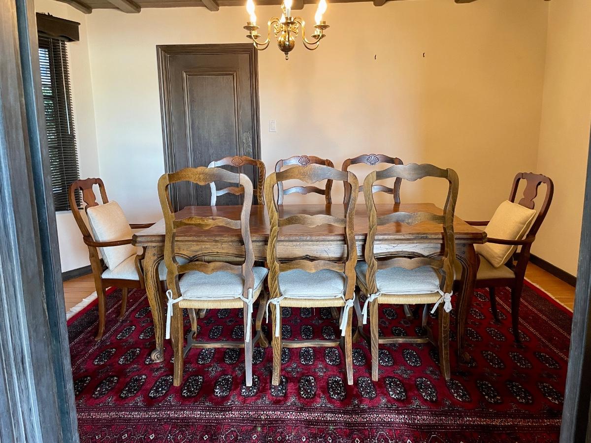 Dimensions: 41.5W x 72L x 29H Excellent condition Comes with eight dining chairs solid wood with scalllop carving and the back. Dimensions of chair: 39H x 20D x 23W