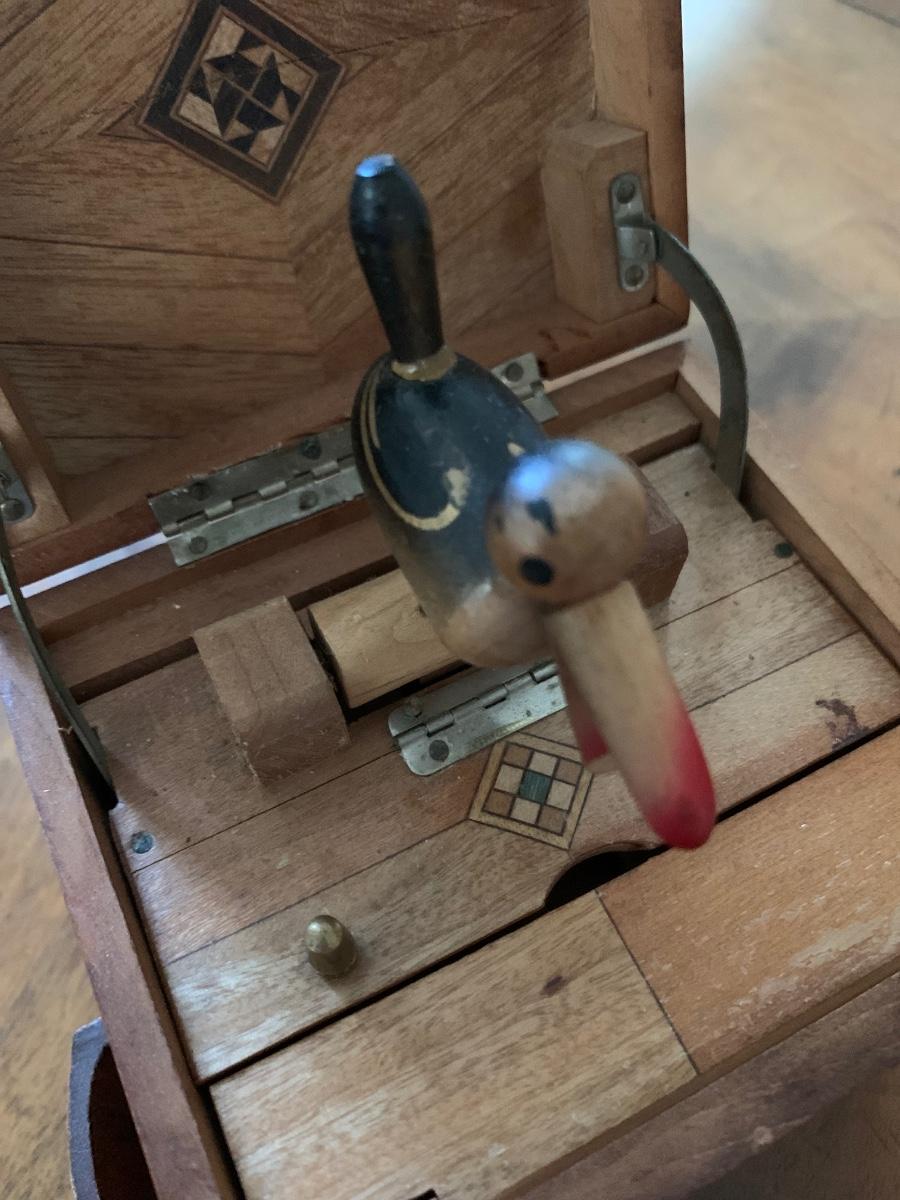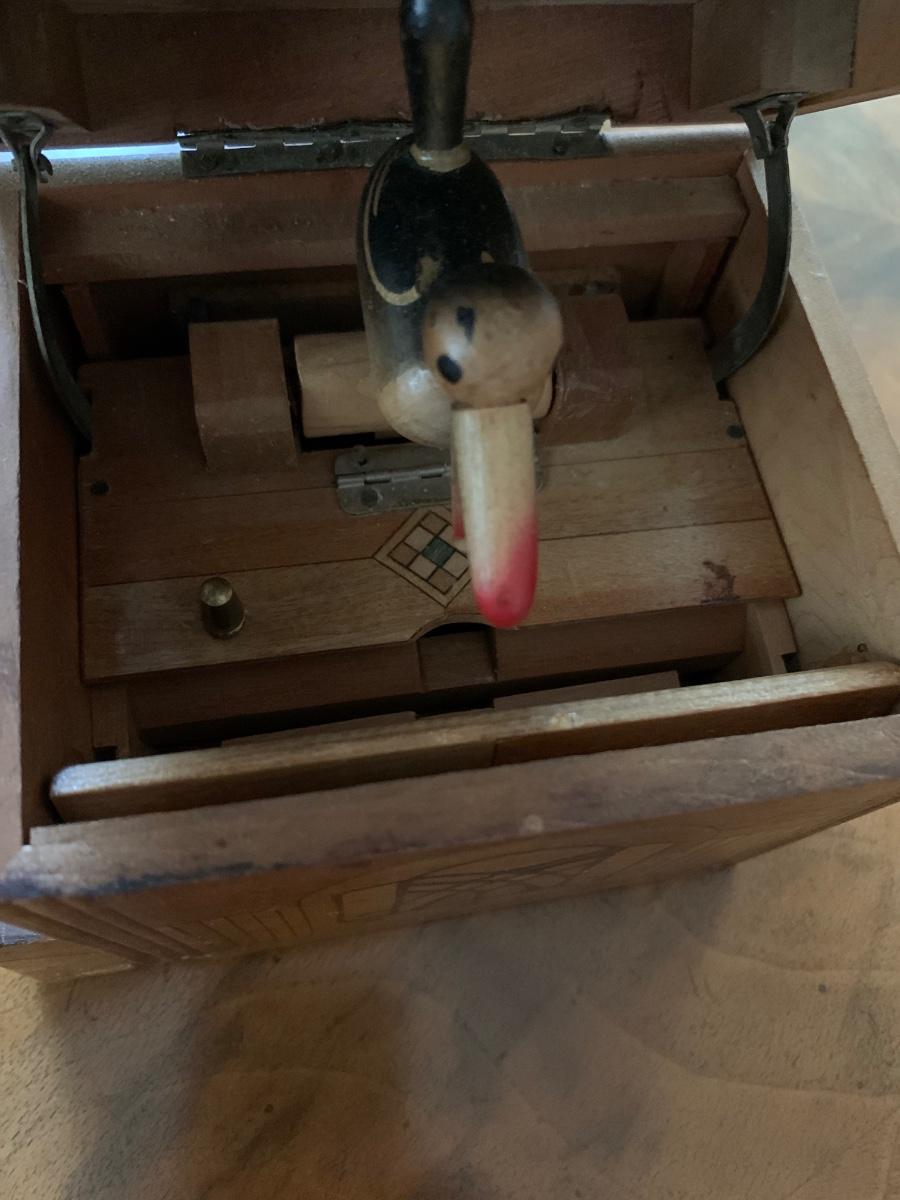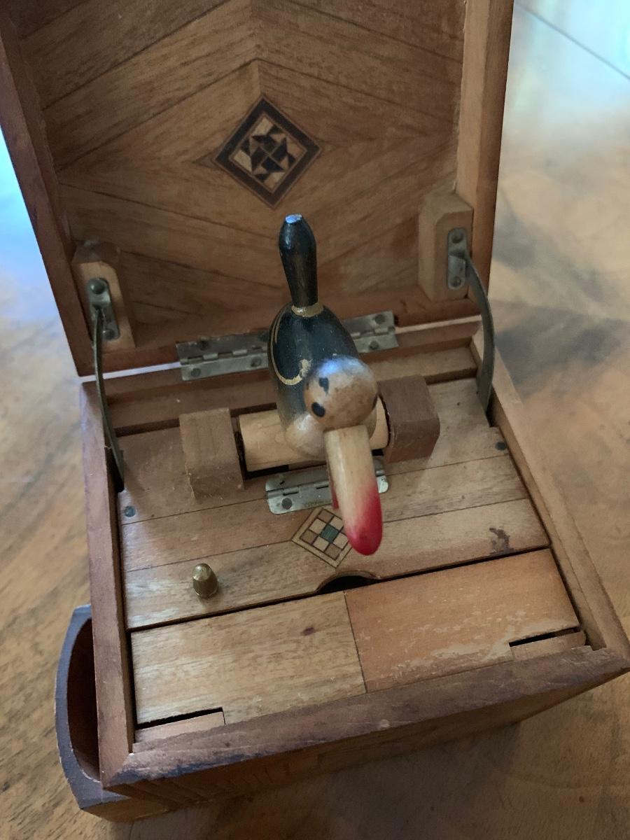 Beautiful box with a quirky function as you open the box the bird will deliver you a cigar or cigarette, fantastic wood engineering and very collectible